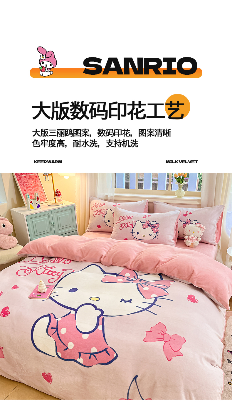 当前位置: 91家纺网 > 商品网购 > 床品套件 > 四件套 > 牛奶绒四件套 > 金爱家 2025新款正版三丽鸥授权大版卡通平网数码印花加厚高克重牛奶绒系列四件套-第一批 绒大版-R爱心蝴蝶kitty