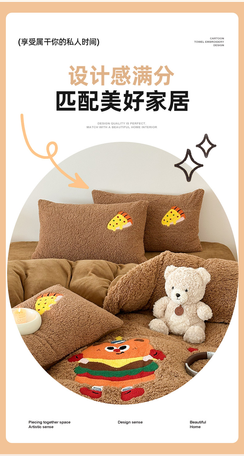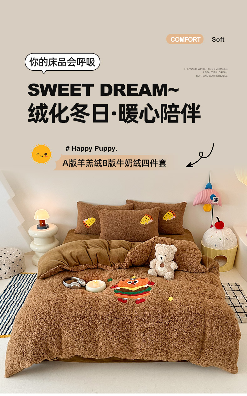 商品名称:乐坊 2025新款小阪羊羔绒牛奶绒卡通四件套冬季加厚保暖 汉堡-咖
