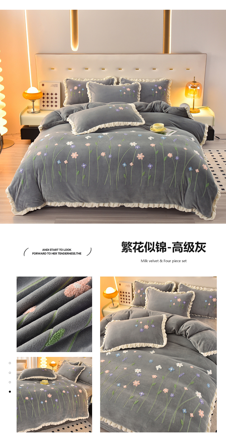 畅畅家纺 2025新款A类亲肤舒适高克重牛奶绒绣花系列冬季四件套-繁花似锦 繁花似锦-高级灰