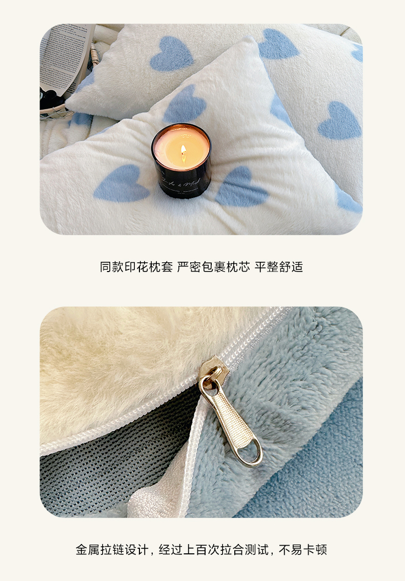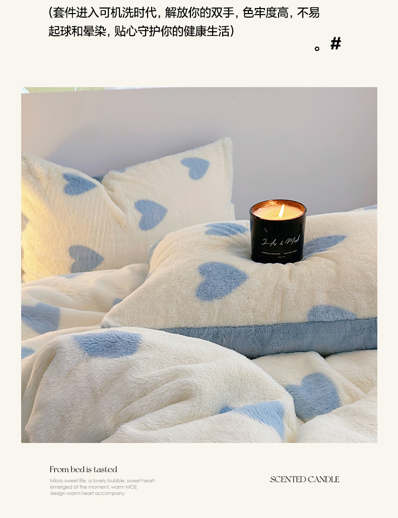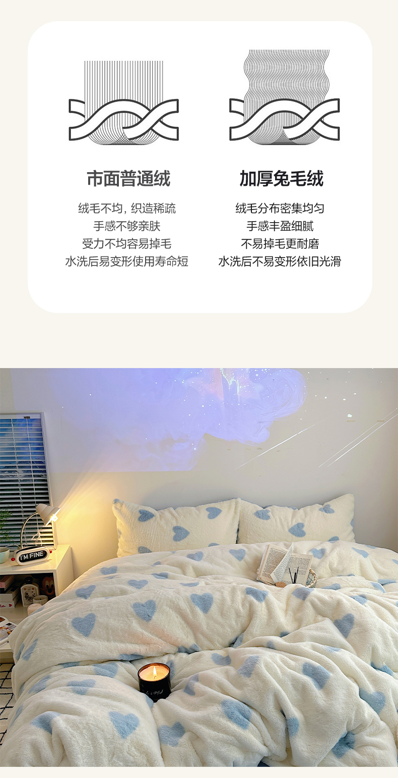 商品名称:雅居纺家纺 2025新款高克重兔绒印花四件套-爱心 爱心-蓝