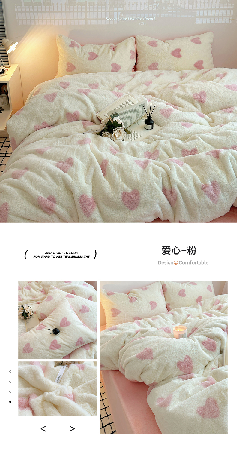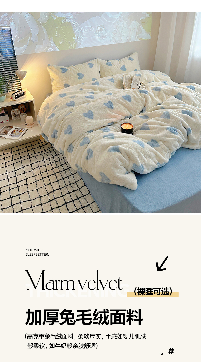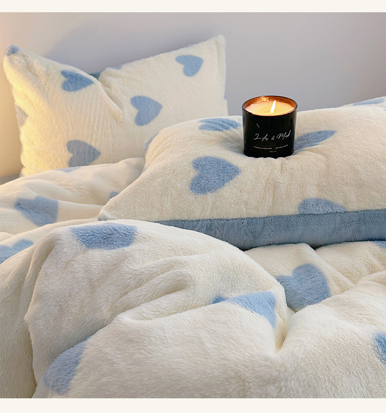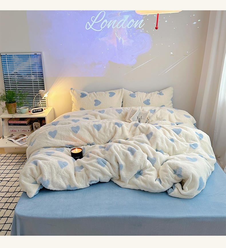 雅居纺家纺 2025新款高克重兔绒印花四件套-爱心 爱心-蓝