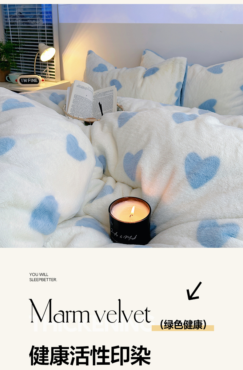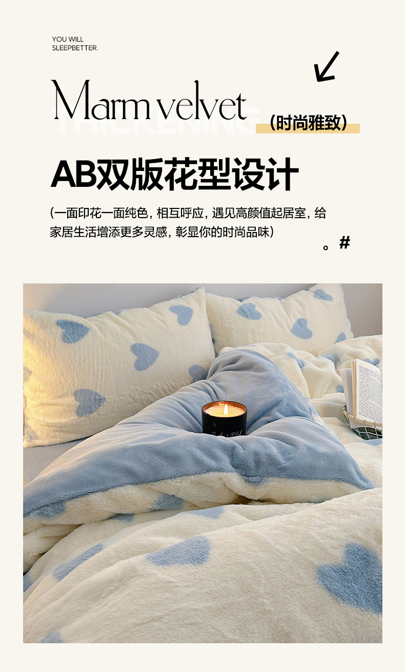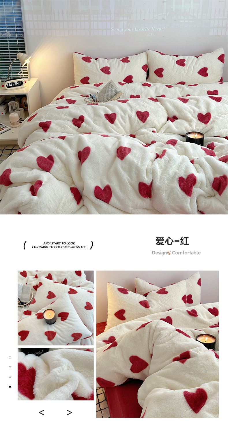 雅居纺家纺 2025新款高克重兔绒印花四件套-爱心 爱心-蓝