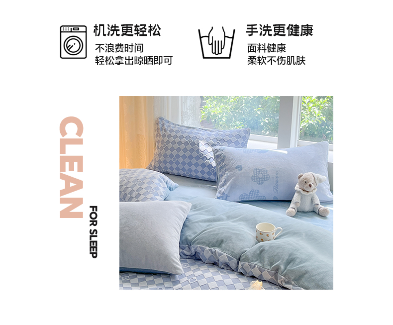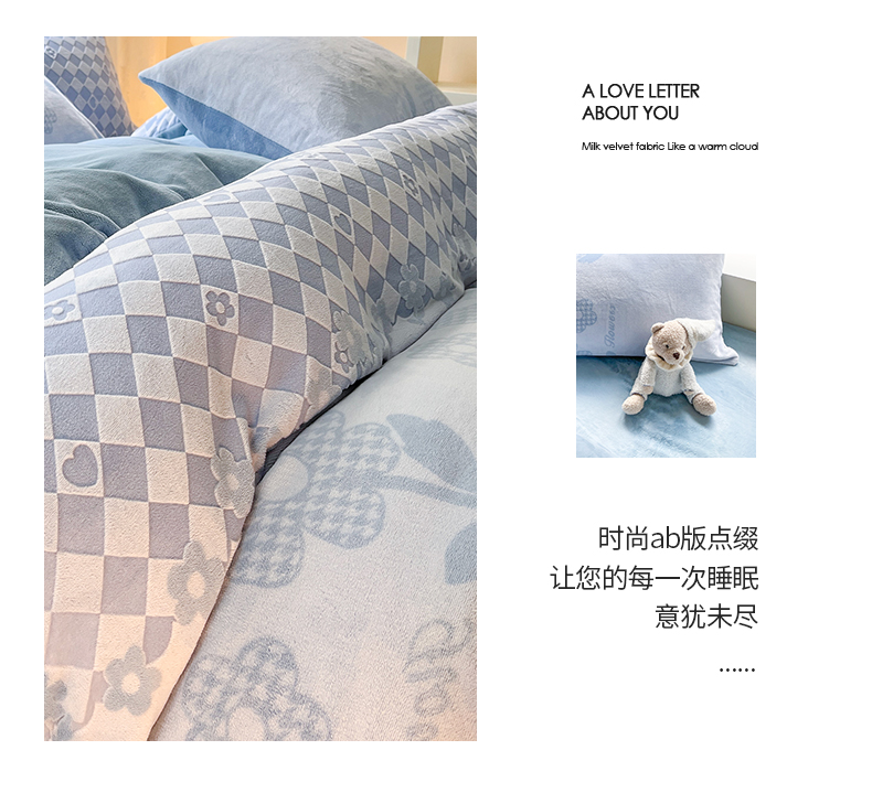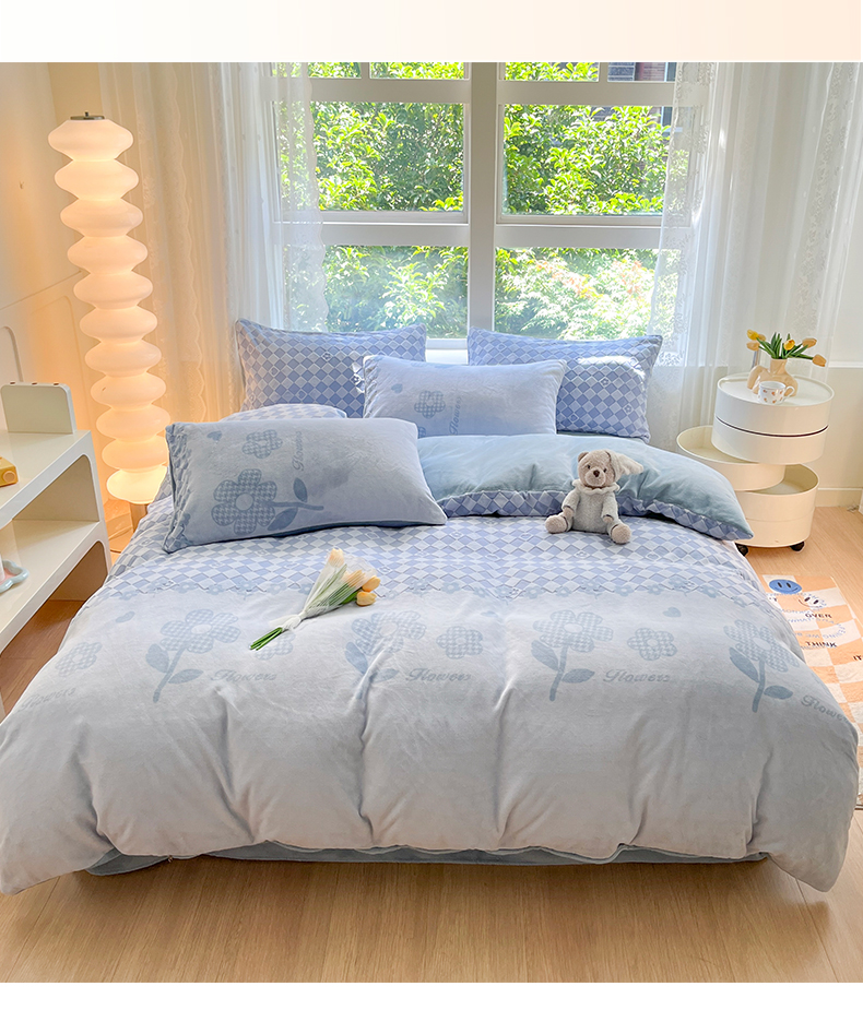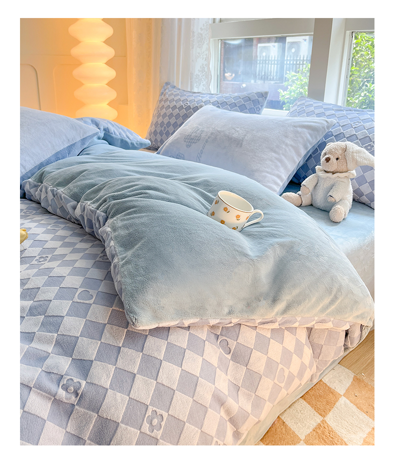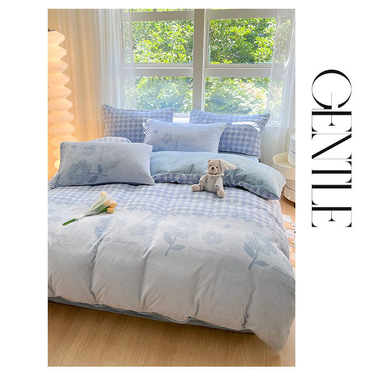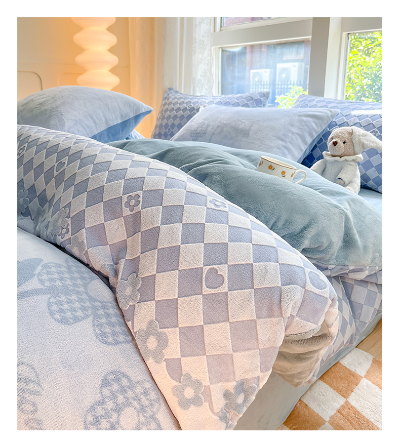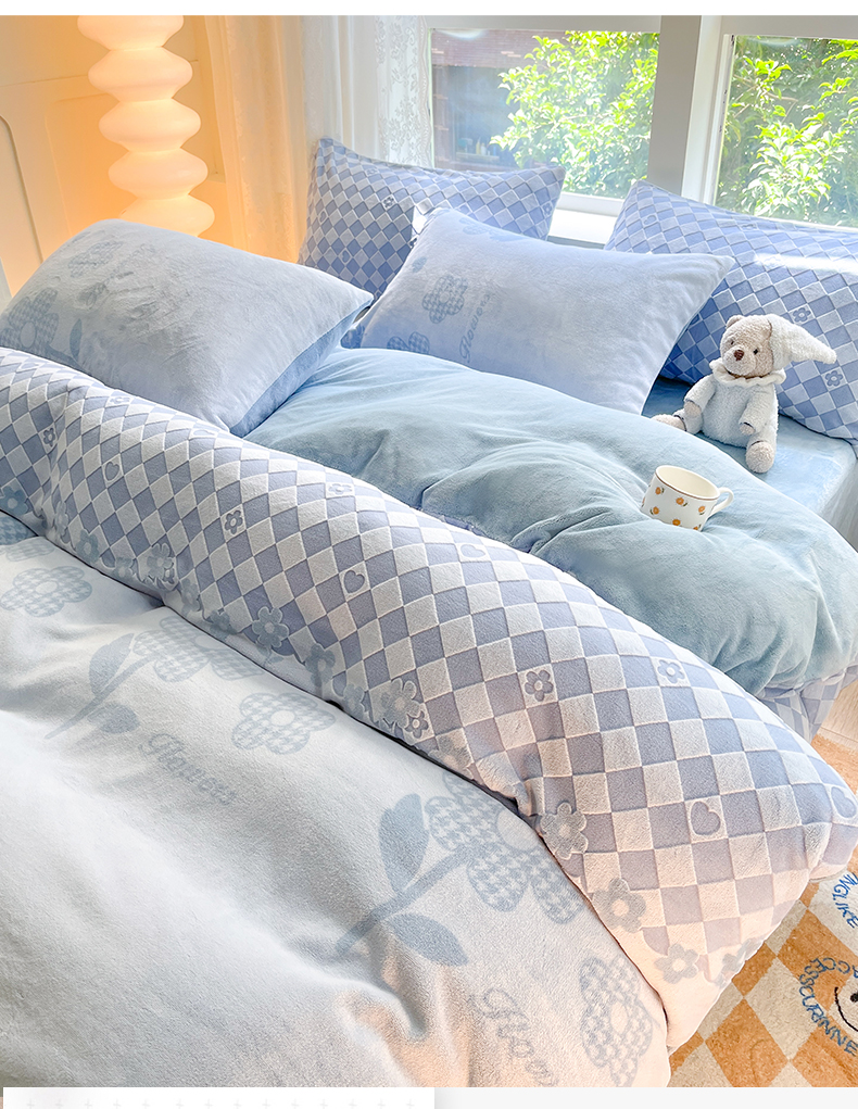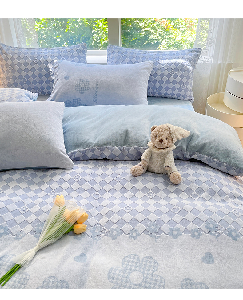 商品名称:雅居纺家纺 2025新款立体雕花牛奶绒四件套-幸运花系列 幸运花-蓝