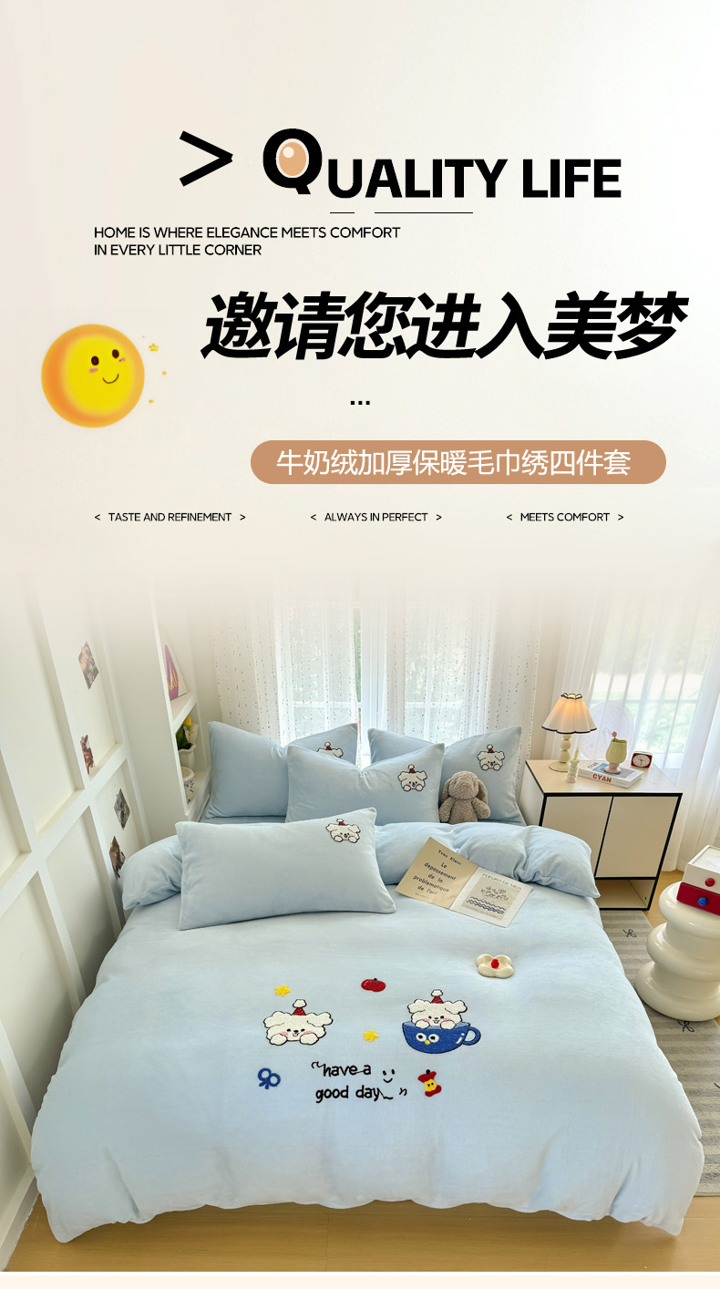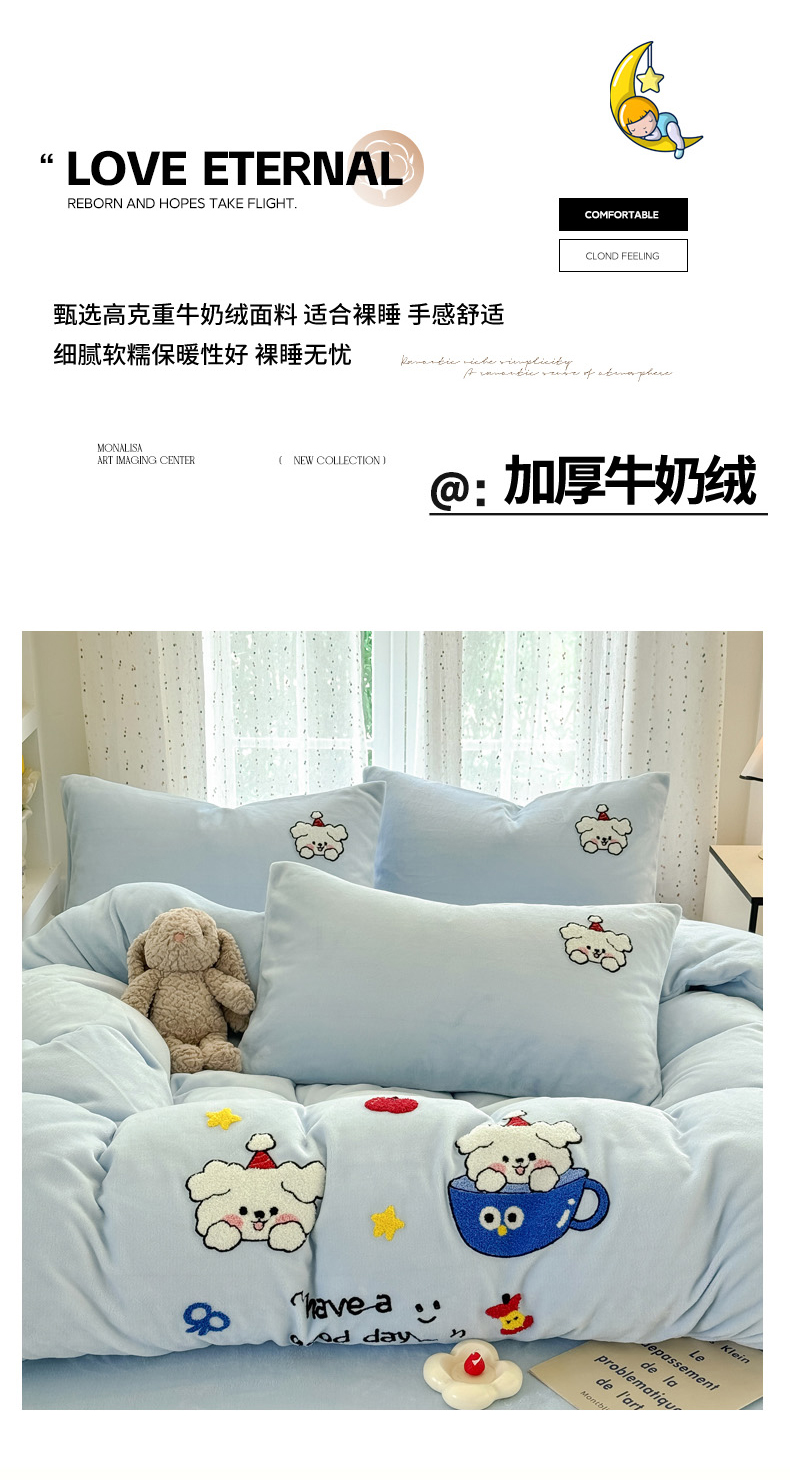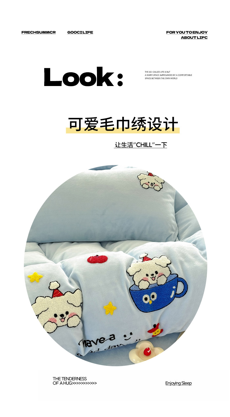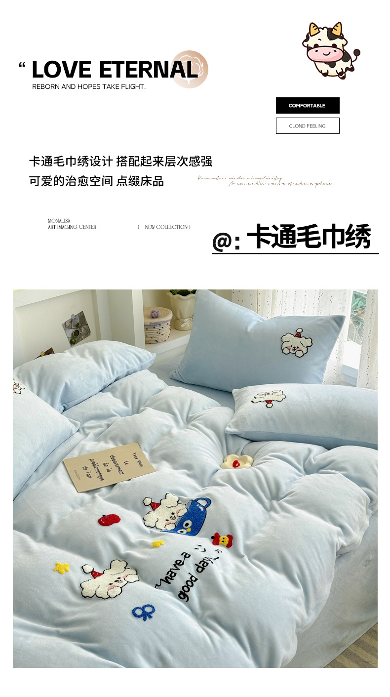 商品名称:恋佳居 2025新款卡通毛巾绣牛奶绒绣花四件套 萌趣