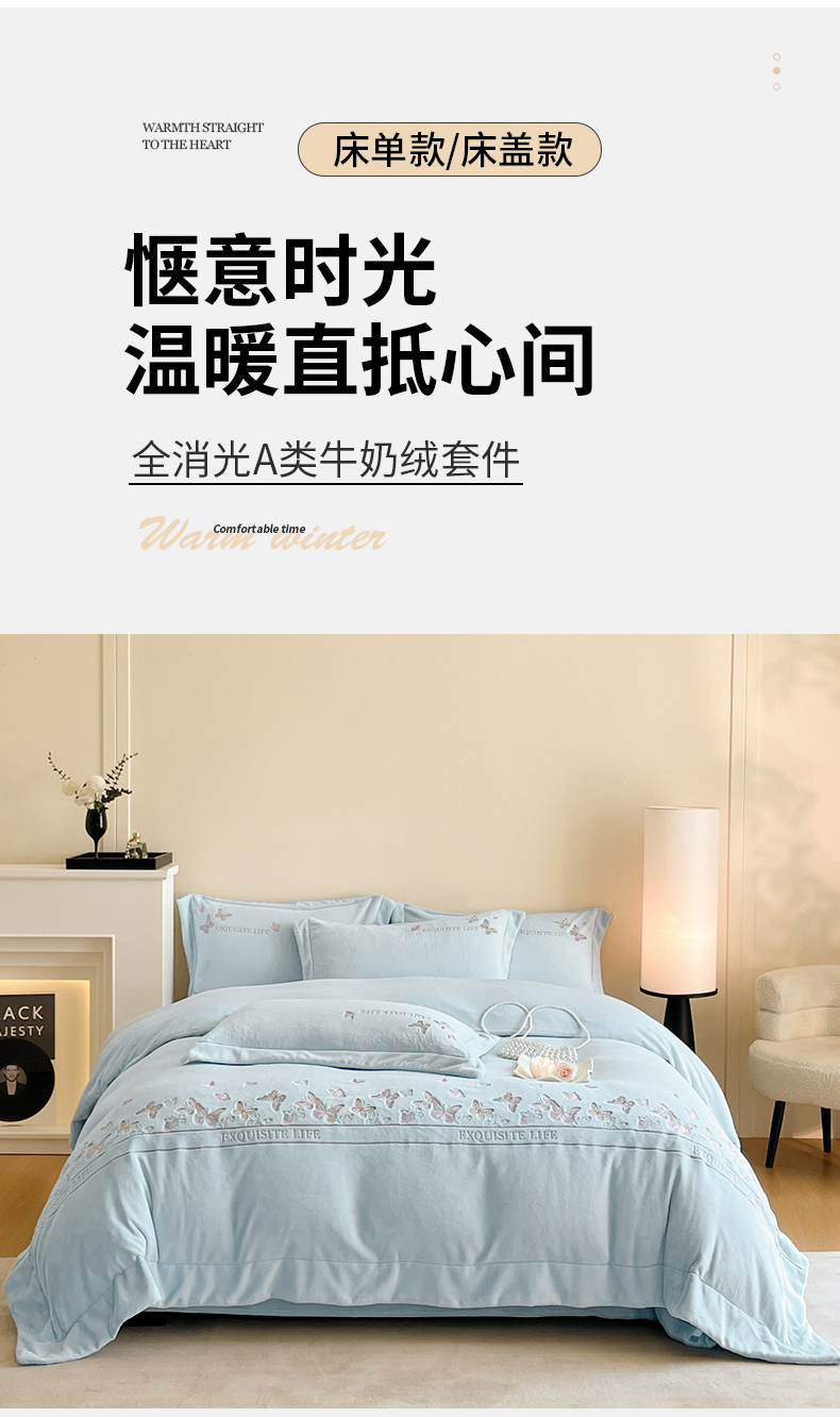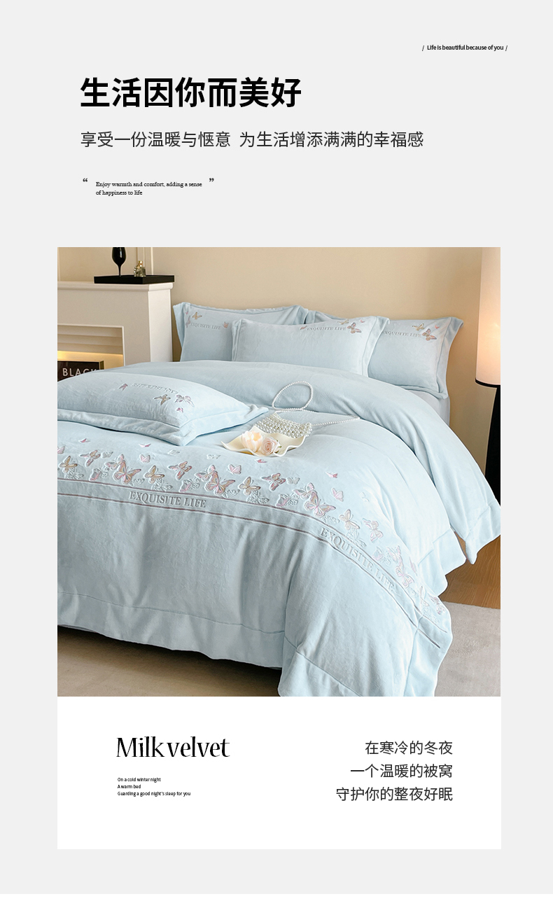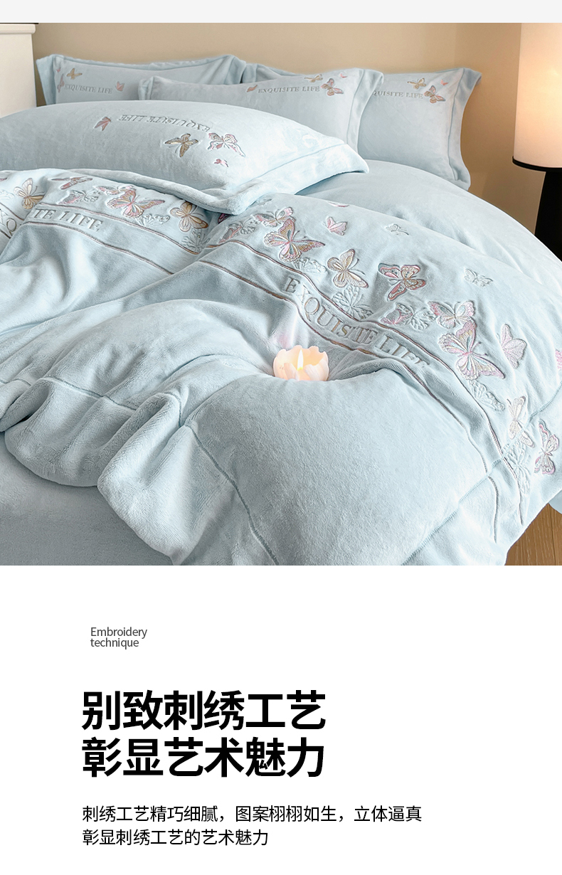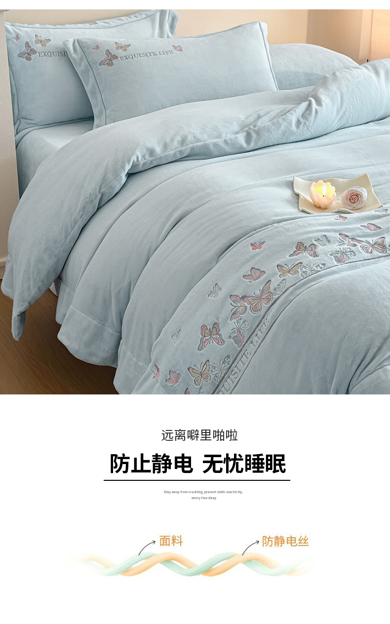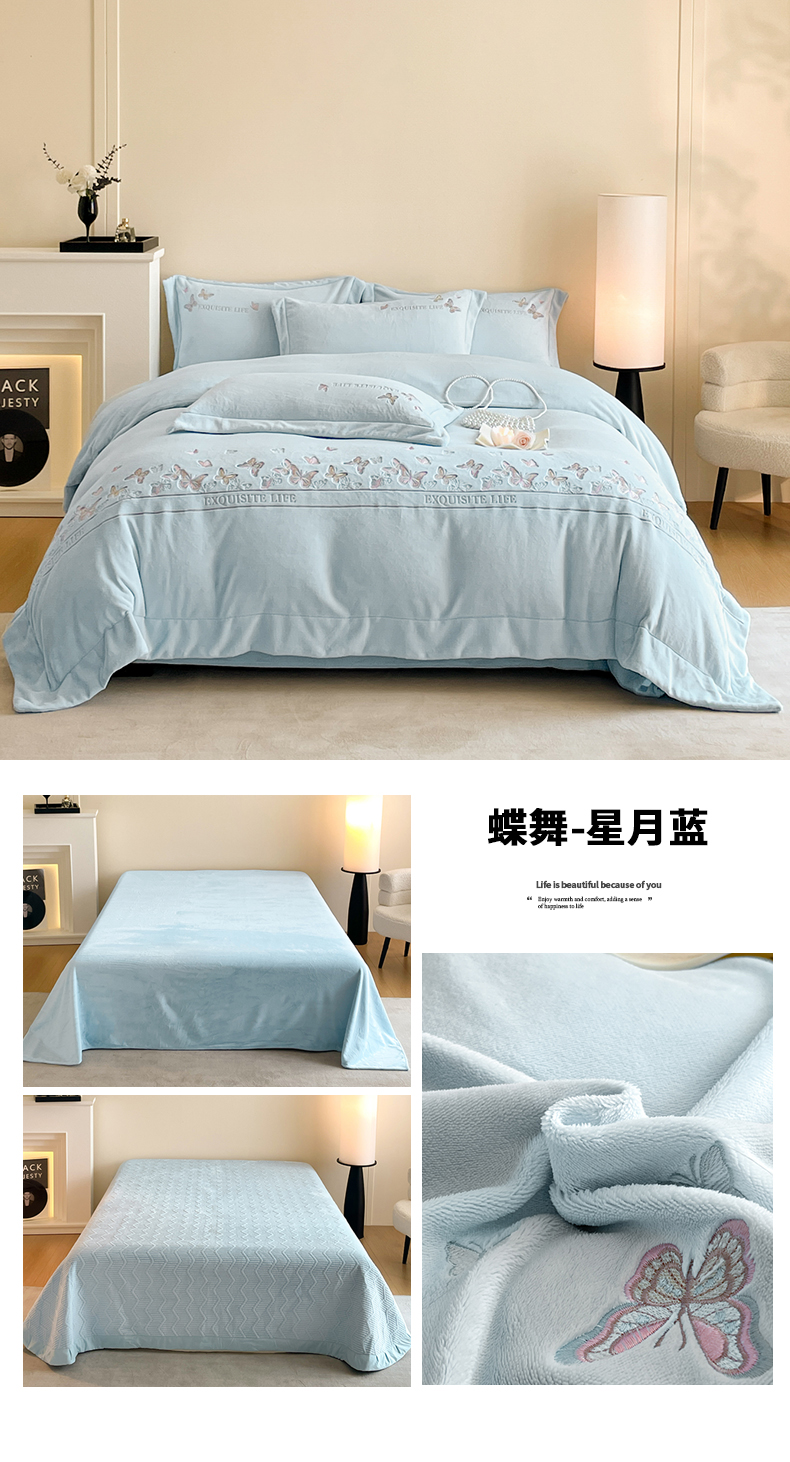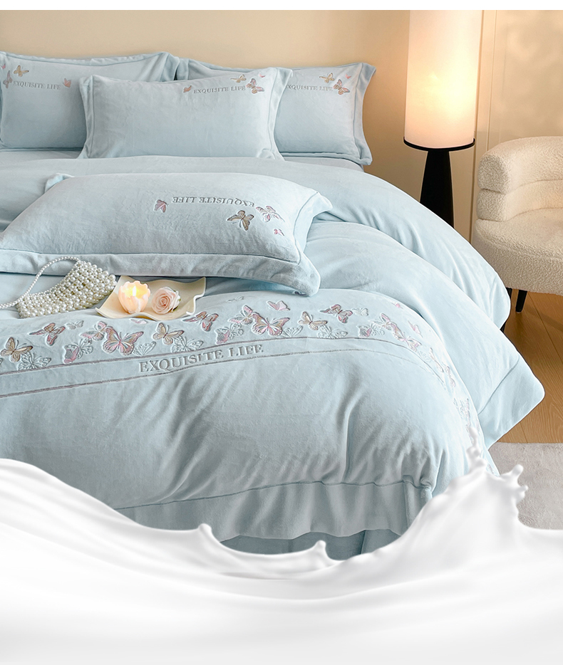 当前位置: 91家纺网 > 商品网购 > 床品套件 > 四件套 > 牛奶绒四件套 > 新方向 2025新款高克重240克A类全消光刺绣牛奶绒四件套-蝶舞 蝶舞-星月蓝