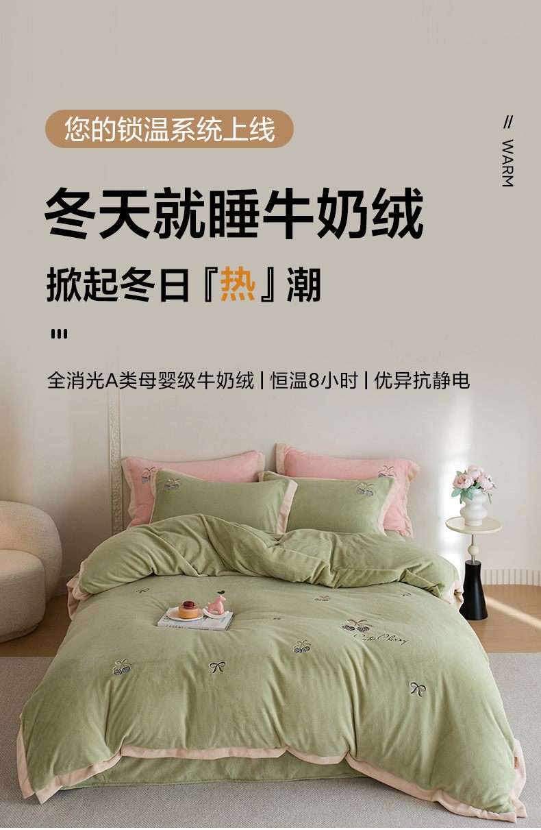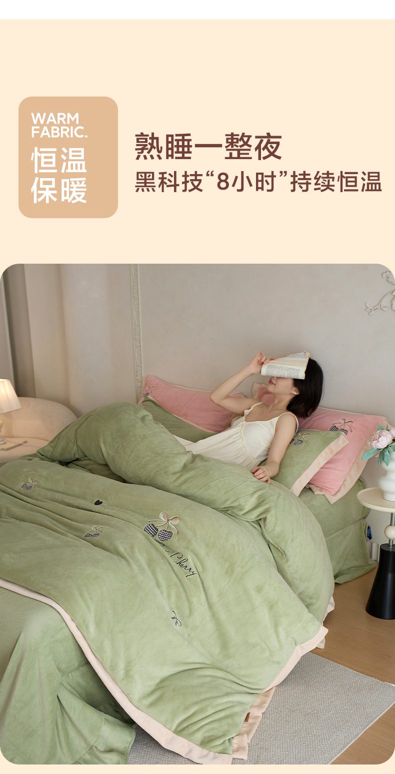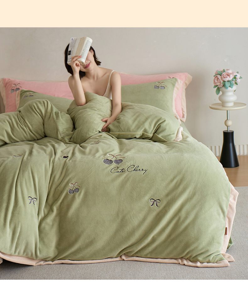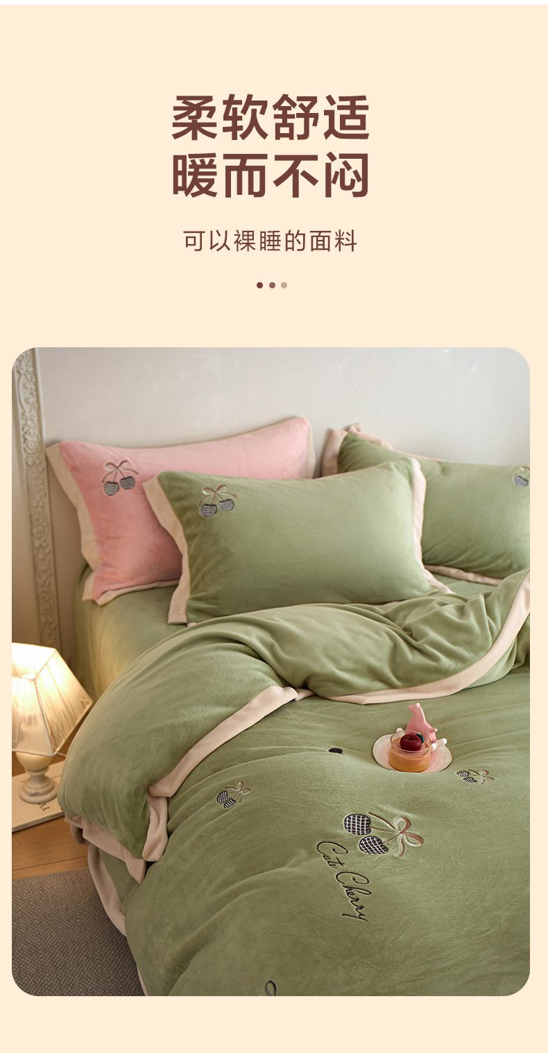 (总)卡初家居(原微来) 2025新款秋冬亲肤牛奶绒绣花四件套-多喜系列,多喜-豆沙,多喜-果绿,多喜-米黄,多喜-浅紫,多喜-桃粉,多喜-天蓝