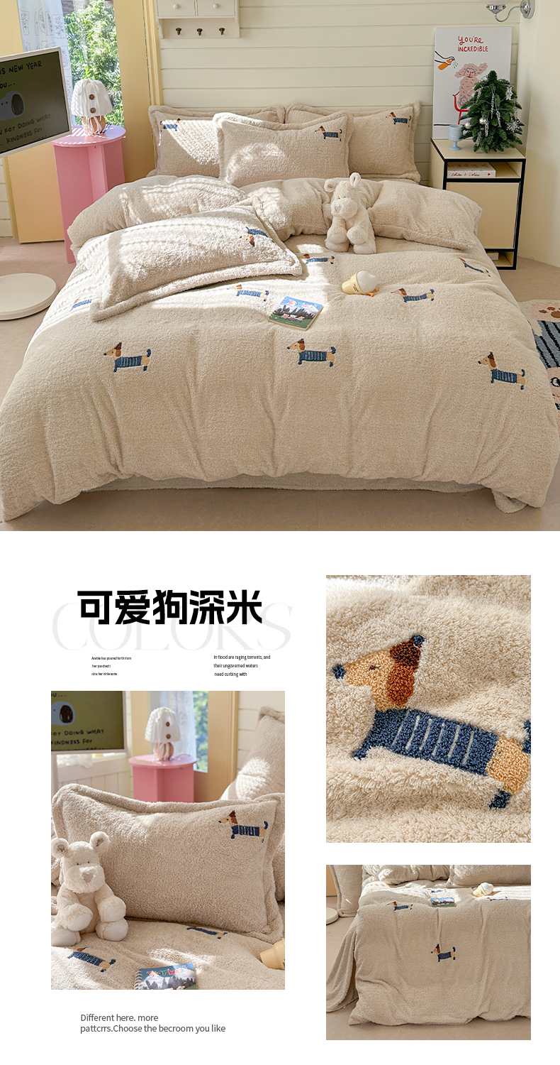 (总)萝莉家纺 2025新款加厚泰迪绒毛巾绣四件套,腊肠狗蓝,可爱狗米白,可爱狗深米,礼帽狗,圣诞树黄,小免蓝,小木马少女粉,小木马水兰,小企鹅豆沙粉,小企鹅米白,小兔茶粉,小熊奶白,熊豆绿,熊猫白,熊猫紫