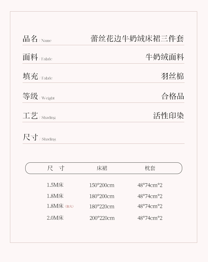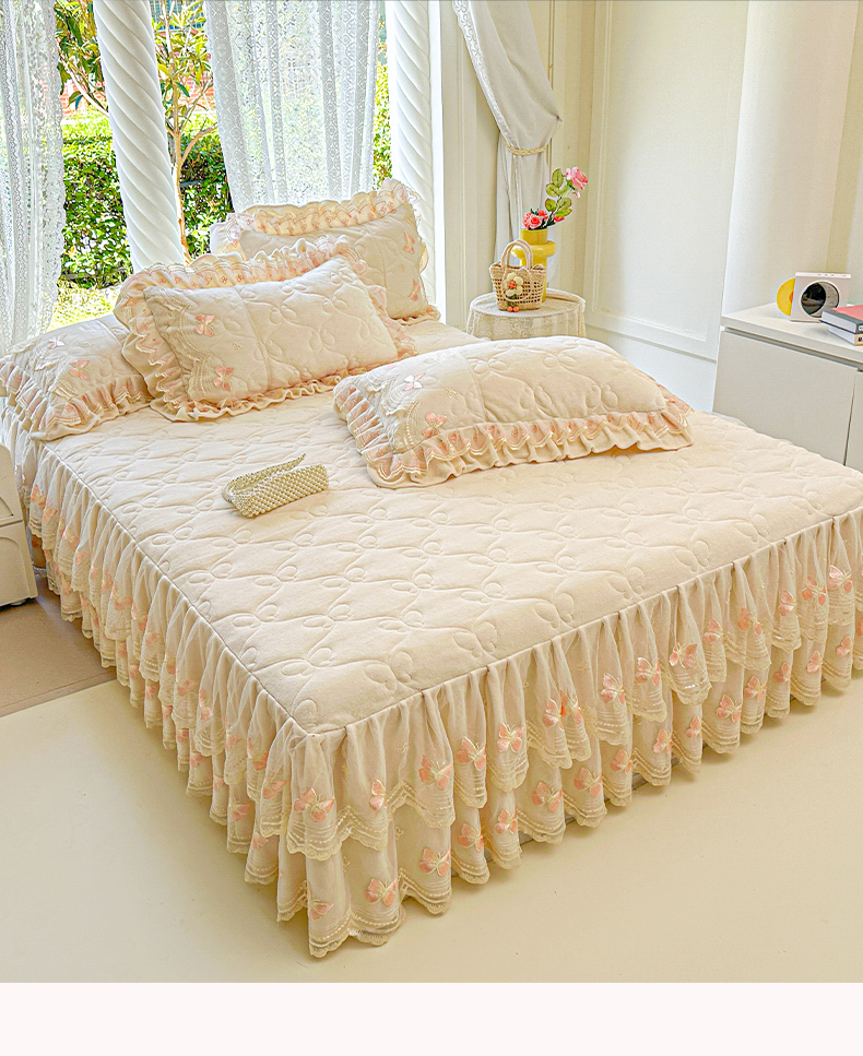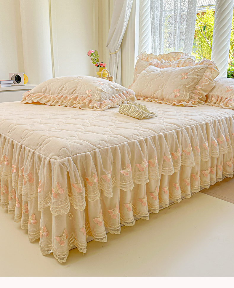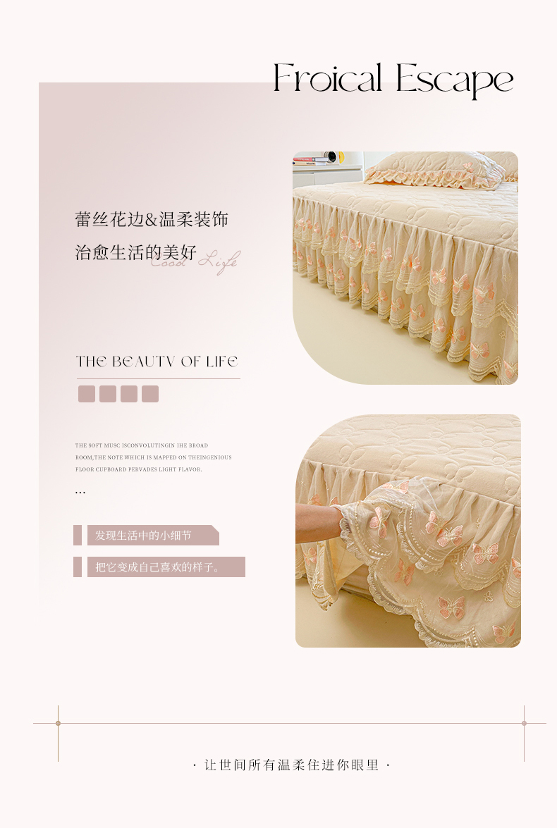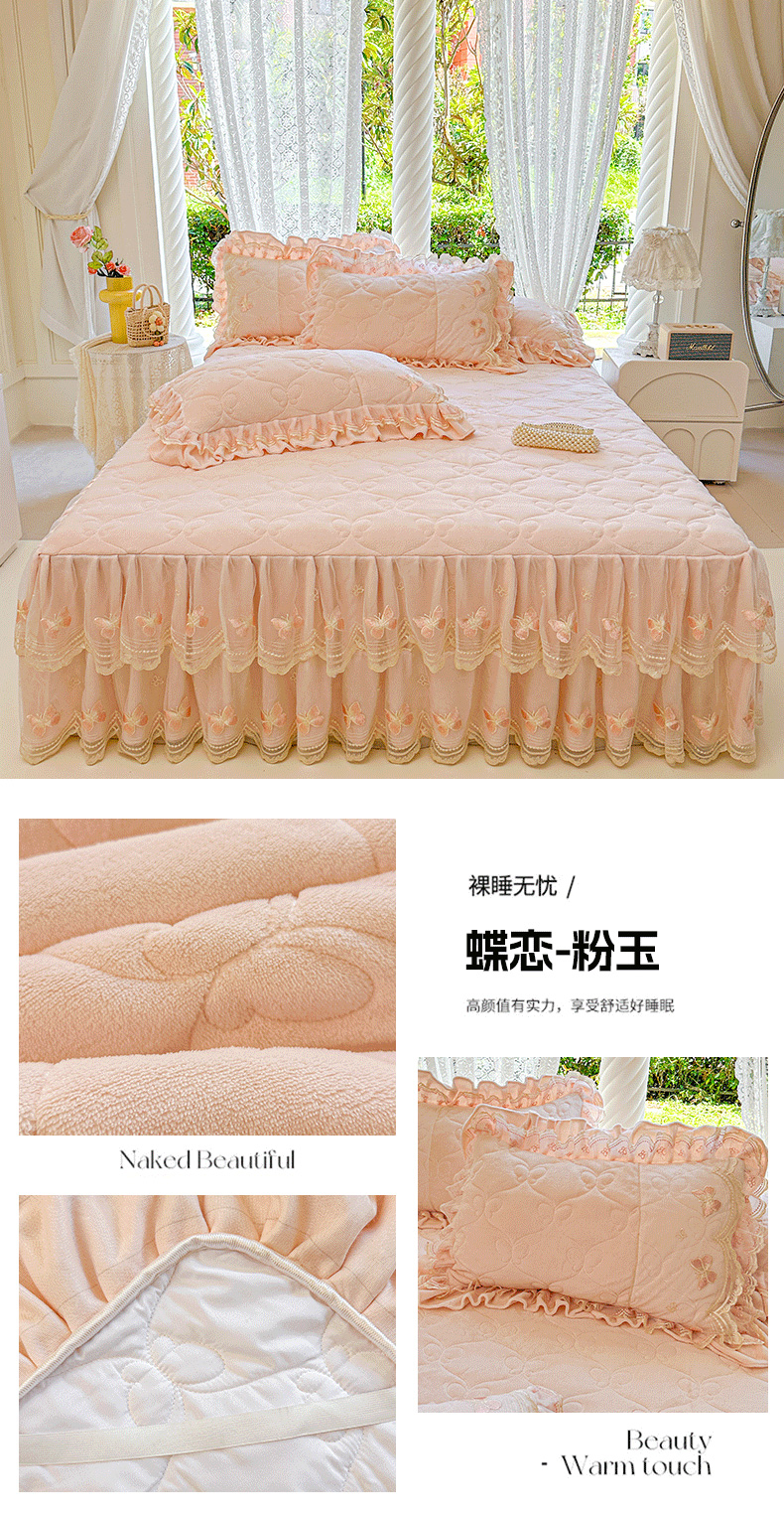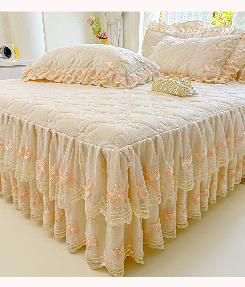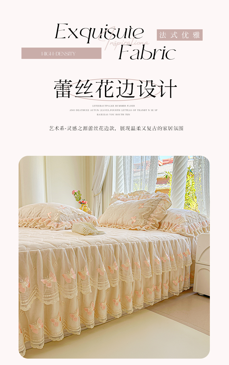 当前位置: 91家纺网 > 商品网购 > 床品套件 > 三件套 > 虹星家纺 2025新款花边牛奶绒床裙三件套系列 蝶恋-奶茶色