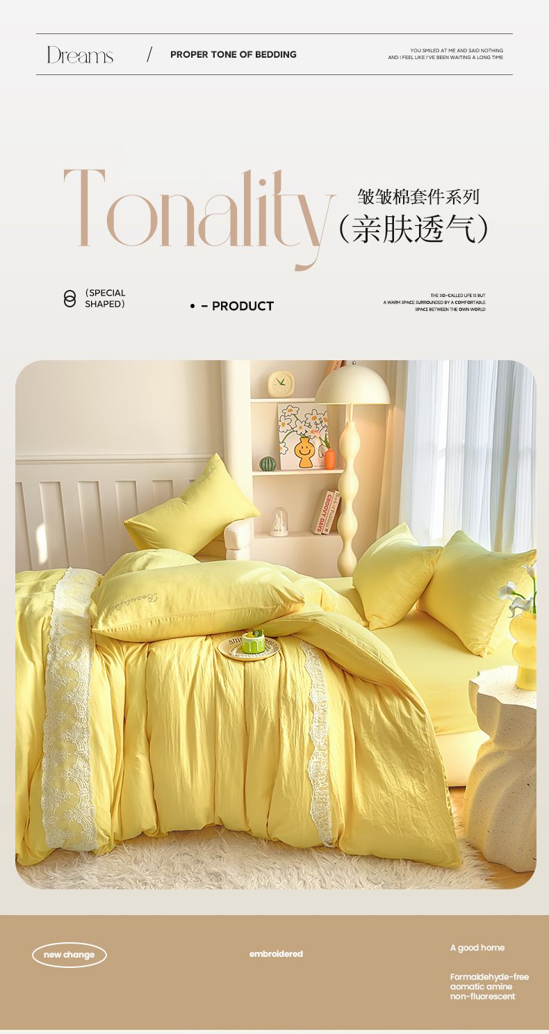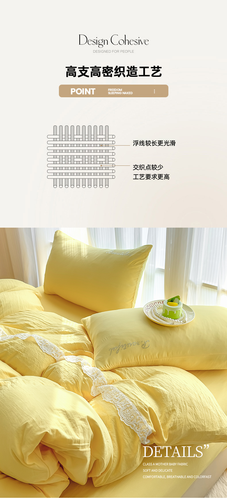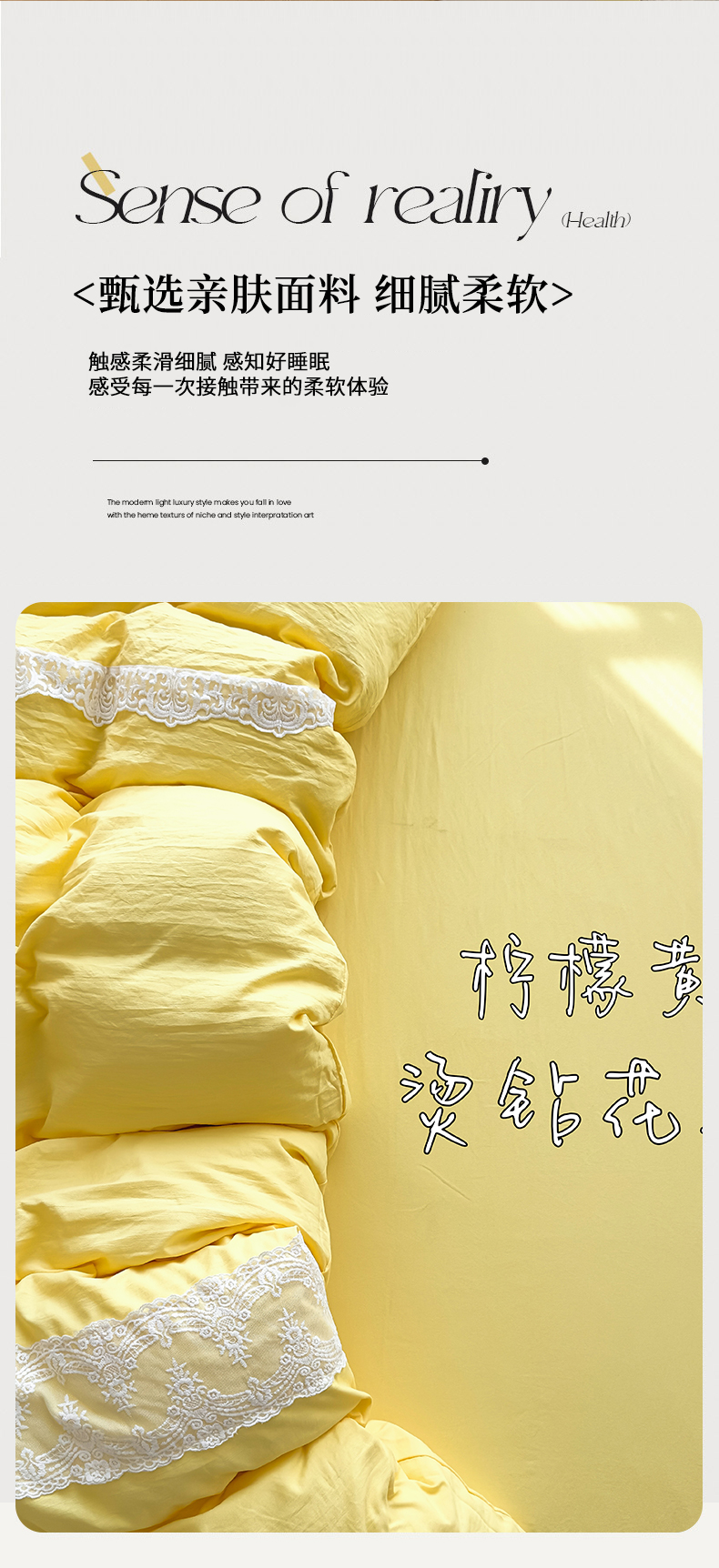 当前位置: 91家纺网 > 商品网购 > 床品套件 > 四件套 > 水洗棉四件套 > 灿哈 2025新款烫钻蕾丝花边水洗棉四件套 柠檬黄