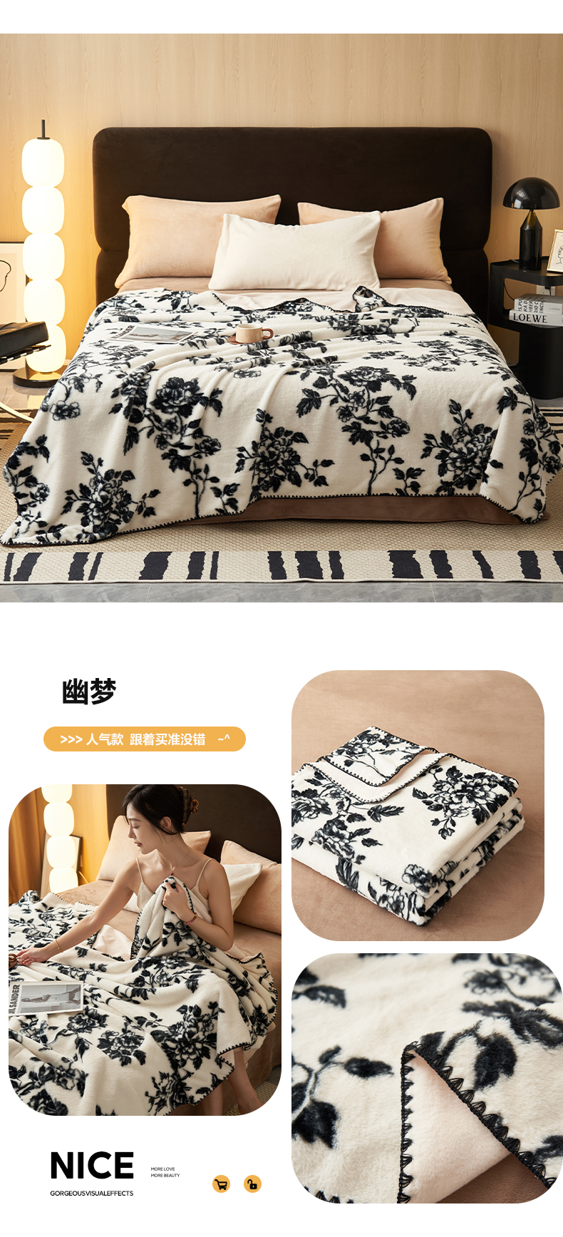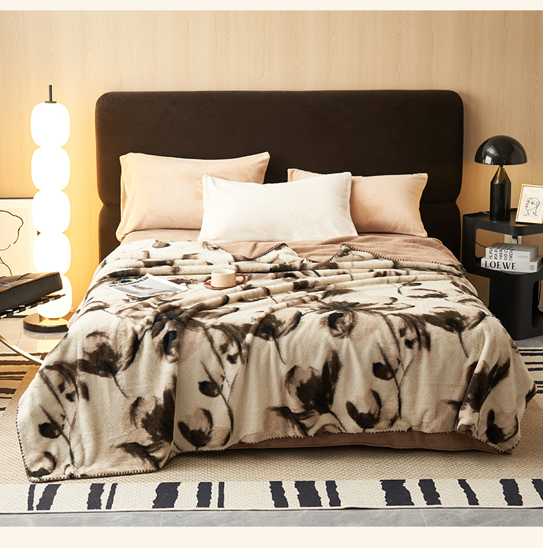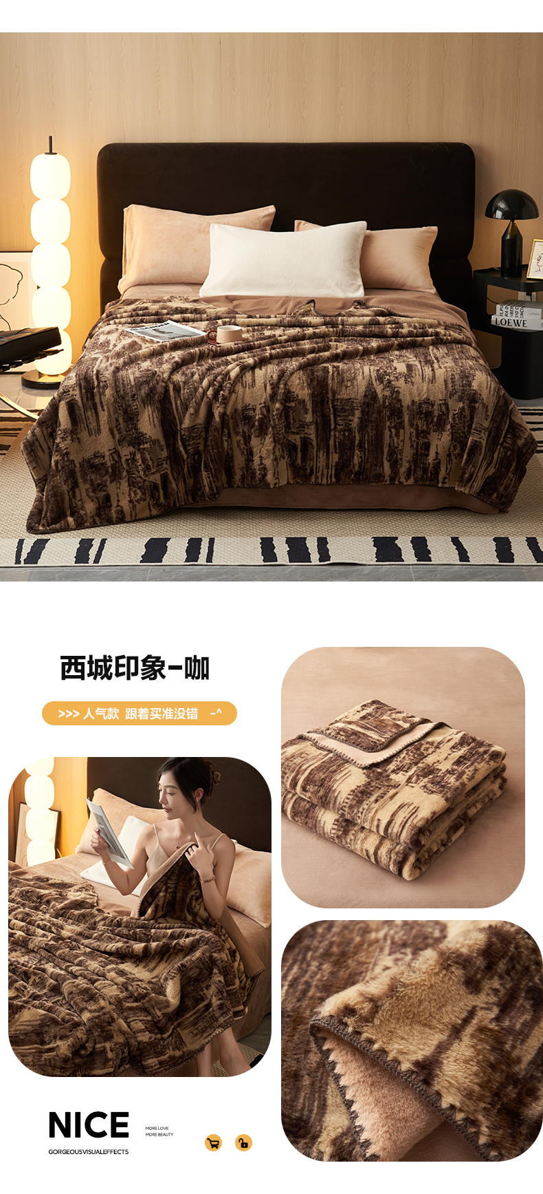 晨曦家纺 2025新款兔毛绒海獭绒双层毛毯三角针复合毛毯 水墨画-浅咖