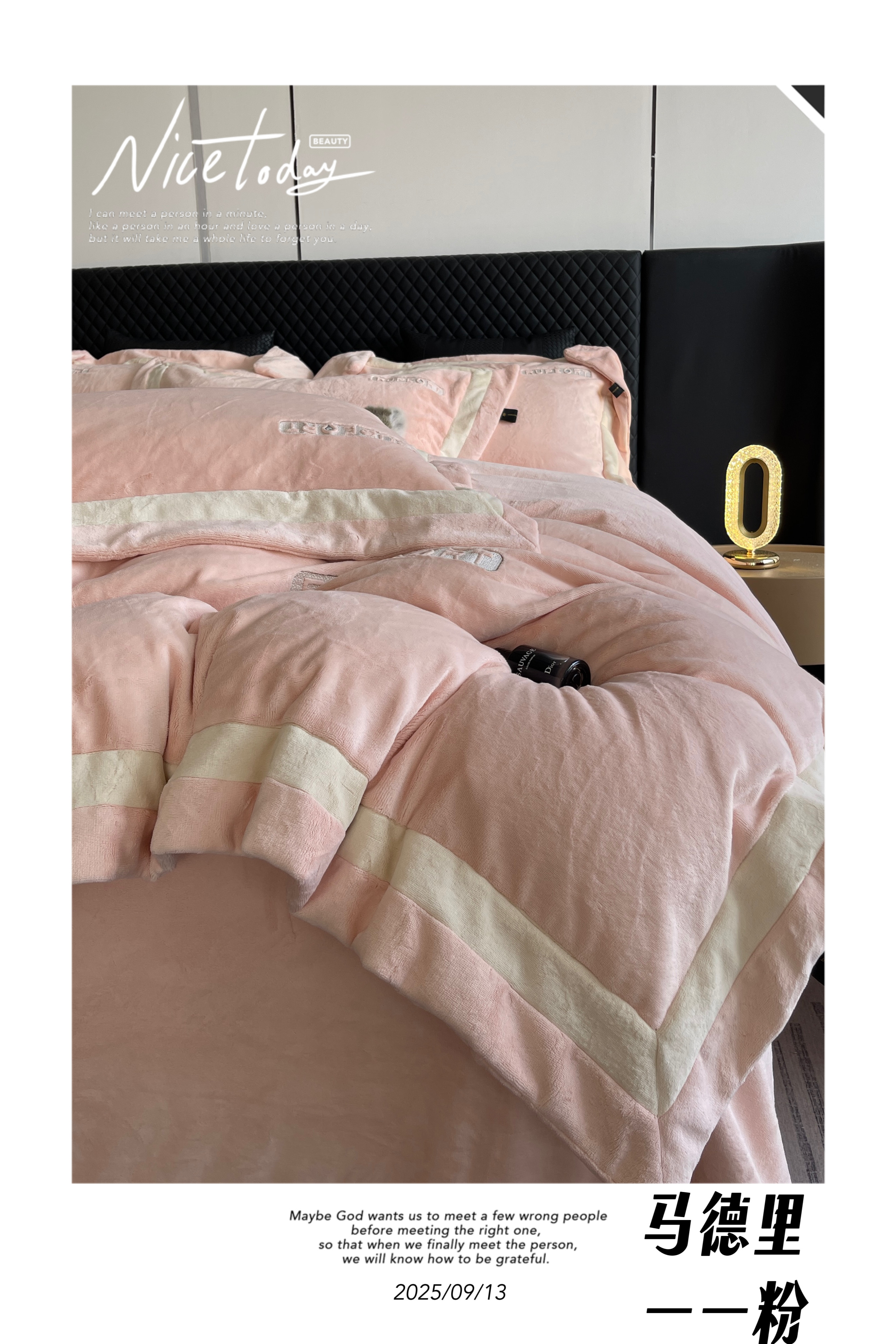 奈萝家纺 2025秋冬新款高克重加厚全消光绣花牛奶绒四件套标准12斤加大14斤送包装 马德里粉