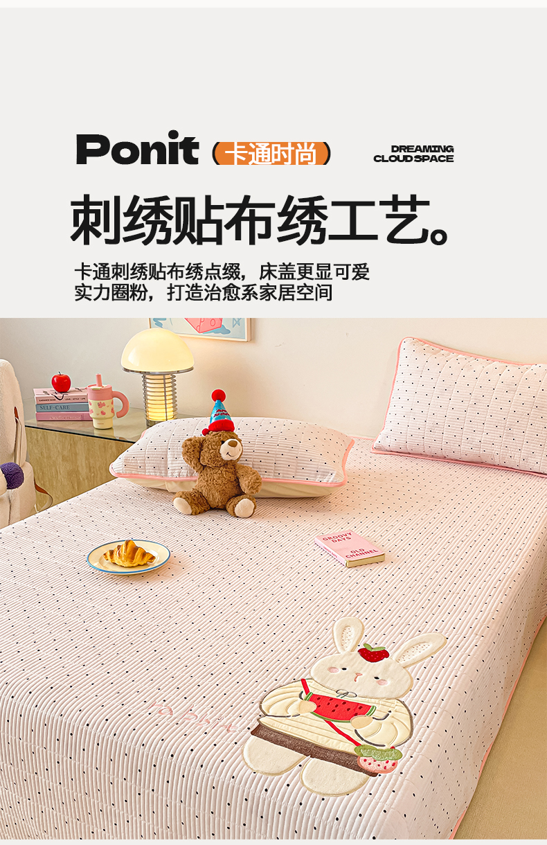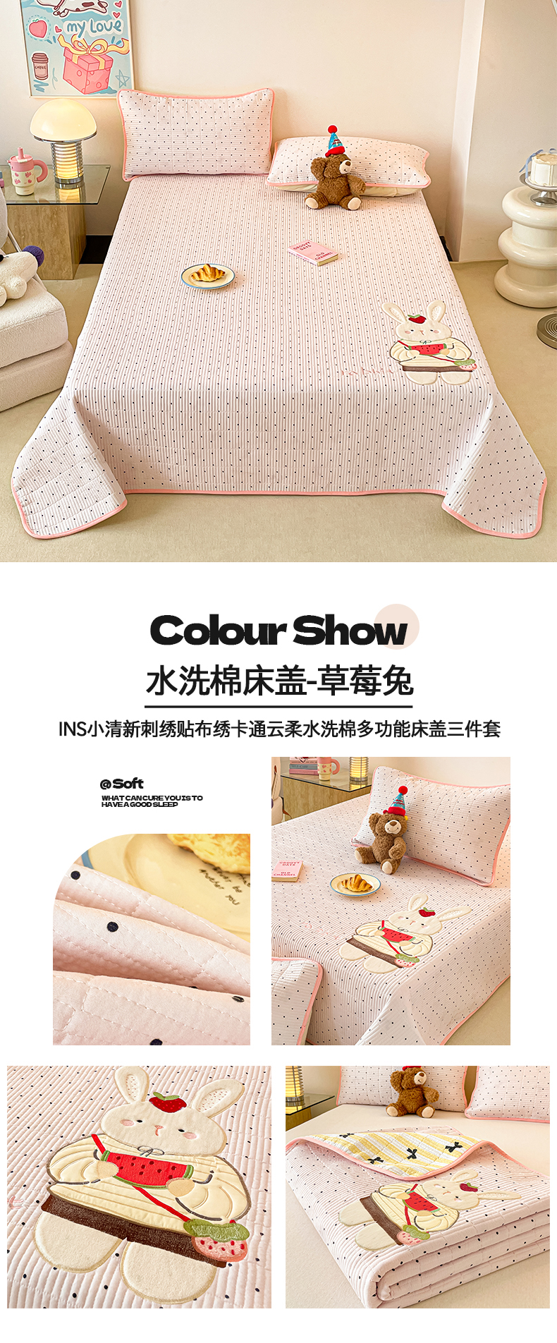 商品名称:桃心家居 2025新款ins小清新刺绣贴布绣卡通云柔水洗棉多功能床盖三件套 水洗棉床盖-草莓兔