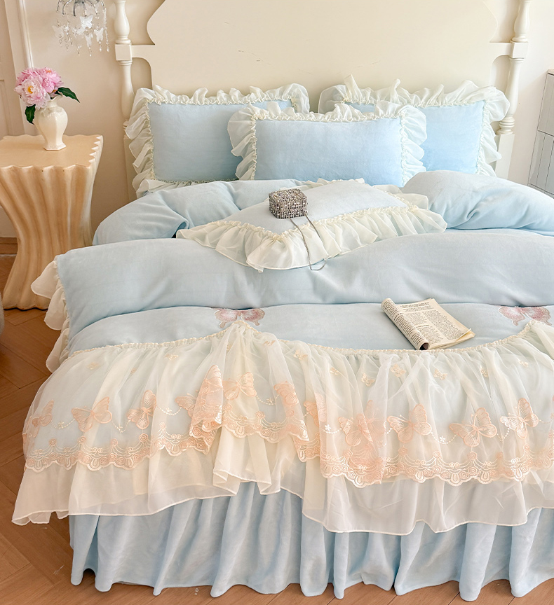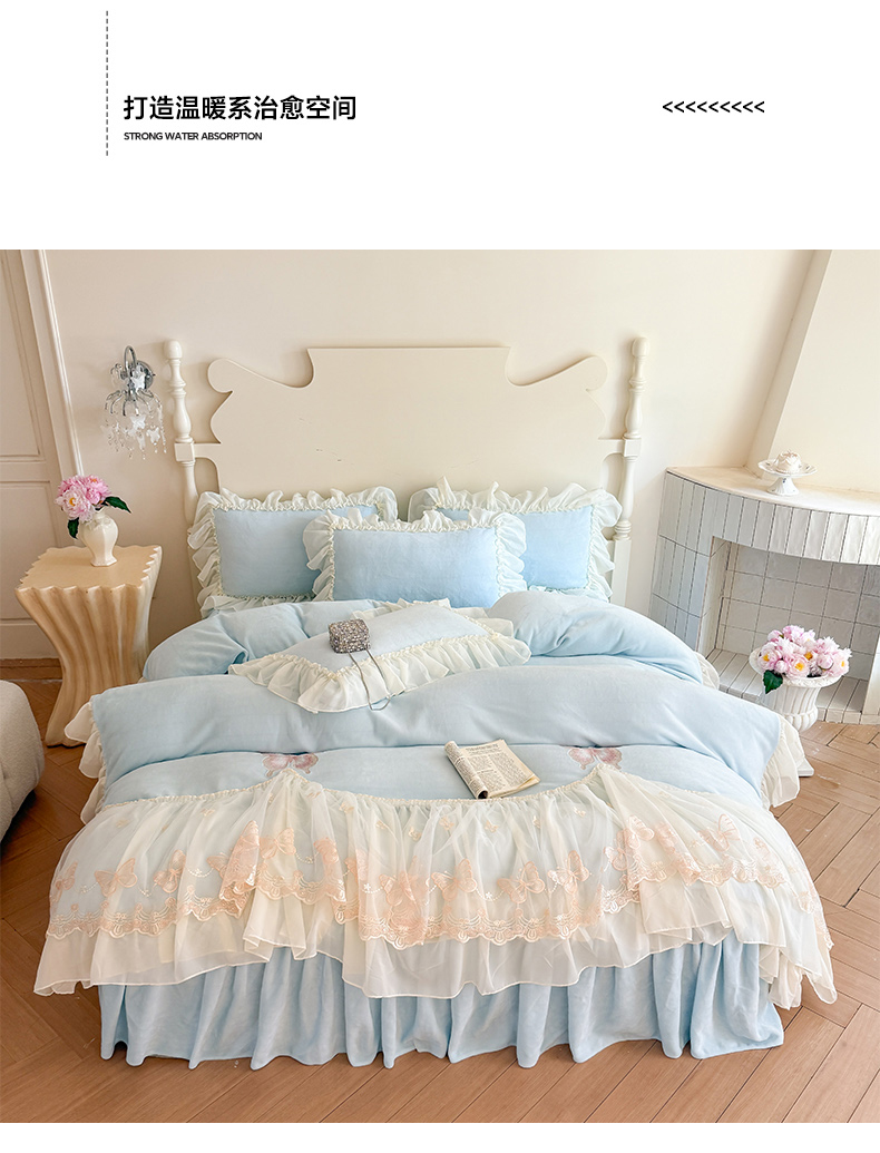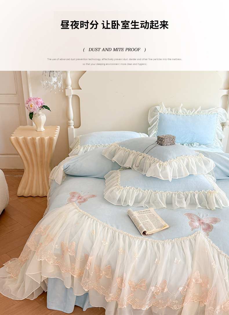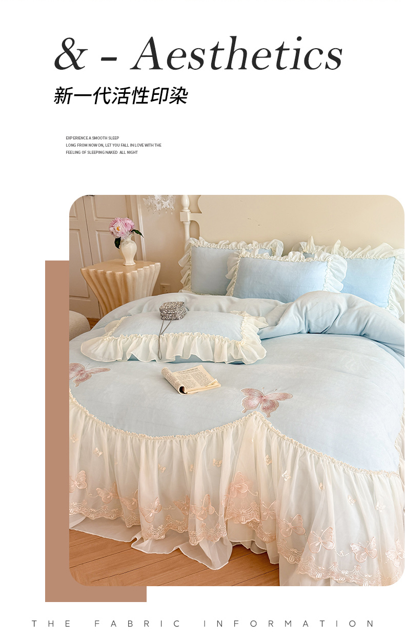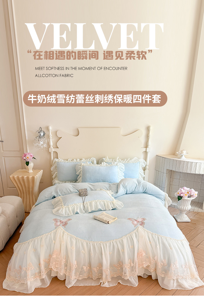 当前位置: 91家纺网 > 商品网购 > 床品套件 > 四件套 > 牛奶绒四件套 > 富盛家纺 2025新款牛奶绒床裙款蕾丝刺绣四件套韩版法式公主风--睡美人系列 睡美人-蓝