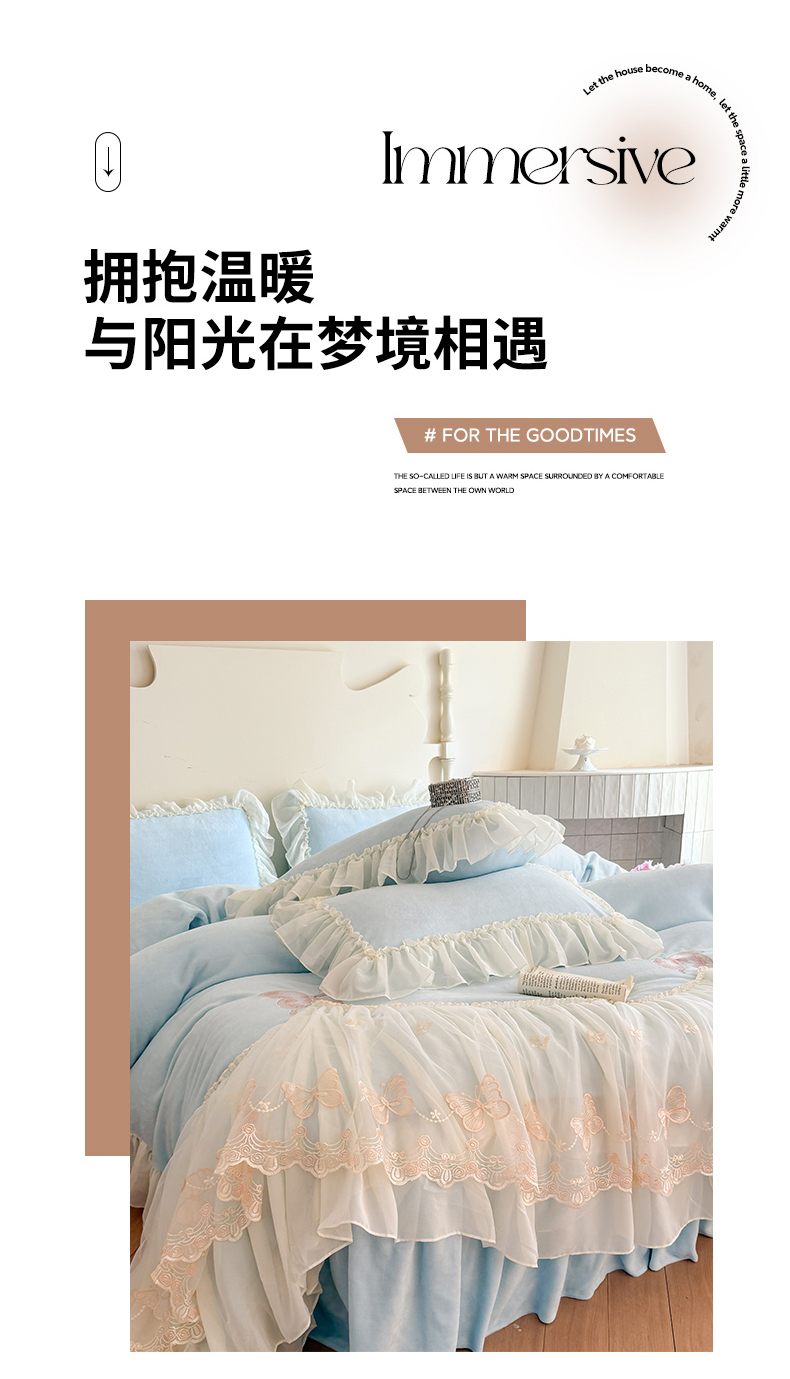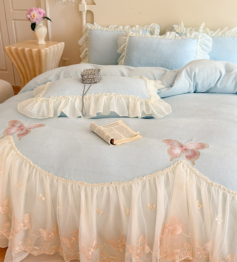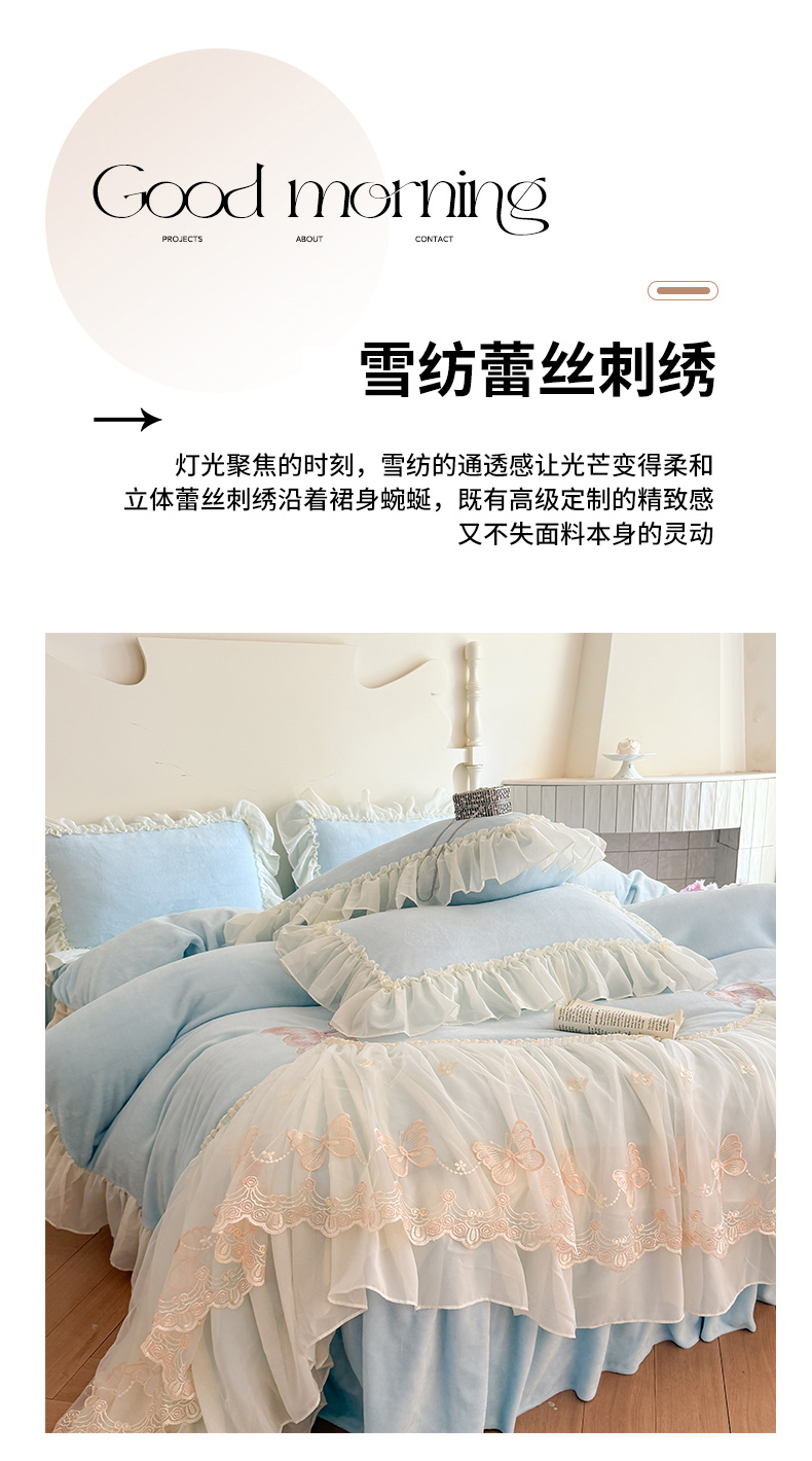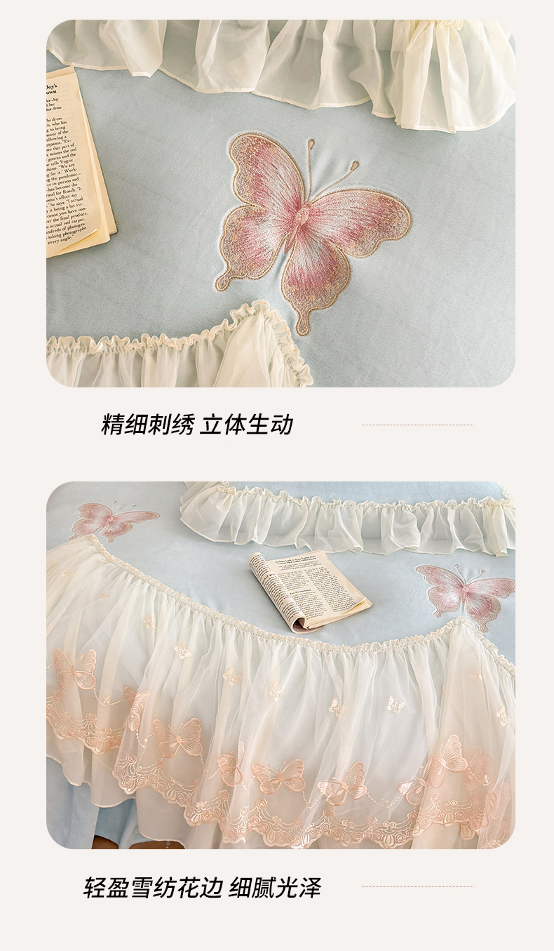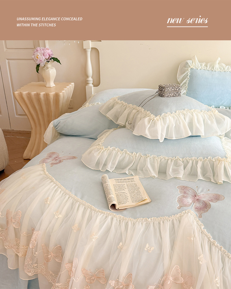 当前位置: 91家纺网 > 商品网购 > 床品套件 > 四件套 > 牛奶绒四件套 > 富盛家纺 2025新款牛奶绒床裙款蕾丝刺绣四件套韩版法式公主风--睡美人系列 睡美人-蓝