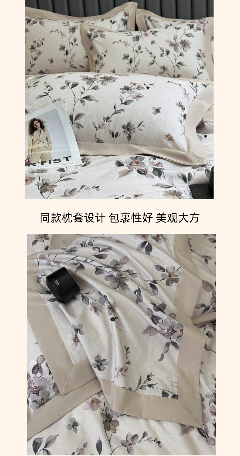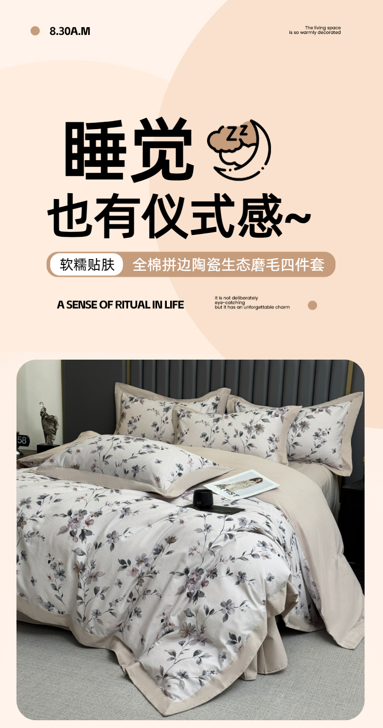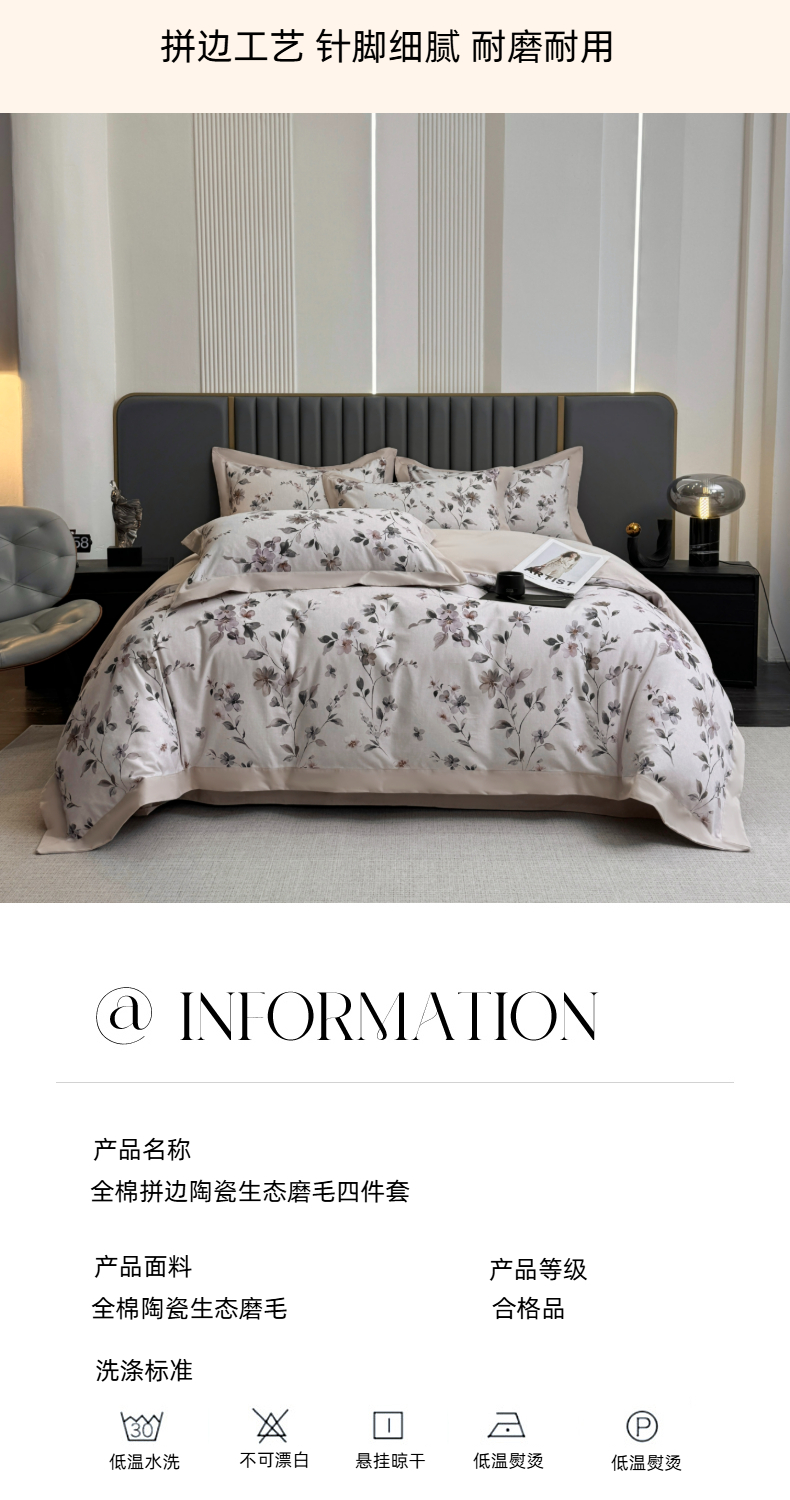 (总)乐蔻家纺 2025新款全棉拼边陶瓷生态磨毛四件套,春苑 米,格意,花蔓,花棠 米,梦园 绿,浅梦 米驼,倾语 灰,柔黛 豆沙,素暖 米,叶迹 绿,余生浅茉 米,悦野 米