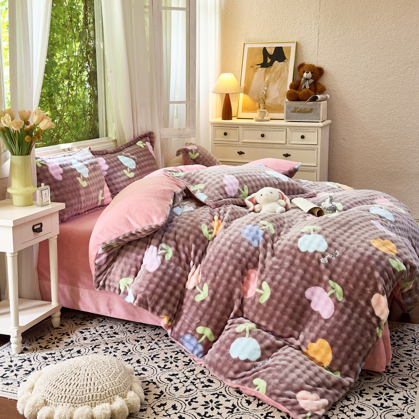 (总)梦莱斯 2025新款泡泡绒豆豆绒加厚牛奶绒四件套 - 印花系列,蝶影粉,赫本蝴蝶,花妖,咖色蝴蝶结,顽皮熊,星空黄,熊猫绿,炫彩紫,字母爱心