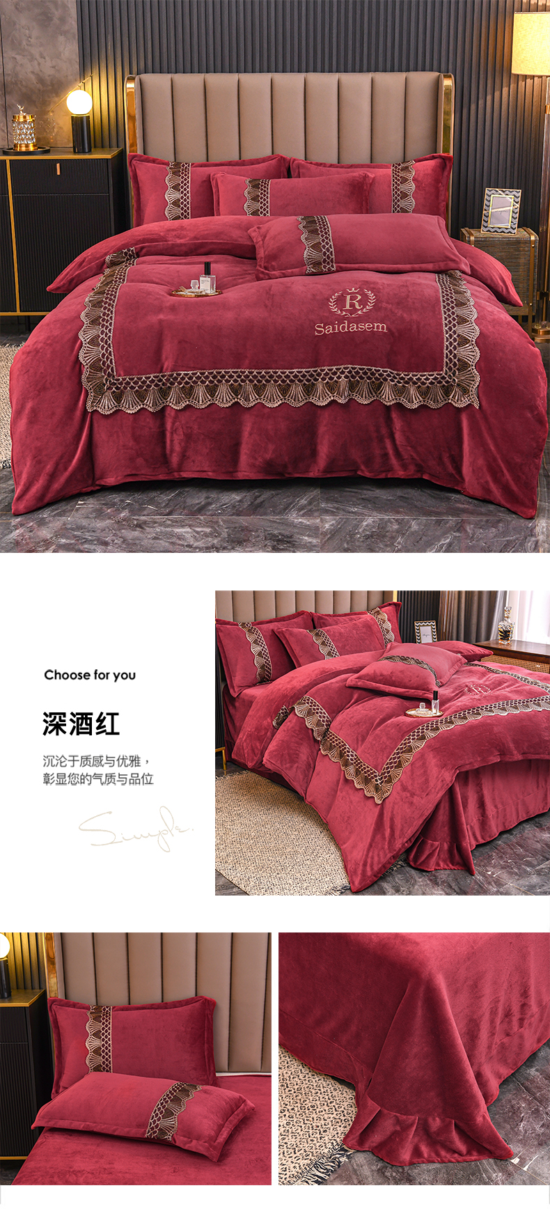 (总)仟网汇 2025热款轻奢贵族风蕾丝立体刺绣高克重牛奶绒四件套金貂绒法莱绒,深酒红,白加灰,豆沙粉,翡翠绿,高级灰,奶白