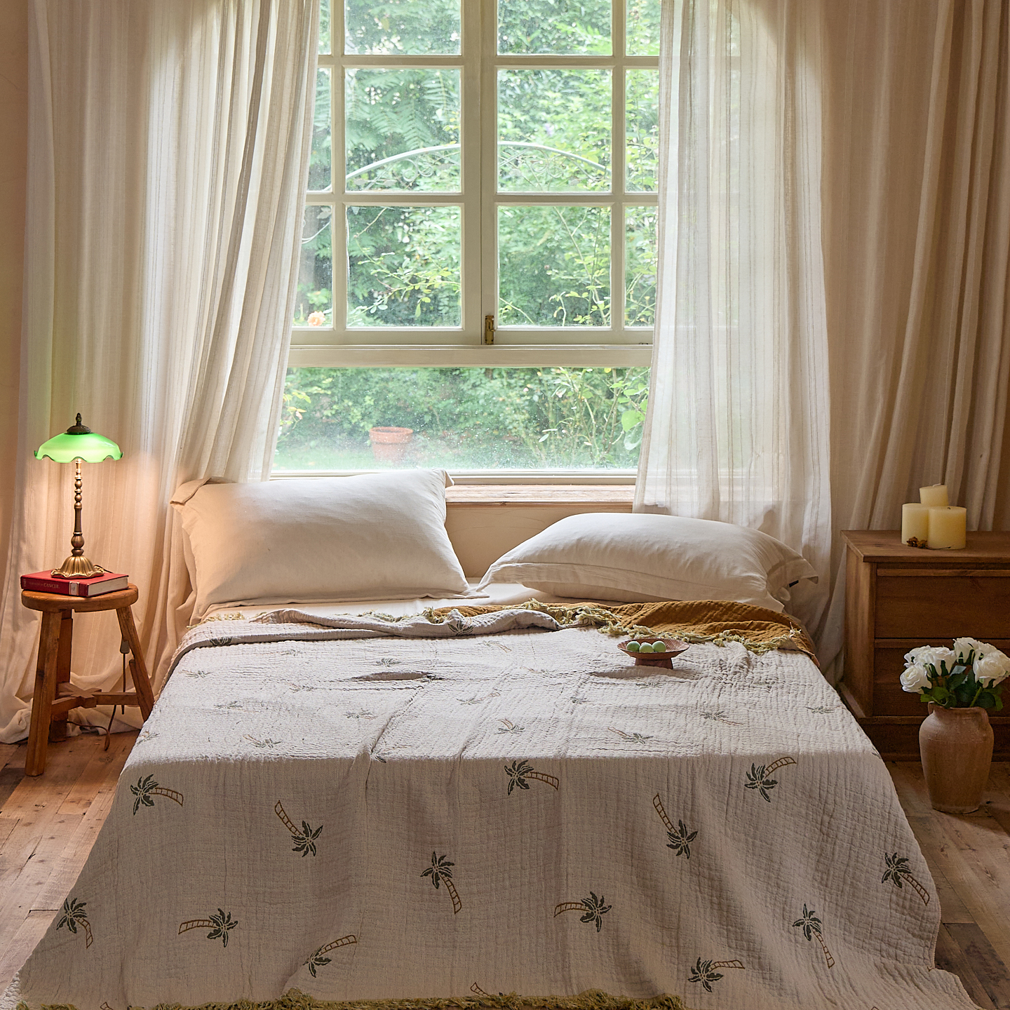 沐瑟家纺 2025新款亲肤全棉纱布盖毯毯子 椰树-白色