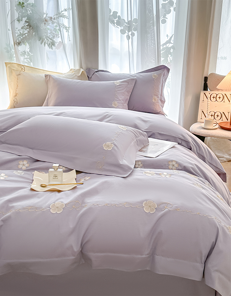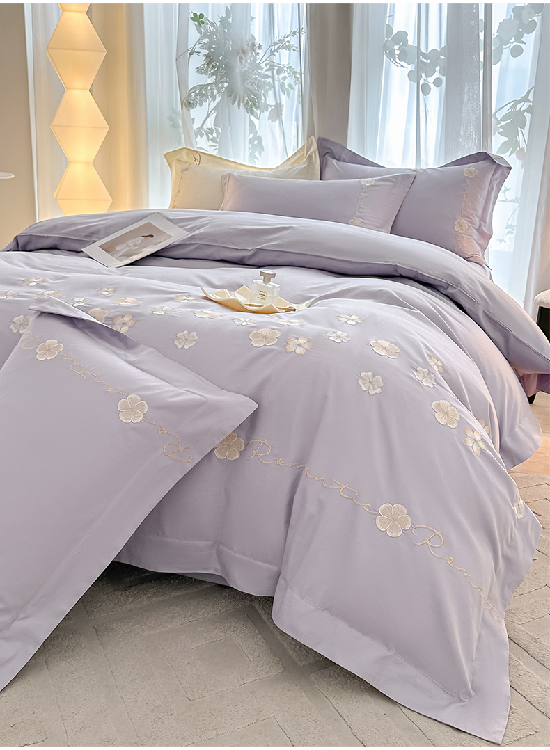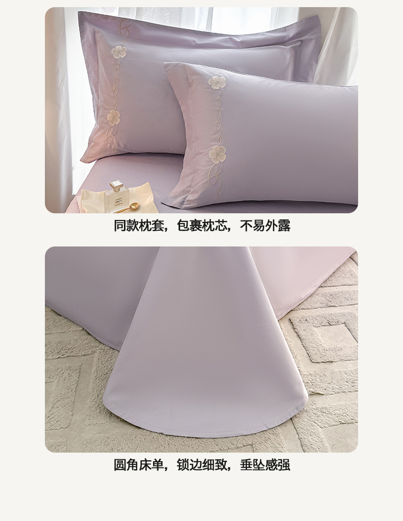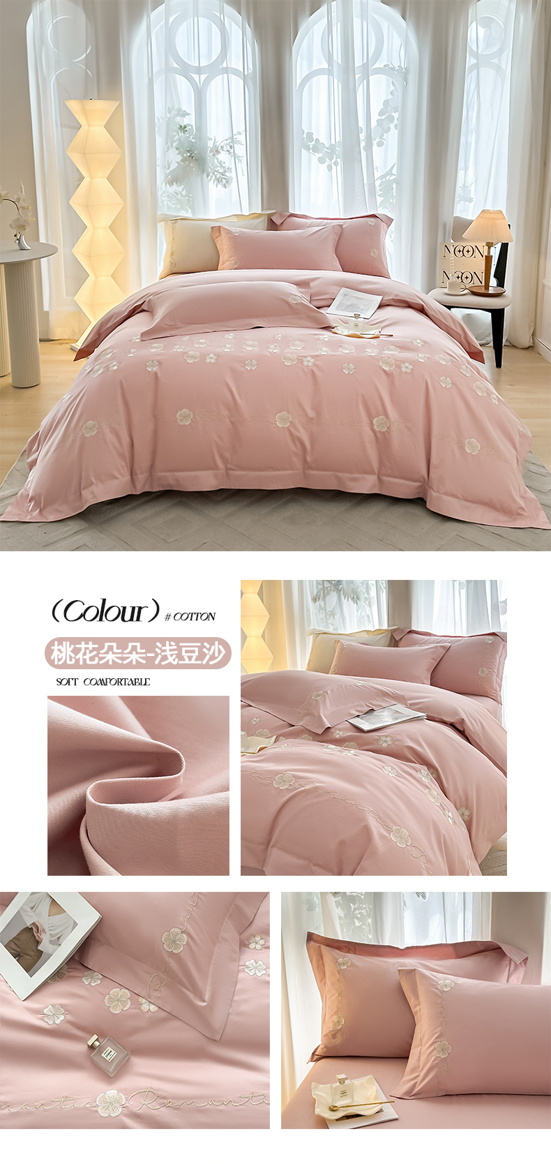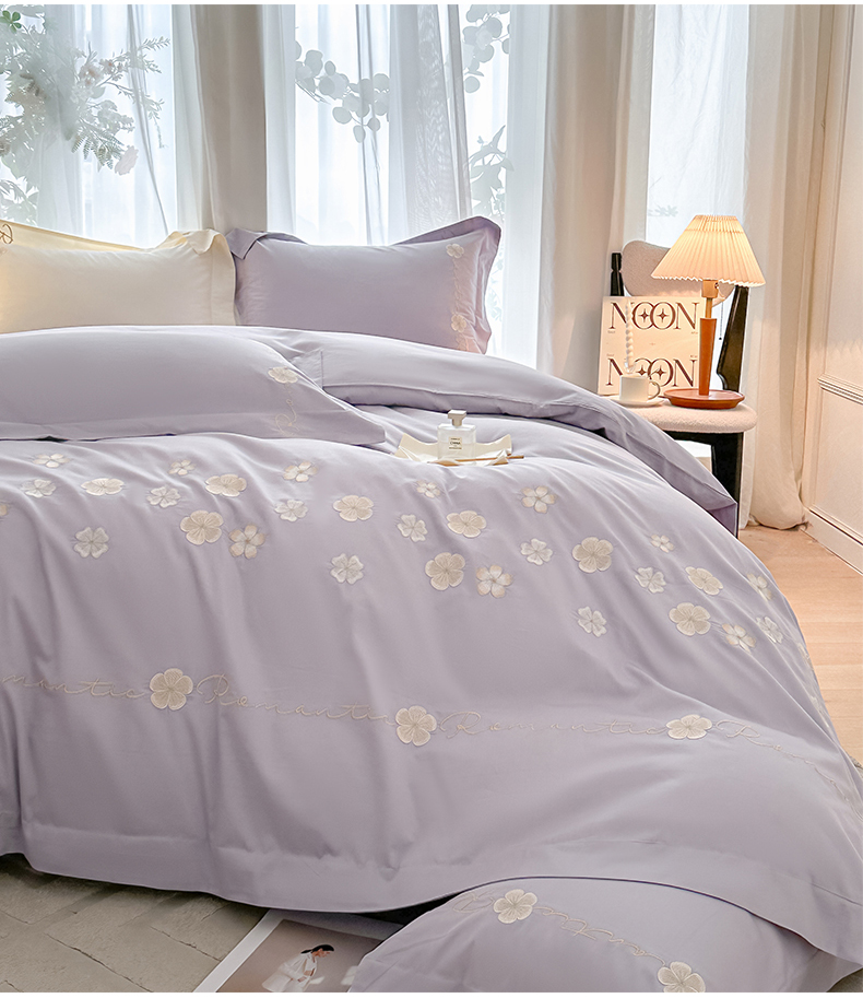 置顶家纺 2025新款全棉纯棉刺绣四件套桃花朵朵系列 桃花朵朵-香芋紫
