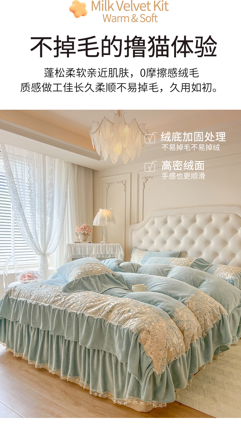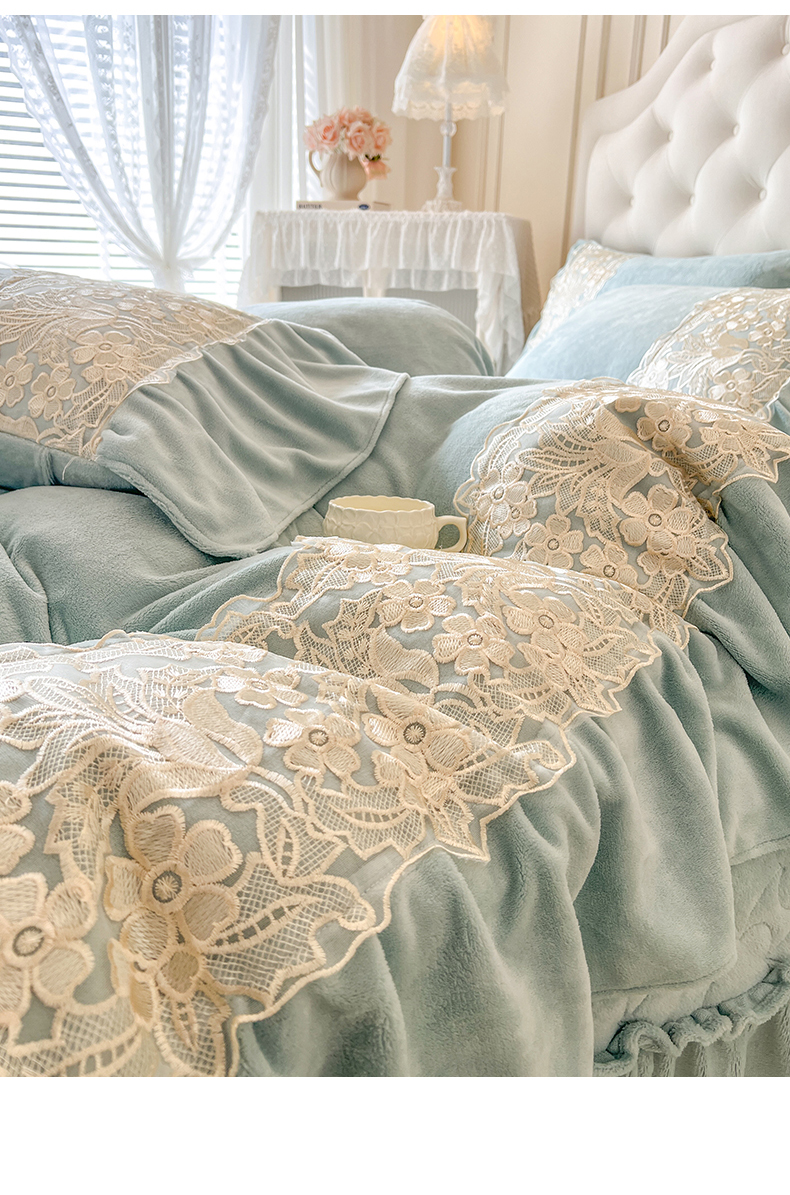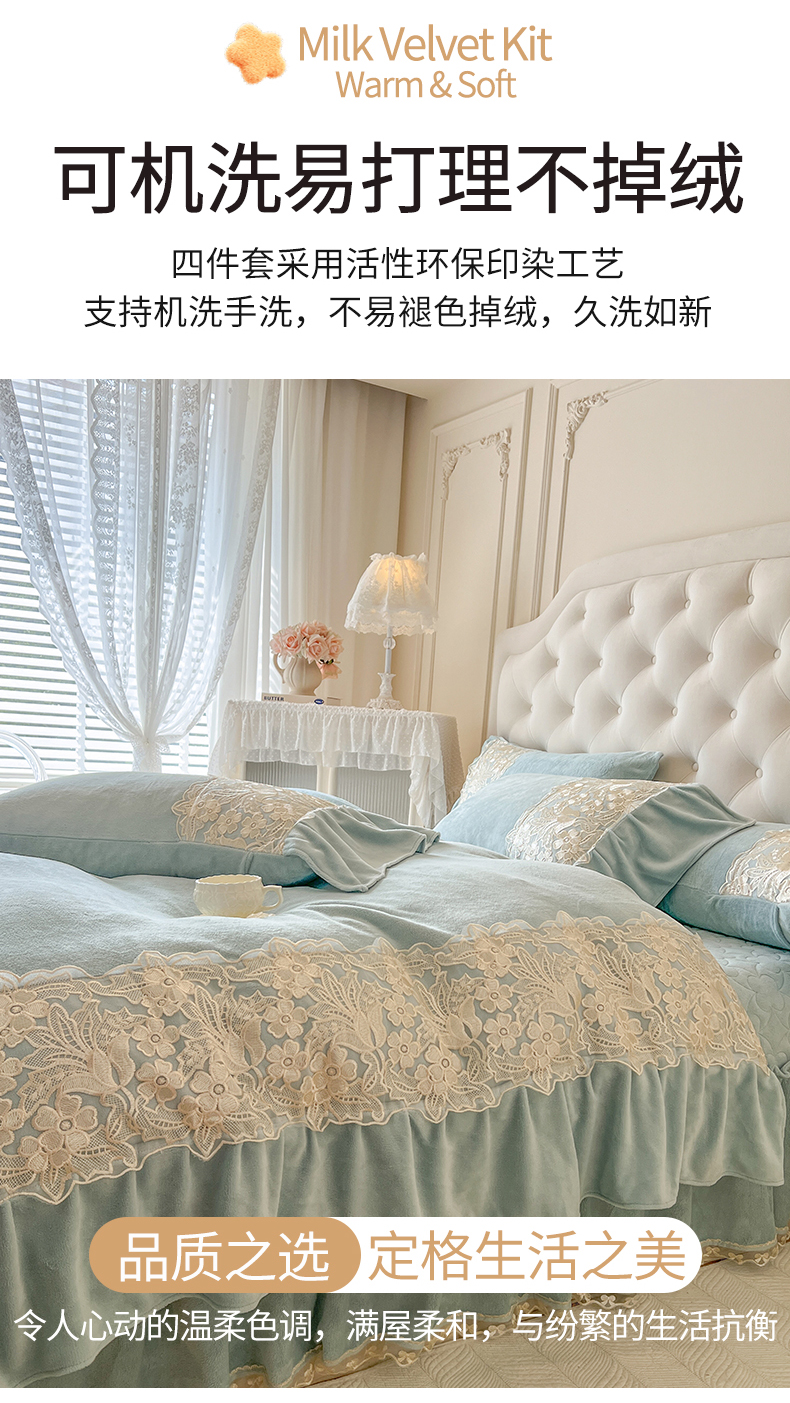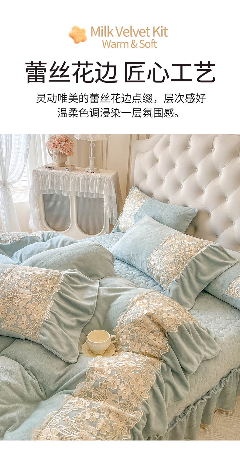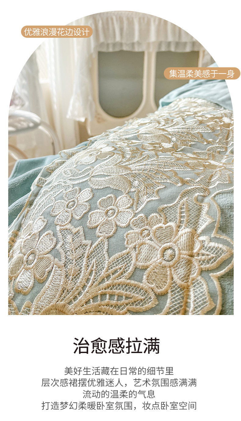 商品名称:网红馆(ck家纺) 2025新款牛奶绒蕾丝花边倾城系列四件套 倾城-绿