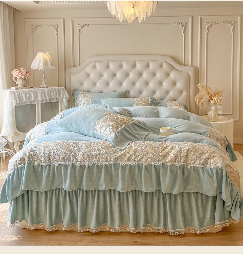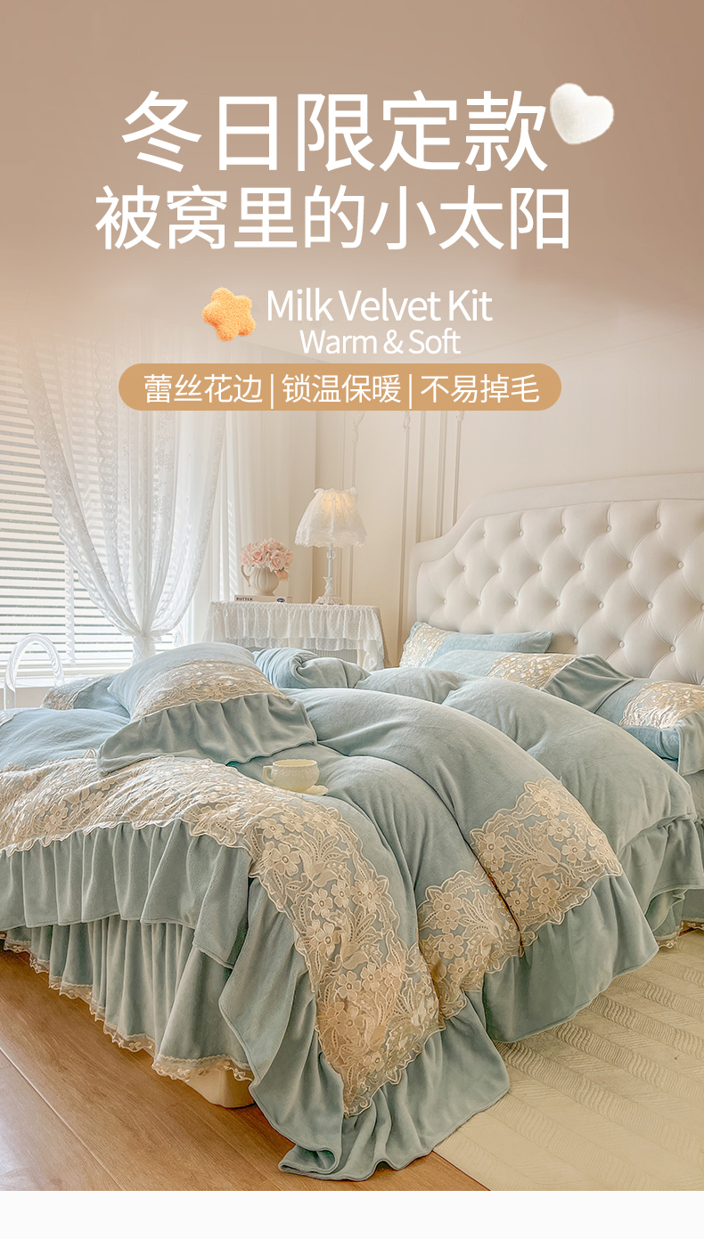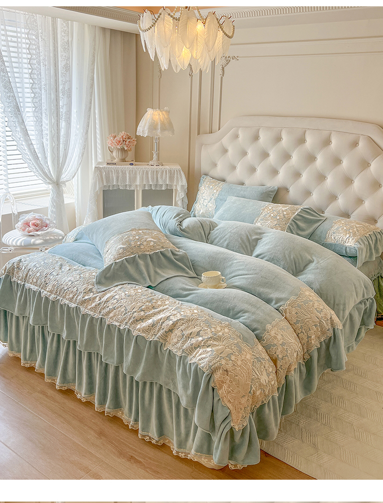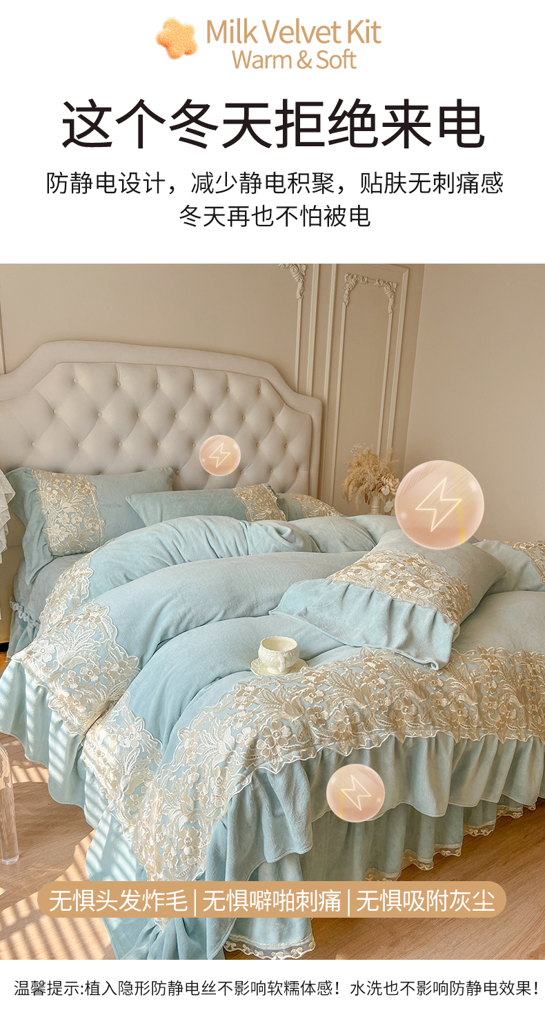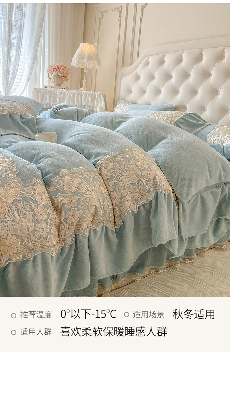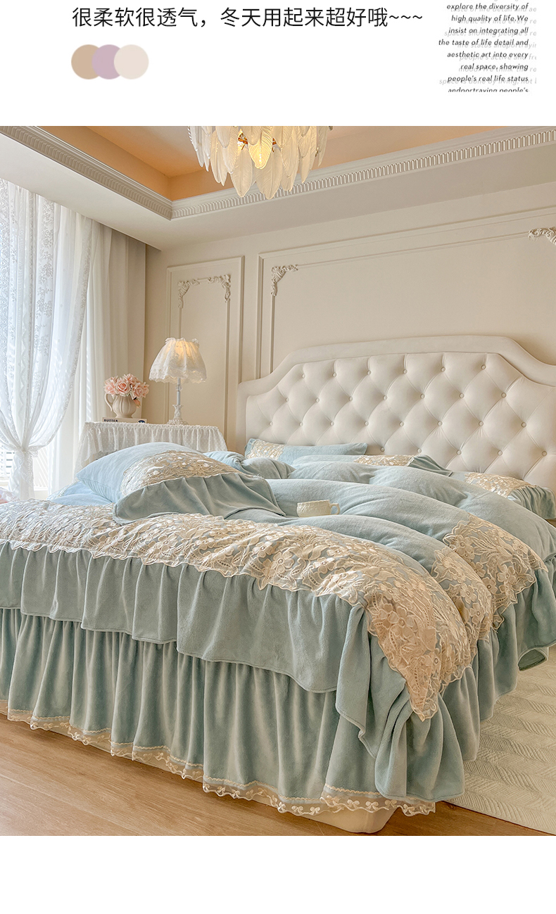 商品名称:网红馆(ck家纺) 2025新款牛奶绒蕾丝花边倾城系列四件套 倾城-绿