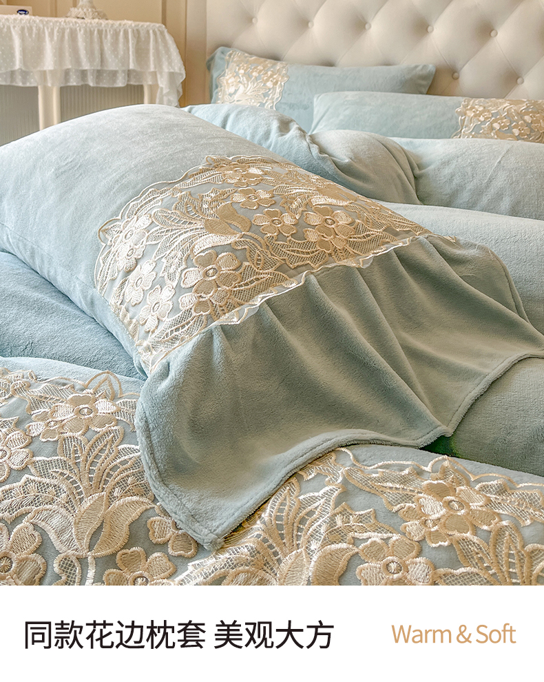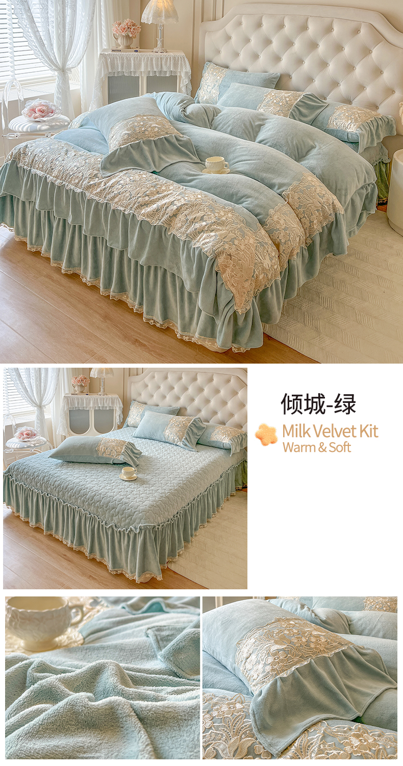 网红馆(ck家纺) 2025新款牛奶绒蕾丝花边倾城系列四件套 倾城-绿