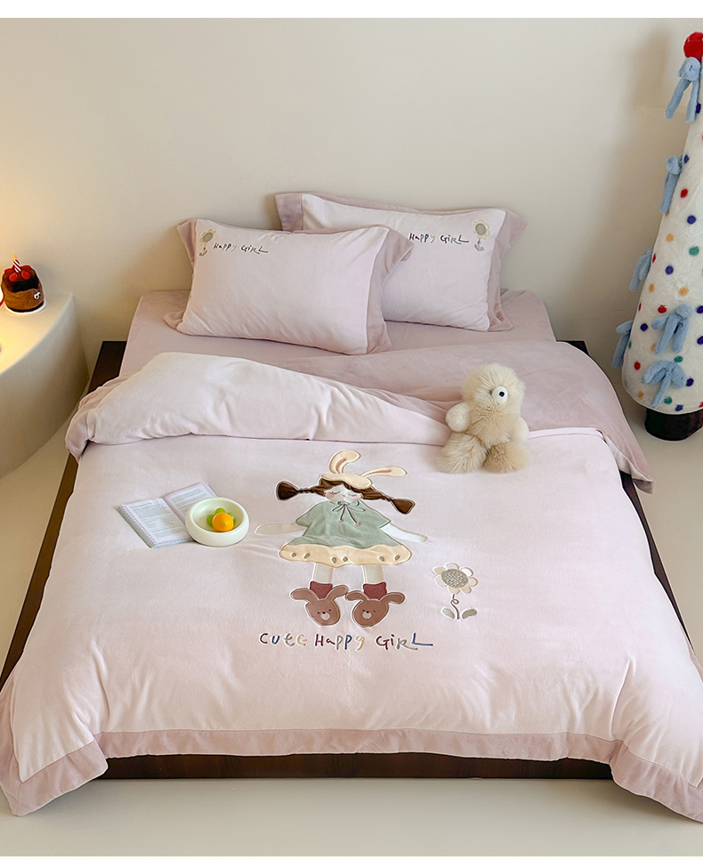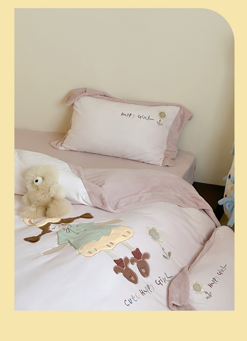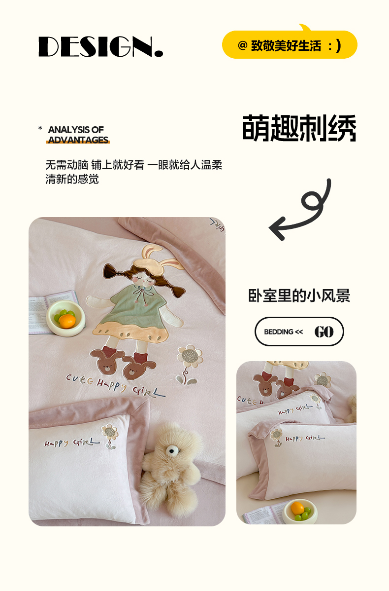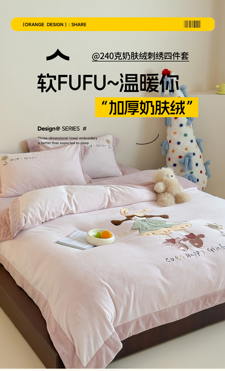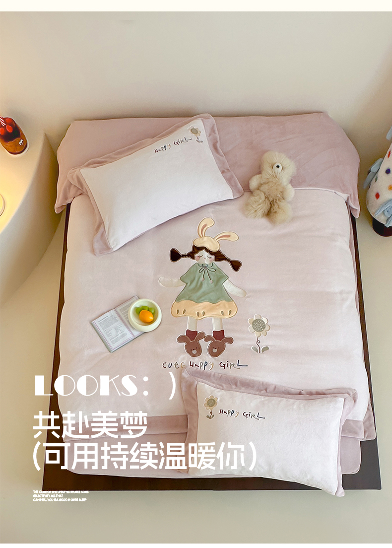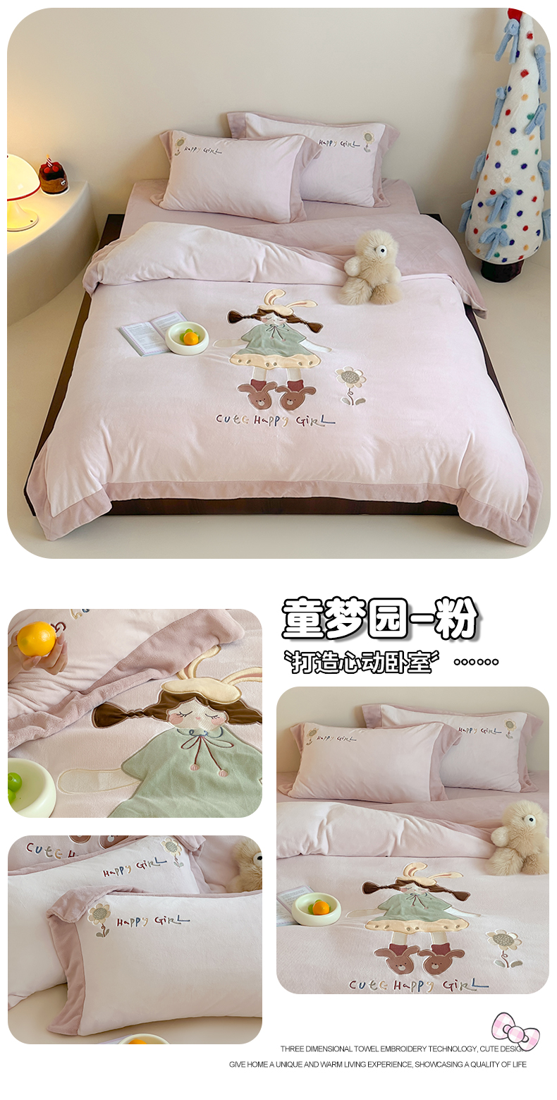 泽西家纺+V17798841158发大图 2025新品秋冬加厚保暖240克奶肤绒宽边卡通贴布绣牛奶绒四件套 童梦园一粉