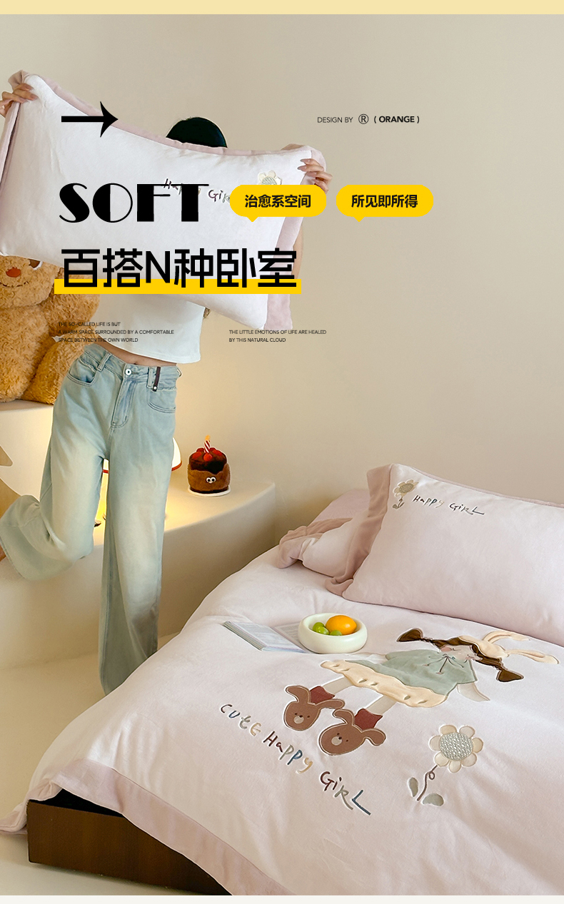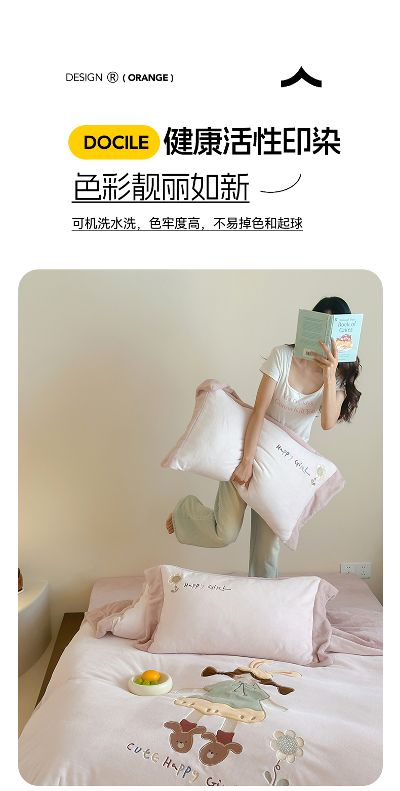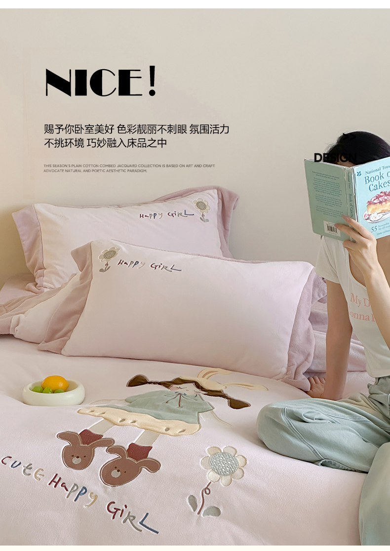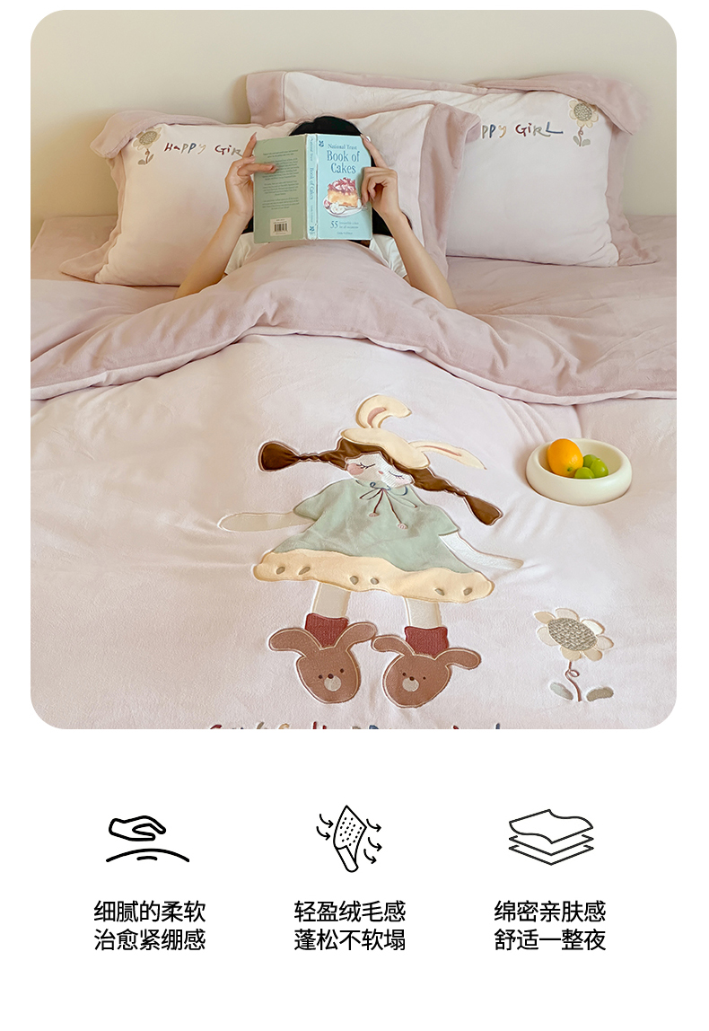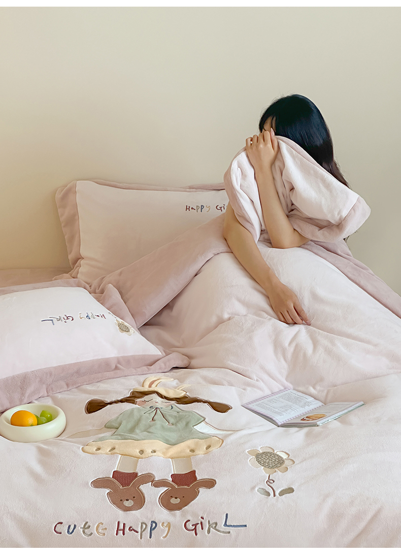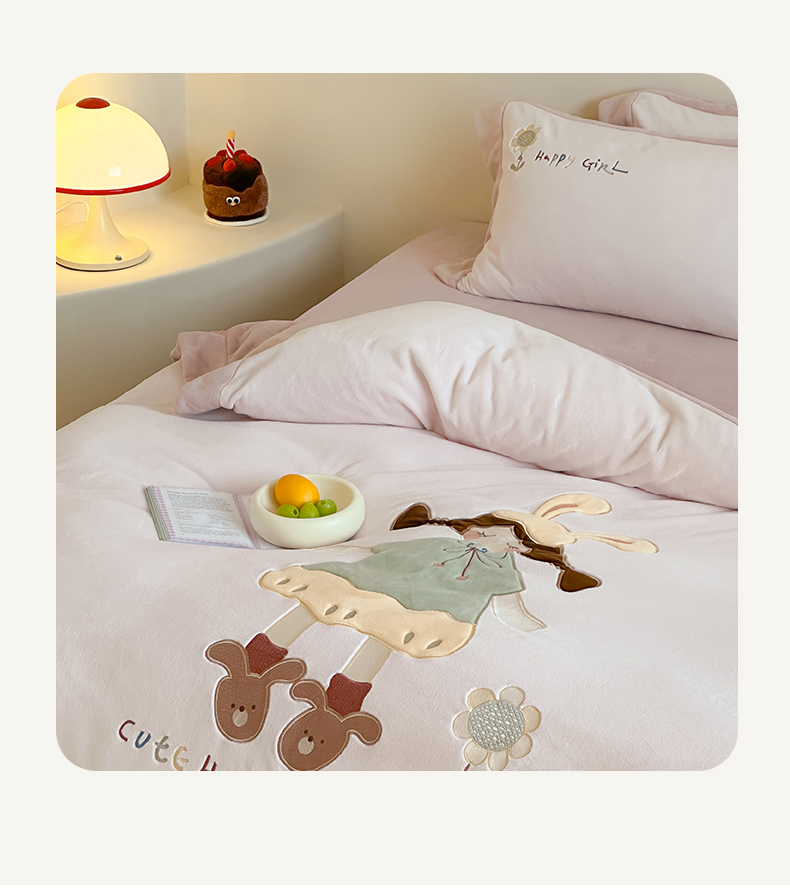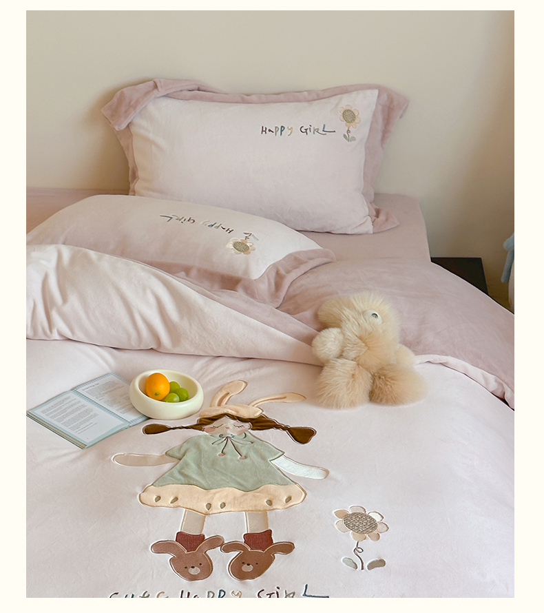泽西家纺+V17798841158发大图 2025新品秋冬加厚保暖240克奶肤绒宽边卡通贴布绣牛奶绒四件套 童梦园一粉