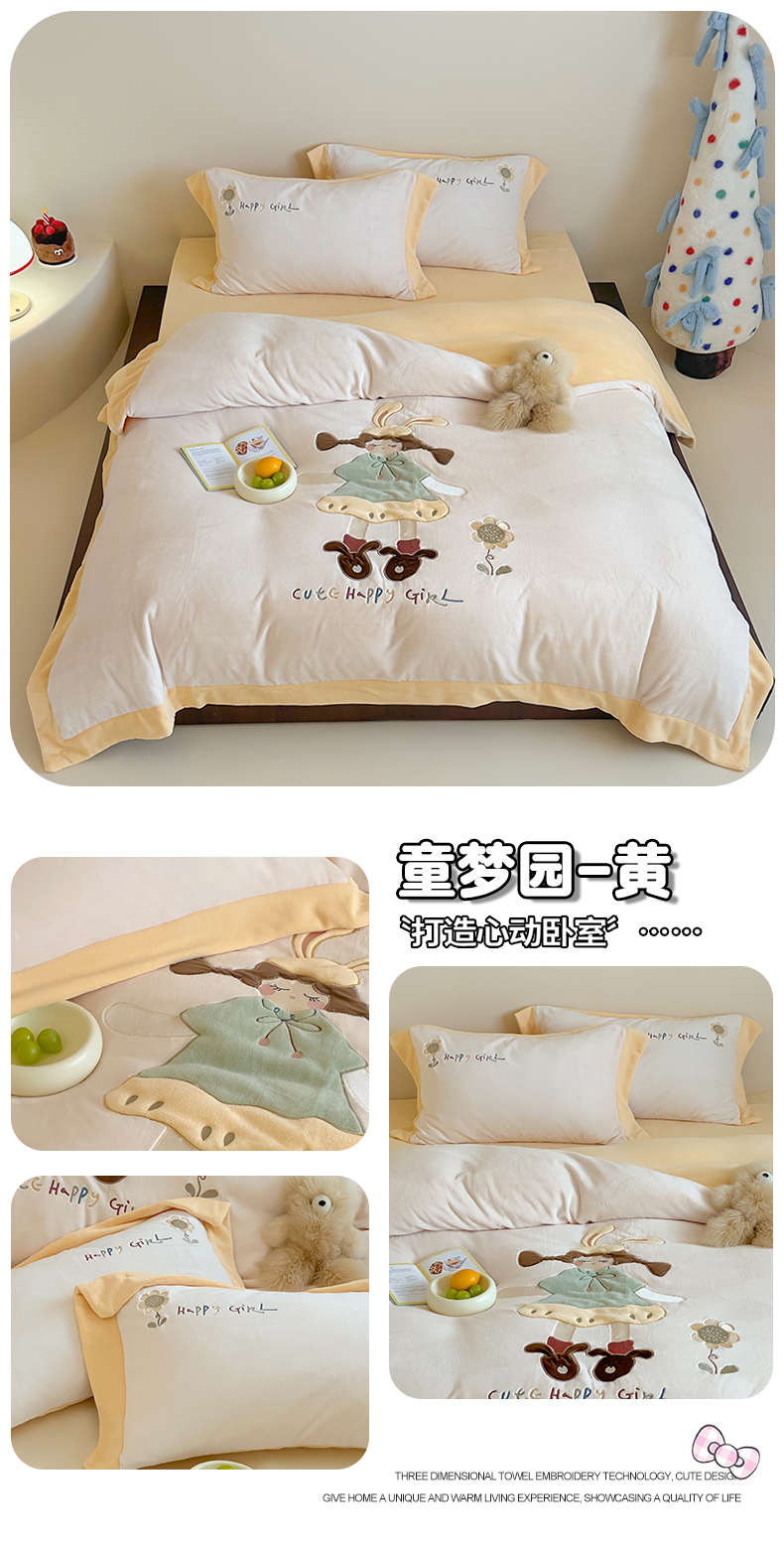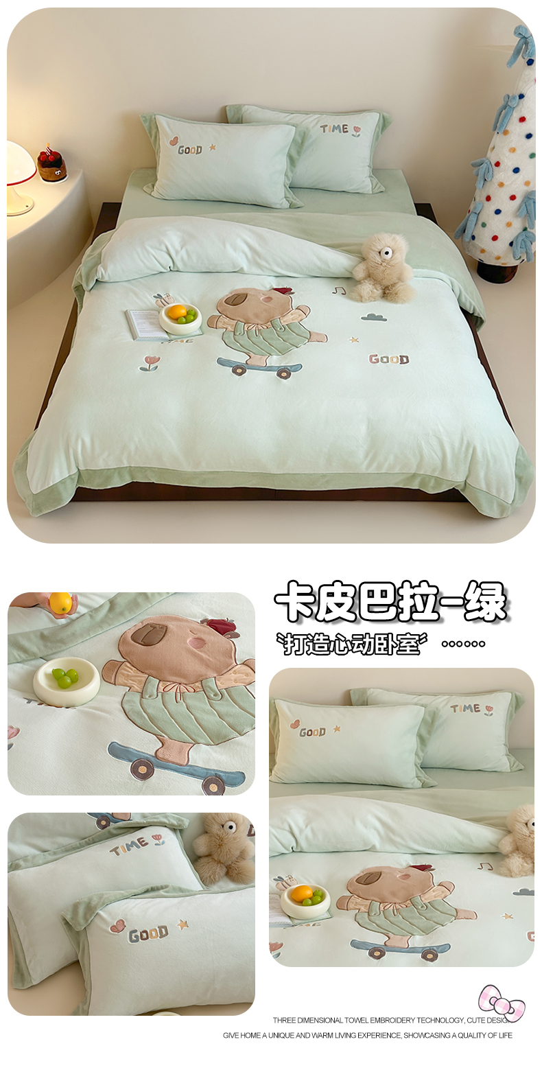 (总)泽西家纺+V17798841158发大图 2025新品秋冬加厚保暖240克奶肤绒宽边卡通贴布绣牛奶绒四件套,卡皮巴拉一绿,童梦园- 黄,童梦园一粉
