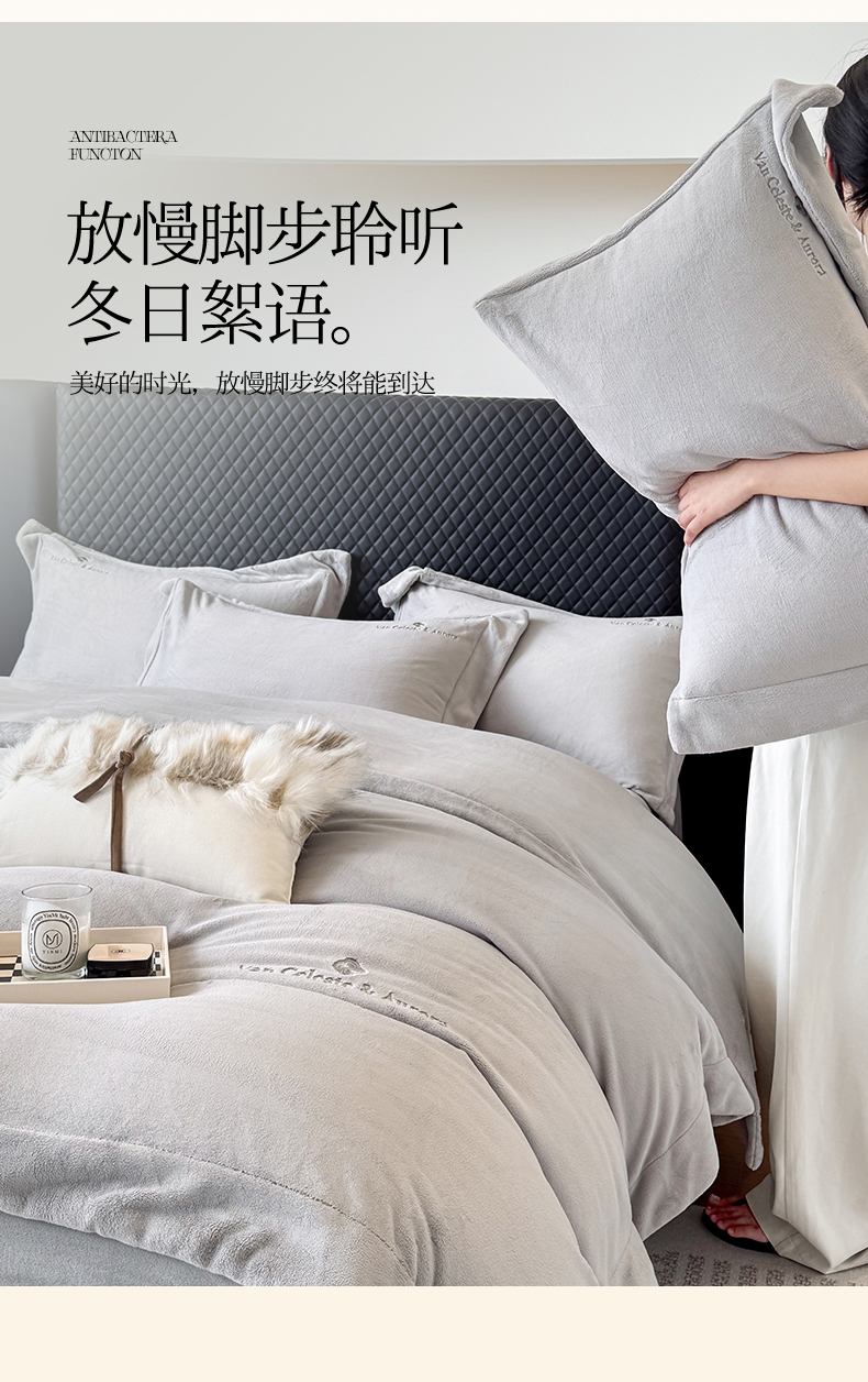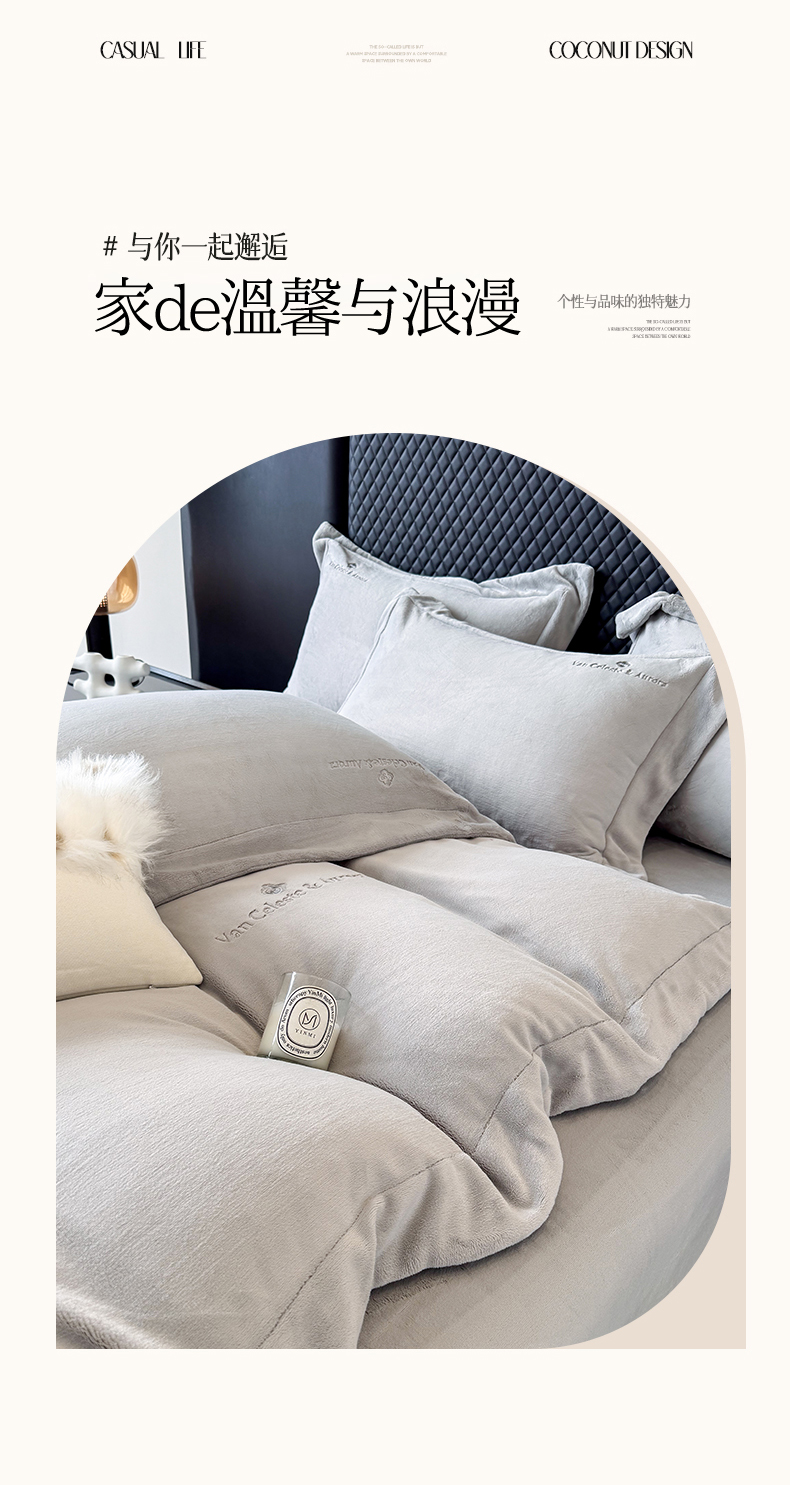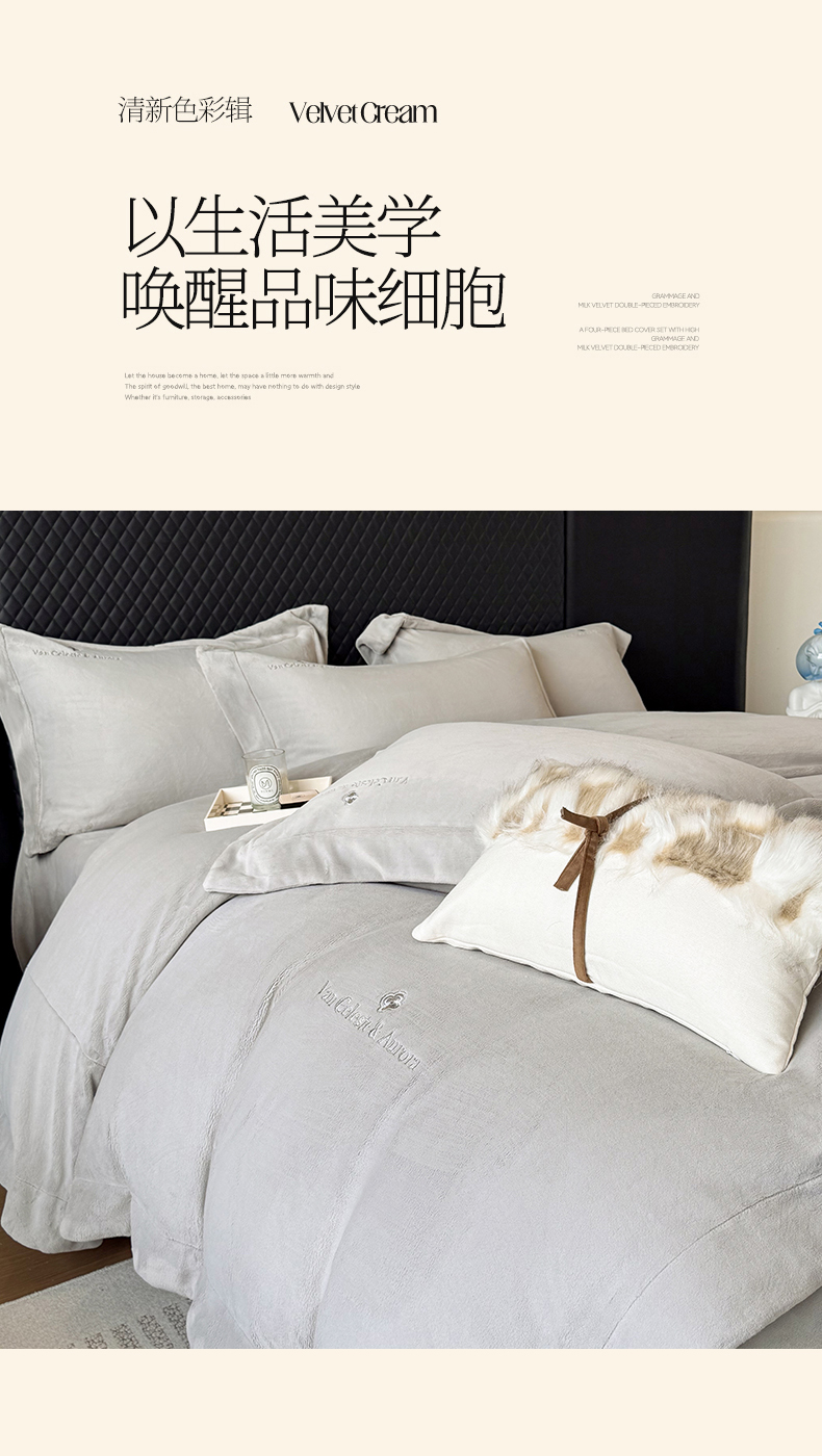 泽西家纺+V17798841158发大图 2025新品秋冬加厚保暖240克奶肤绒简约风刺绣牛奶绒四件套-梵克雅宝 梵克雅宝-高级灰