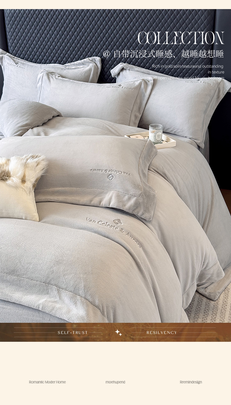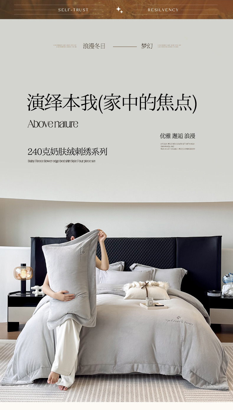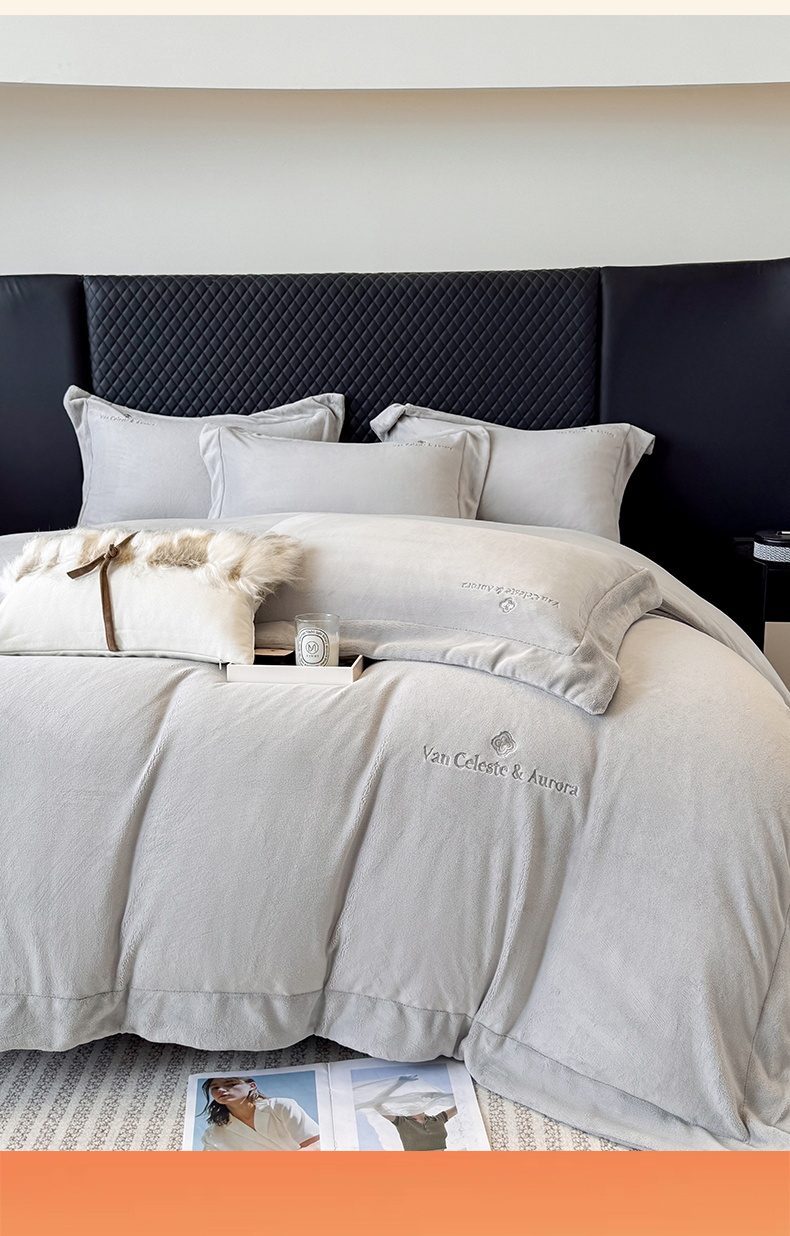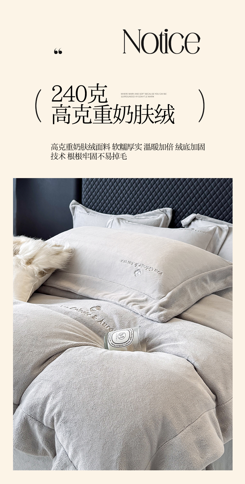 泽西家纺+V17798841158发大图 2025新品秋冬加厚保暖240克奶肤绒简约风刺绣牛奶绒四件套-梵克雅宝 梵克雅宝-高级灰