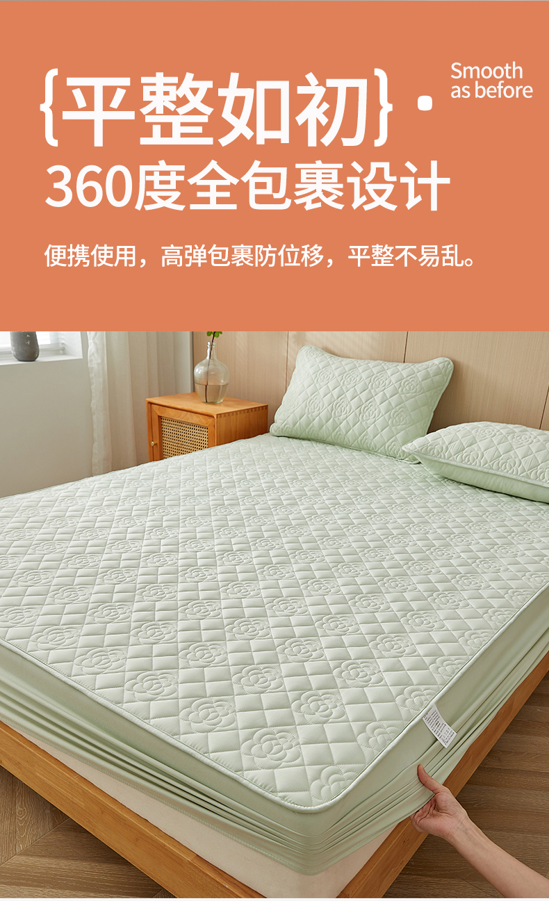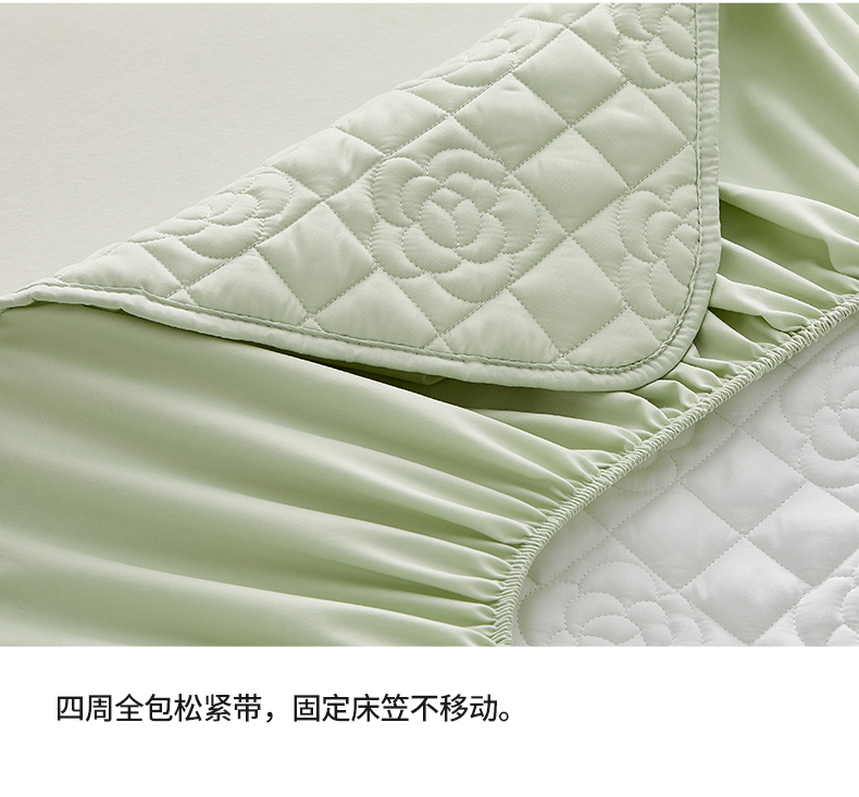 卓越家纺 2025新款山茶花款防水夹棉床笠 山茶花-水绿
