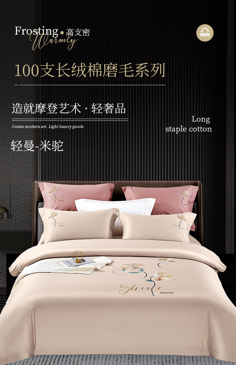 浩情国际婚庆供货中心 2026新品- 秋冬高支密全棉长绒棉磨毛高端刺绣系列四件套 轻曼-米驼