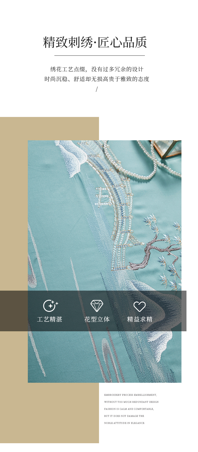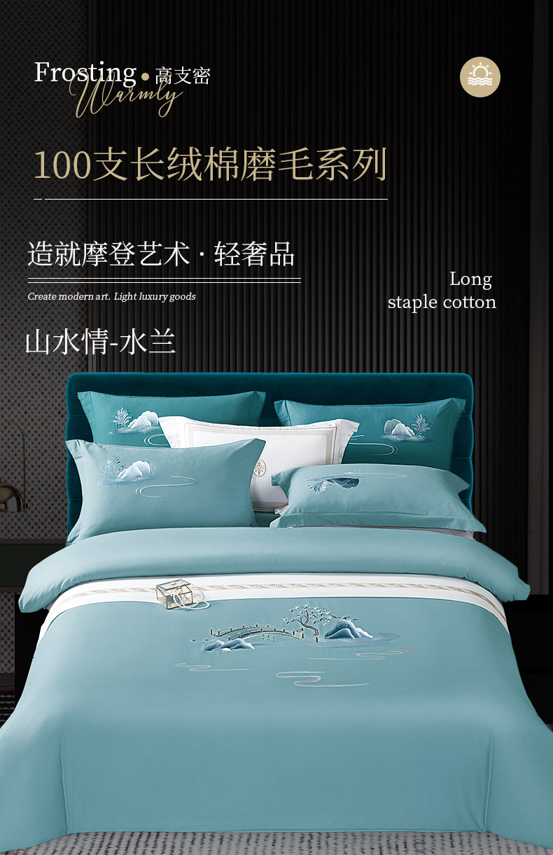 浩情国际婚庆供货中心 2026新品-100支全棉长绒棉磨毛高端刺绣系列四件套 山水情-水兰