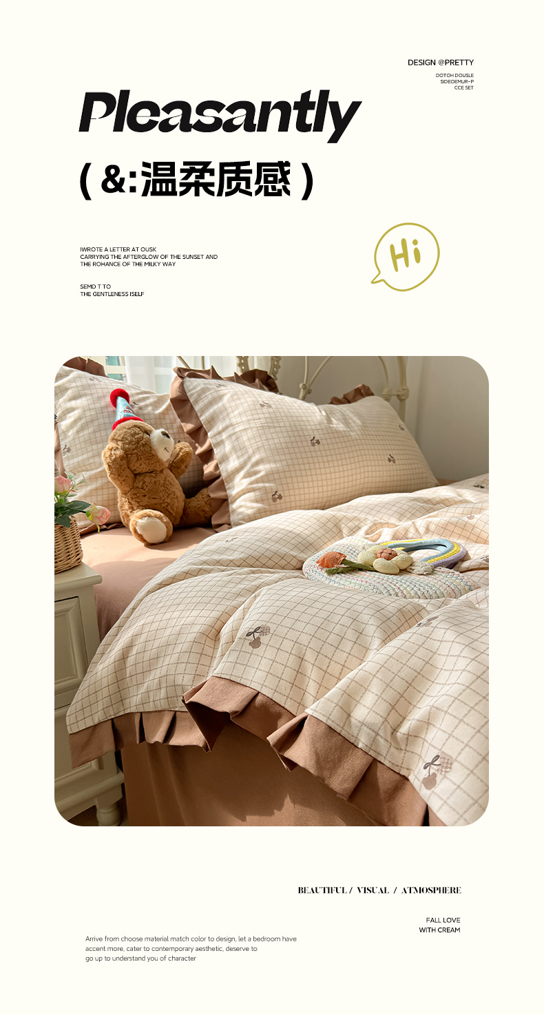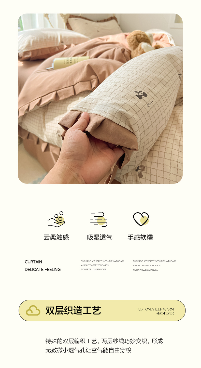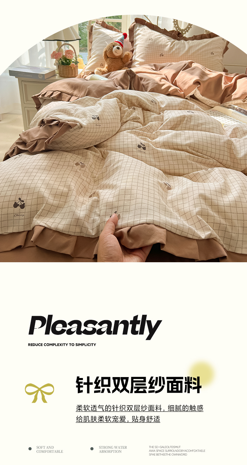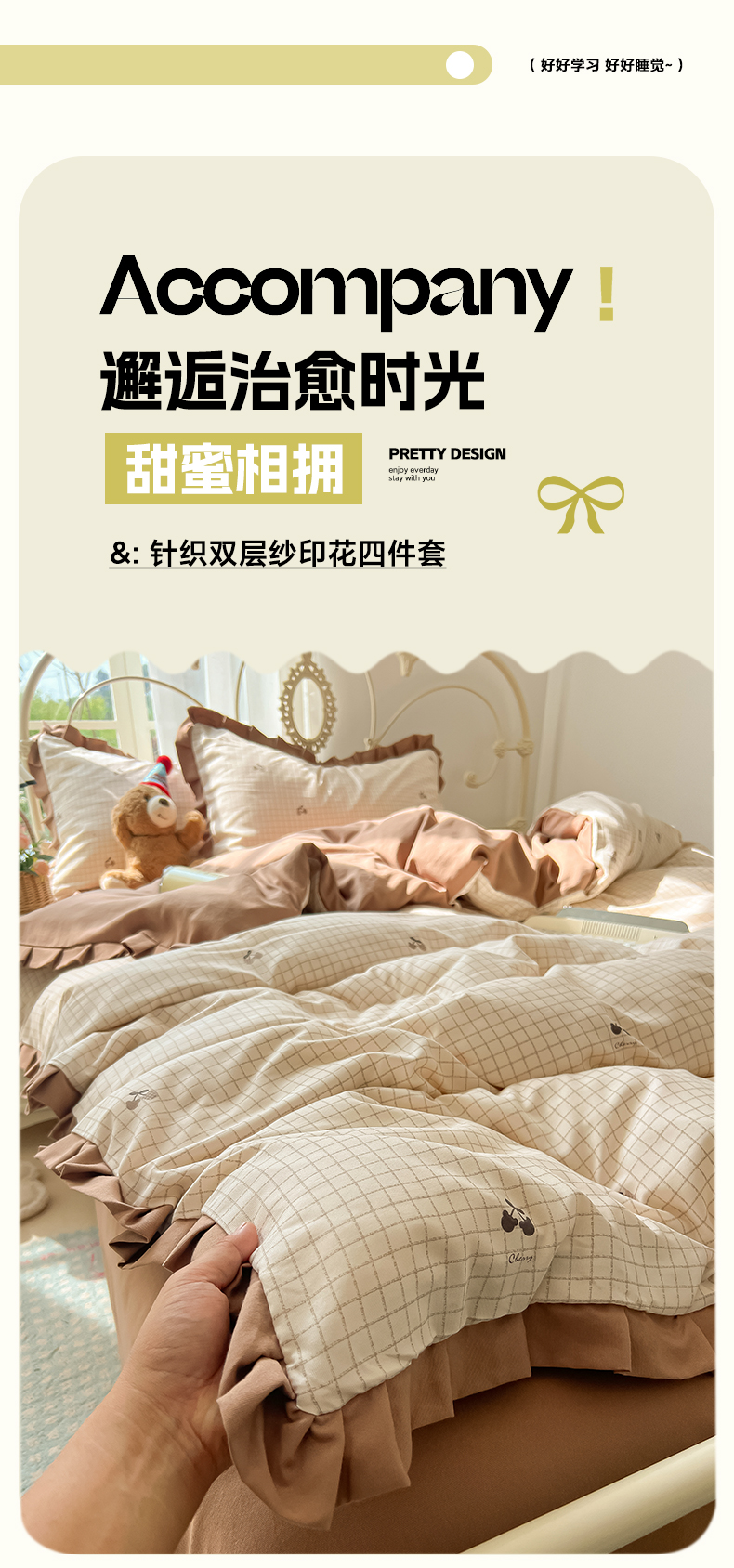 当前位置: 91家纺网 > 商品网购 > 床品套件 > 四件套 > 双层纱四件套 > 韩巢家纺 2026新款花边款针织双层纱四件套 巧克力