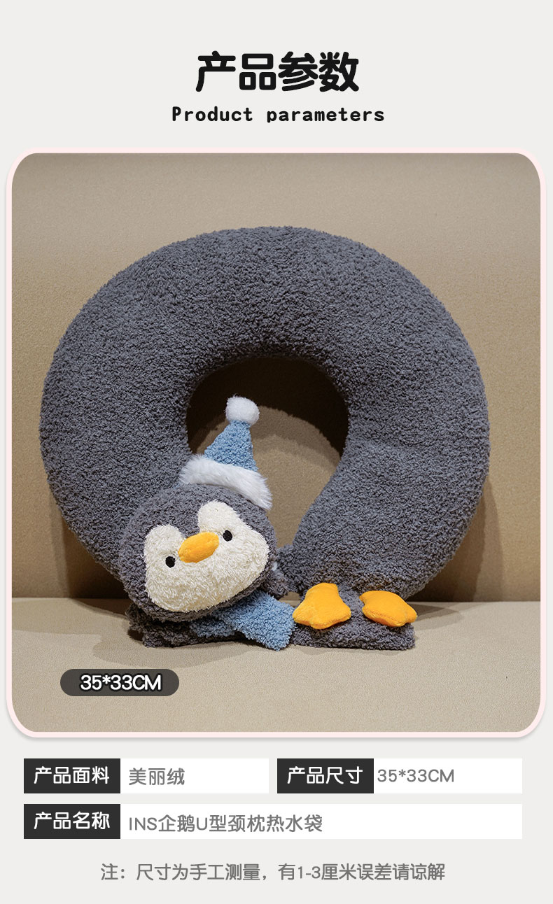 当前位置: 91家纺网 > 商品网购 > 居家日用 > 其他分类 > 仟亿莱 2025新款ins企鹅u型颈枕热水袋 U型灰色企鹅 35*33cm/个