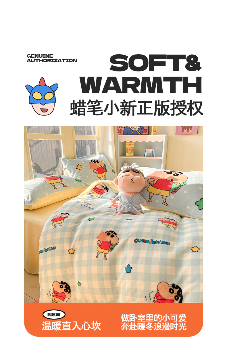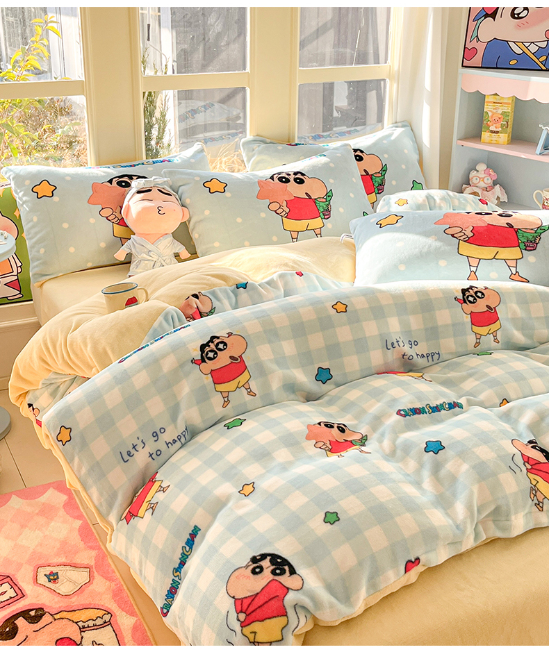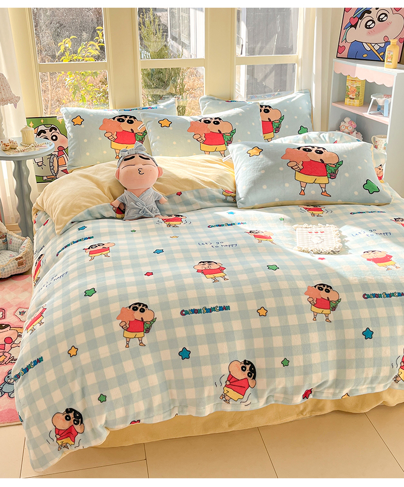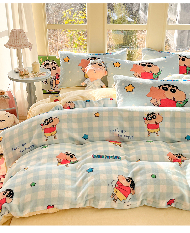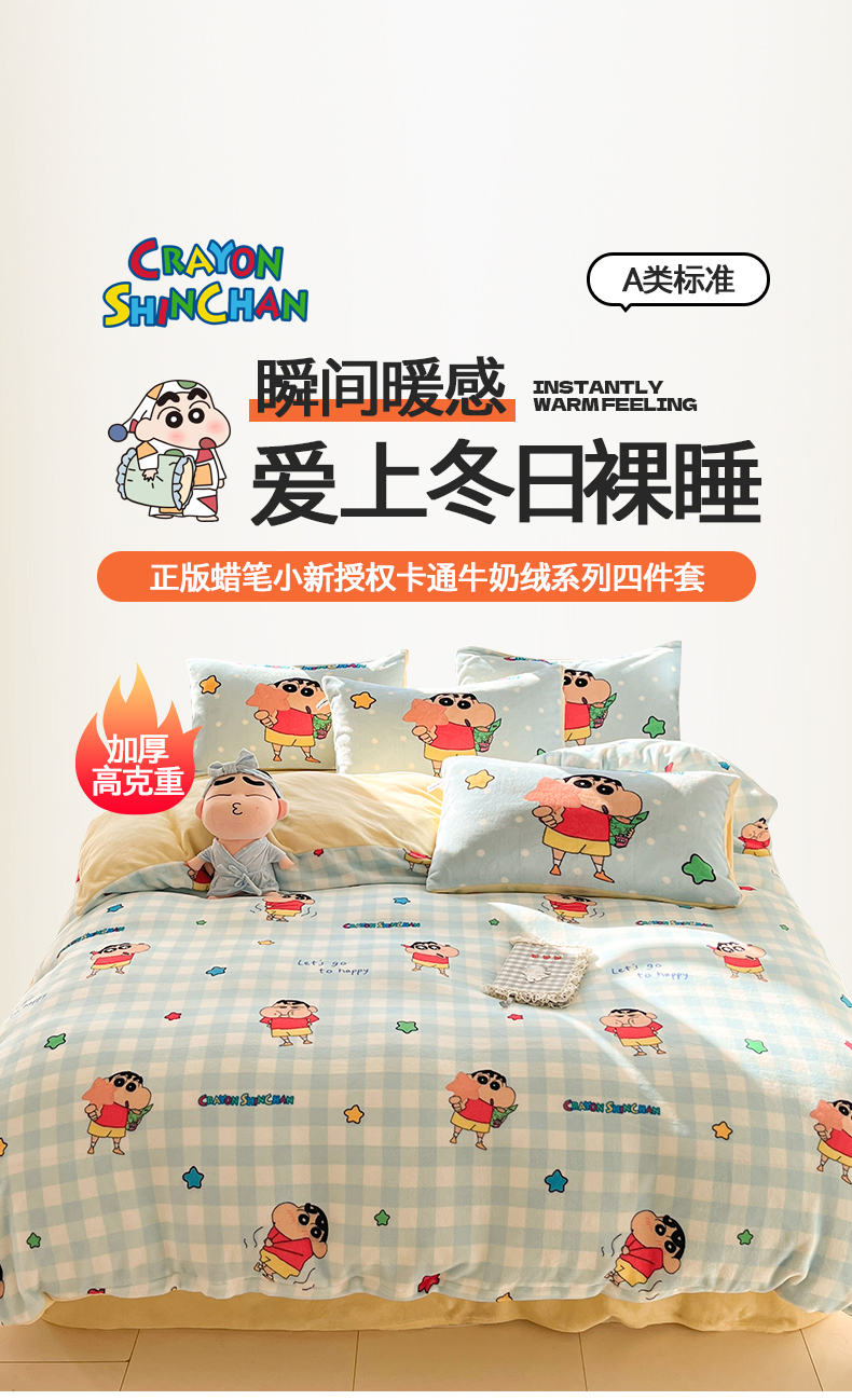 (总)桃子家居 2026新款A类蜡笔小新正版授权卡通加厚高克重牛奶绒系列四件套,绒-欢乐小新,绒-蓝格星星小新,绒-贪睡小新,绒-幸福小新