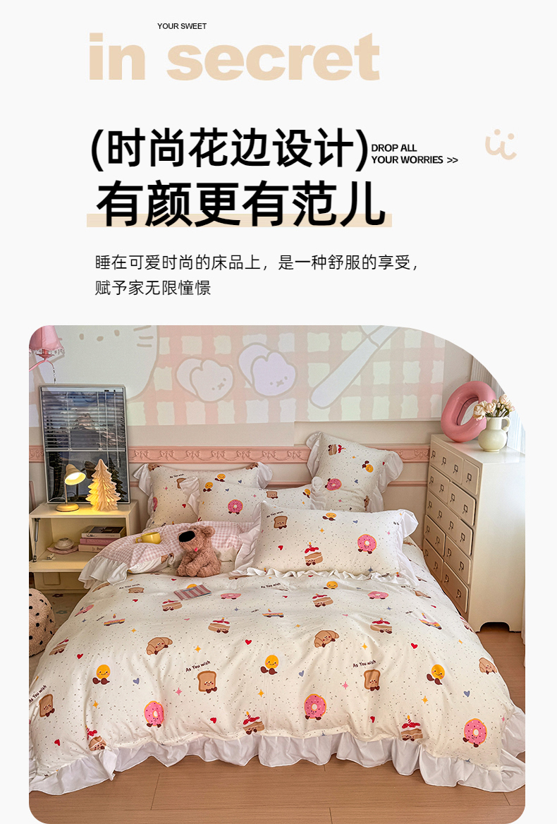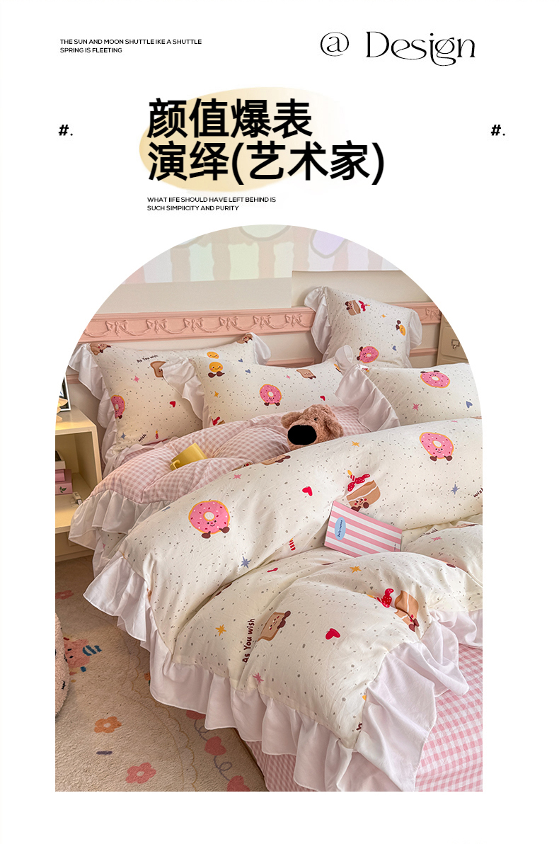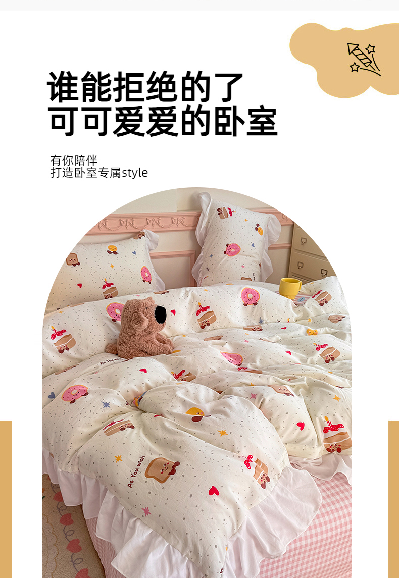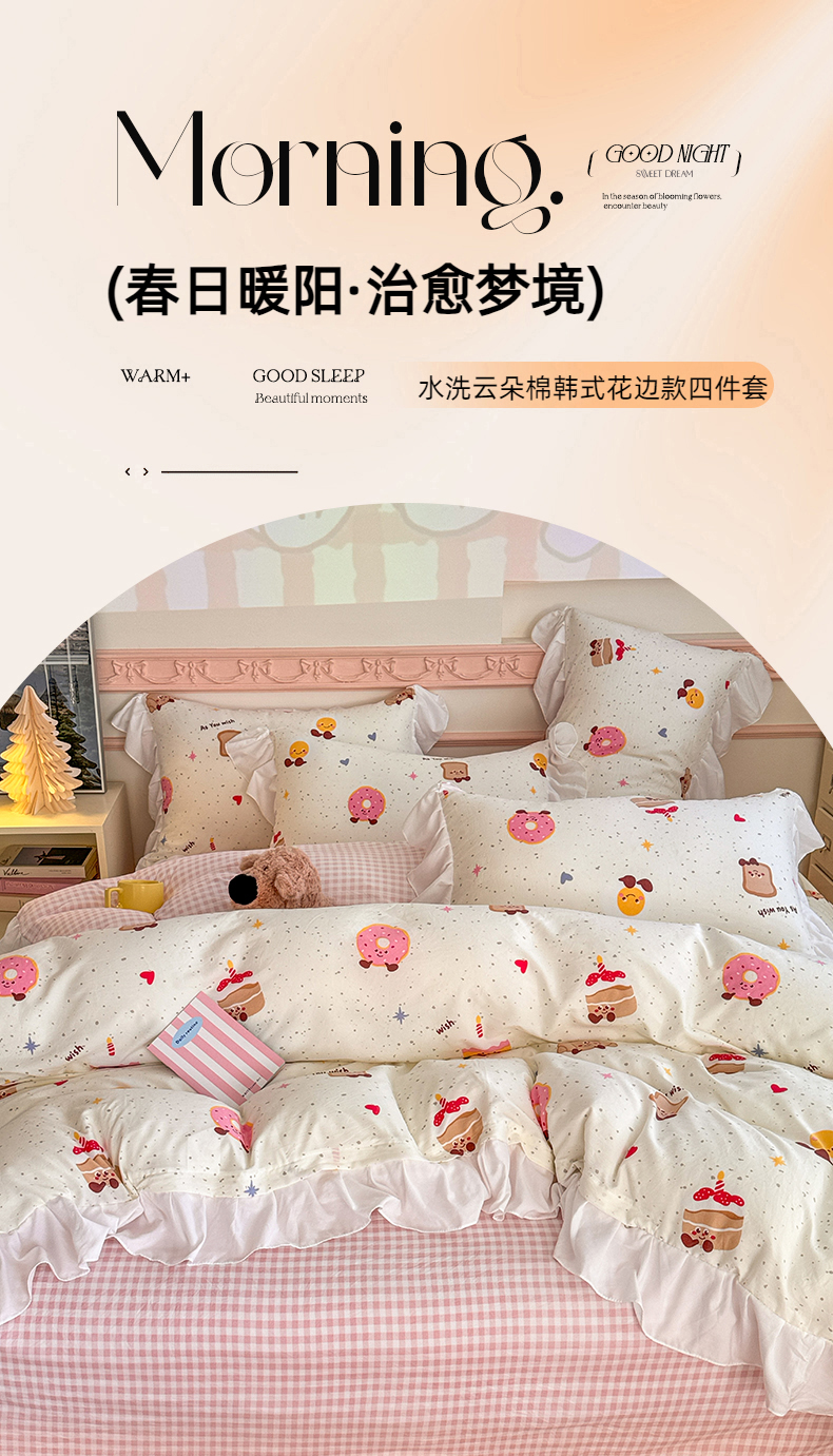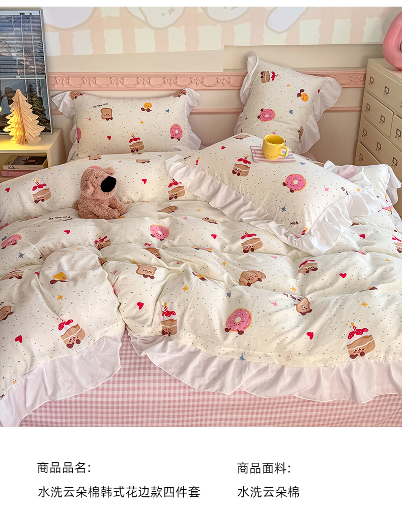 当前位置: 91家纺网 > 商品网购 > 床品套件 > 四件套 > 水洗棉四件套 > 温眠家纺 2025新款水洗云朵棉韩式INS减龄花边款四件套 蛋糕仔仔