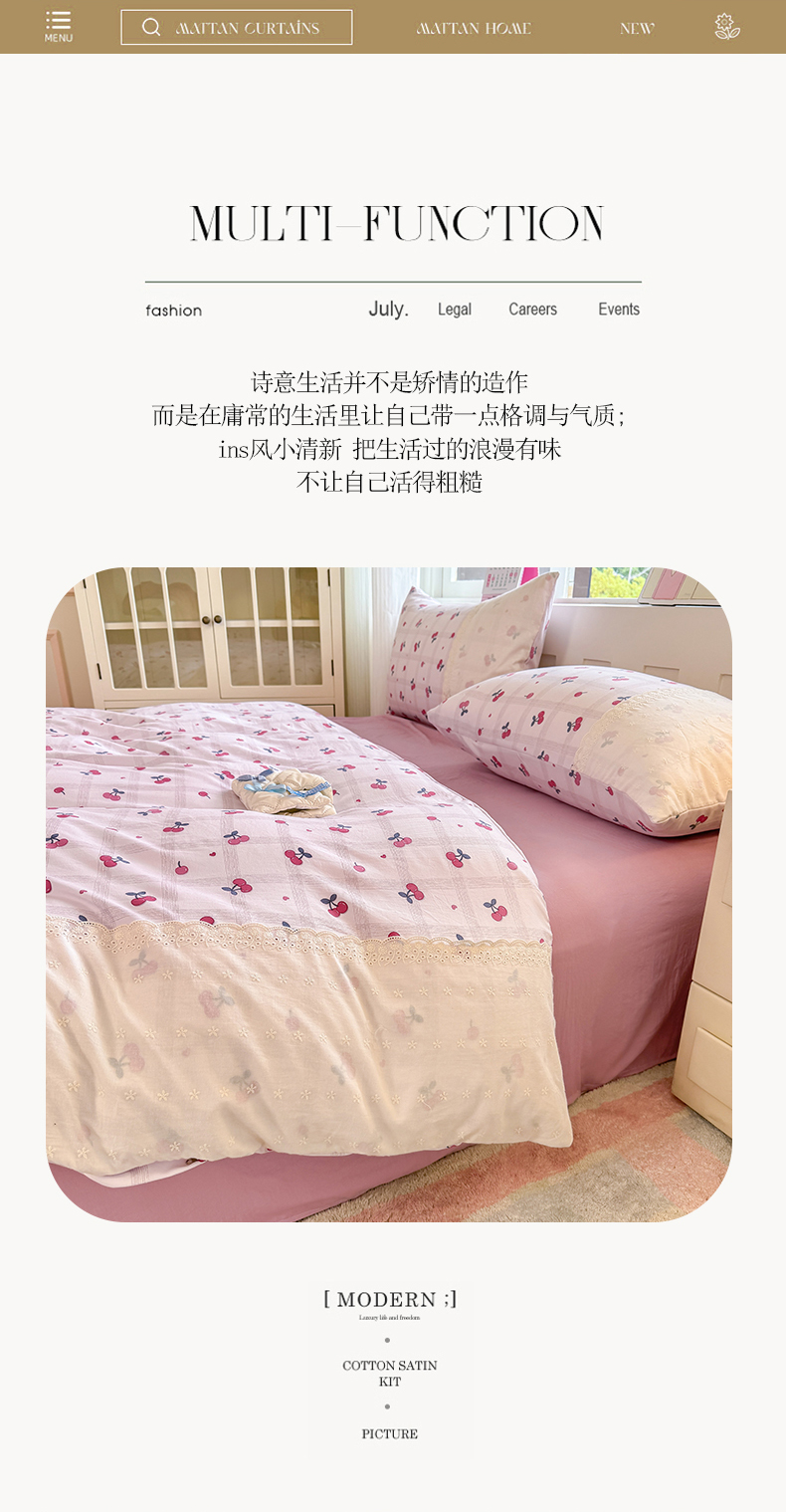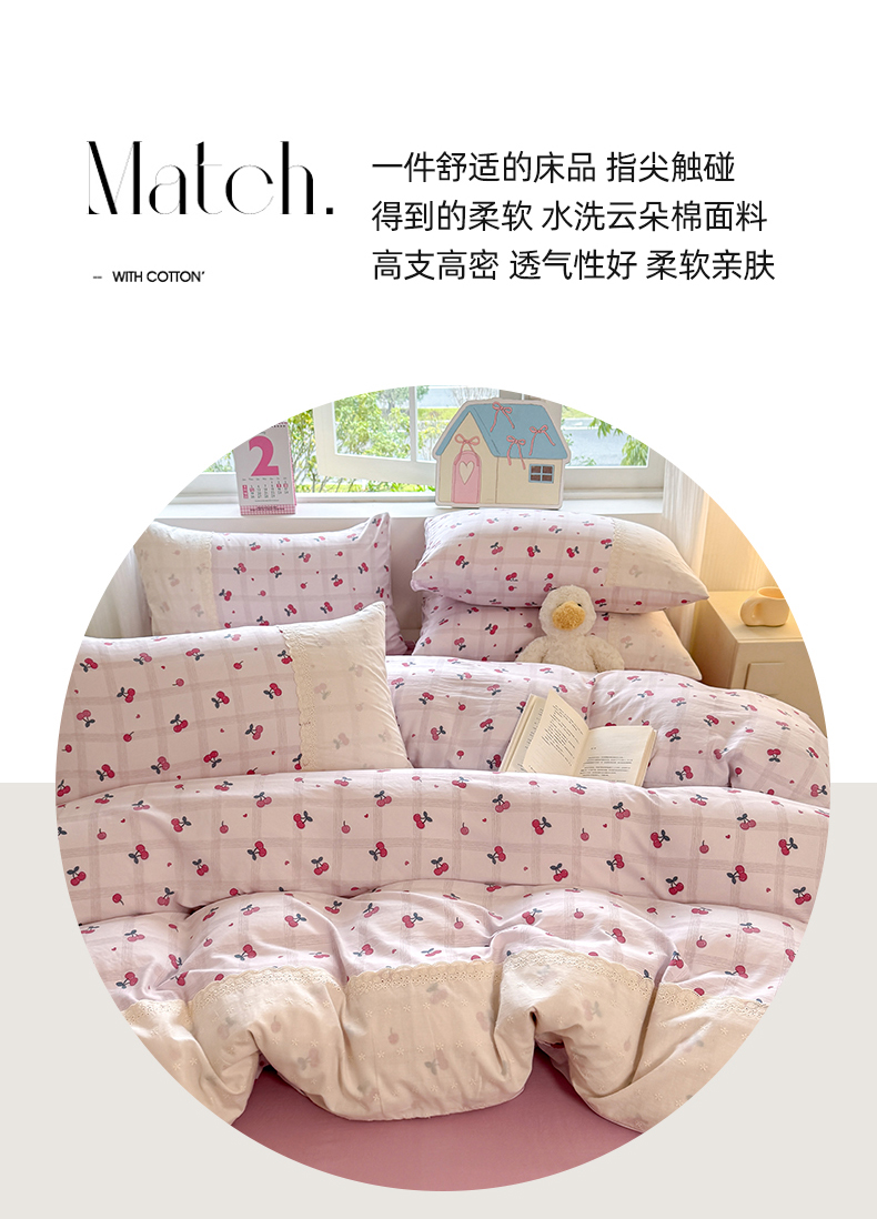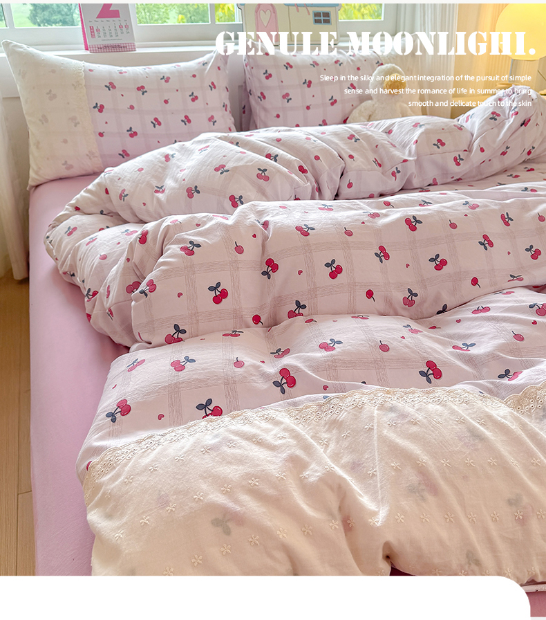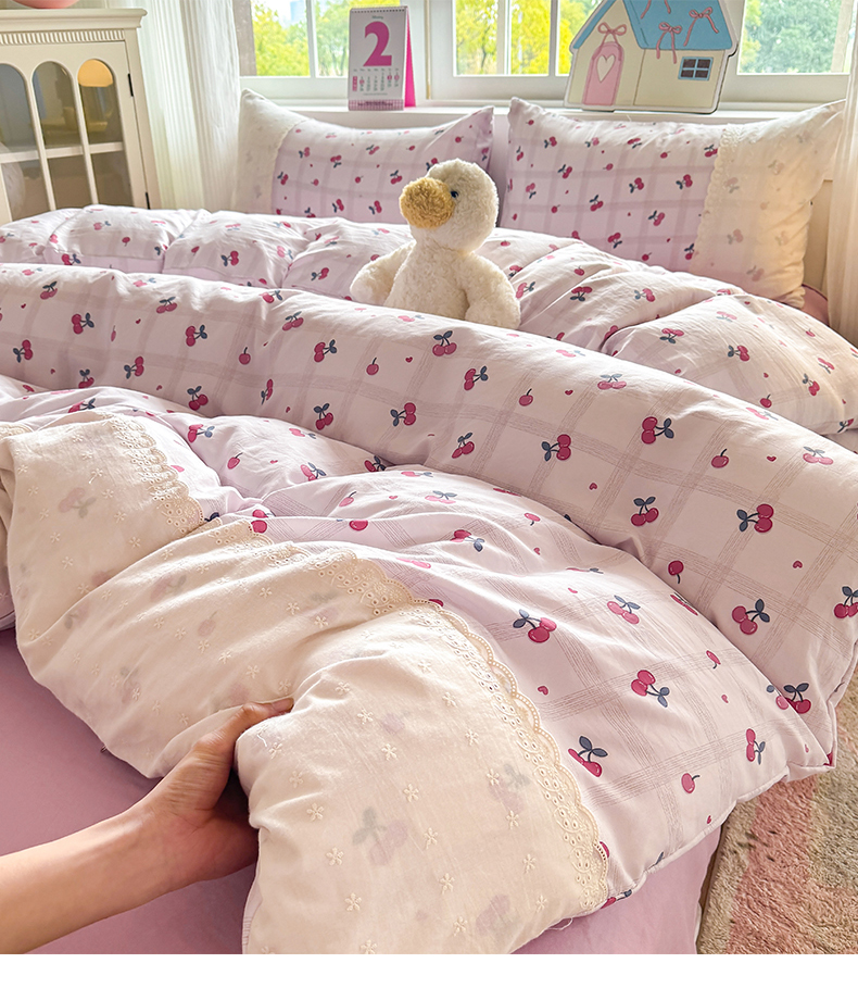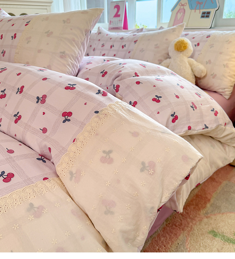 当前位置: 91家纺网 > 商品网购 > 床品套件 > 四件套 > 水洗棉四件套 > 温眠家纺 2025新款ins风小清新镂空花边水洗云朵棉四件套-风格一 樱桃