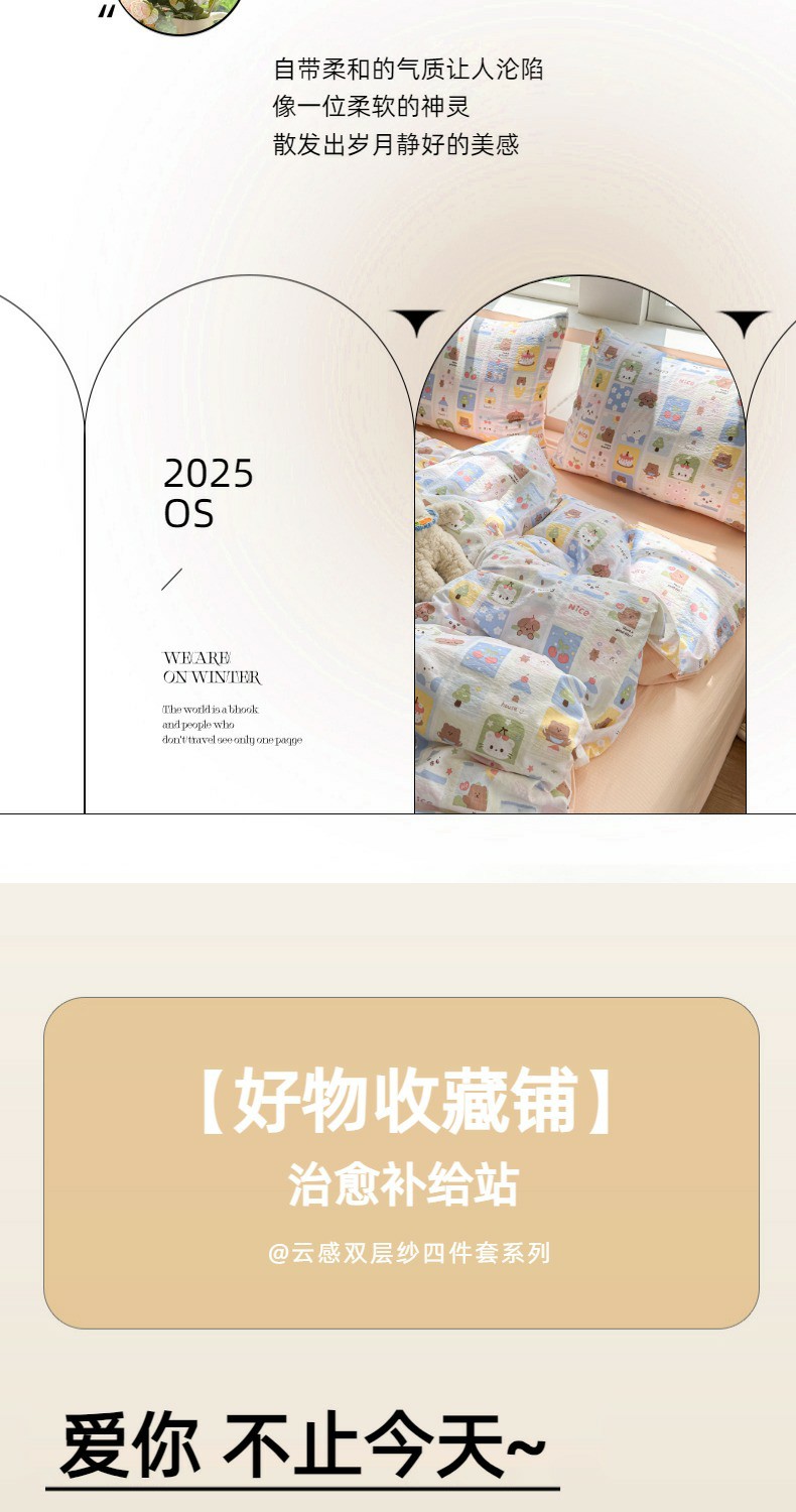(总)温眠家纺 2026新款敲可爱的奶呼呼云感双层纱简约四件套系列-超级治愈~,裙子小兔,暗夜玫瑰,大脸二胡猫-粉,大脸二胡猫-咖,大脸二胡猫-蓝,蛋糕派,动物游园,蝴蝶剪影,见花则喜,焦糖樱桃,镜子里的兔,蓝莓奶糖,铃兰结,六子棋-绿,木马,奶昔甜糕,苹果小怪,葡萄多多,俏皮狗,切块草莓猫,清风与雾-蓝,苏瑾,童年木马,像素小猫,烟紫,一口青苹果,樱桃奶球,竹歆花语