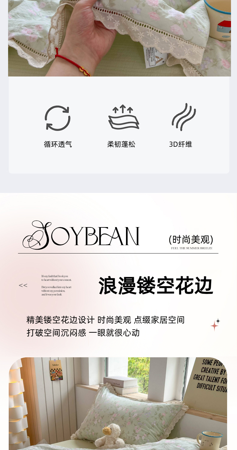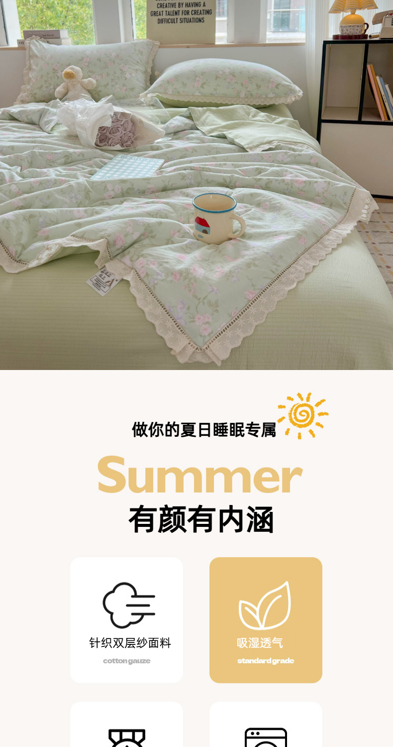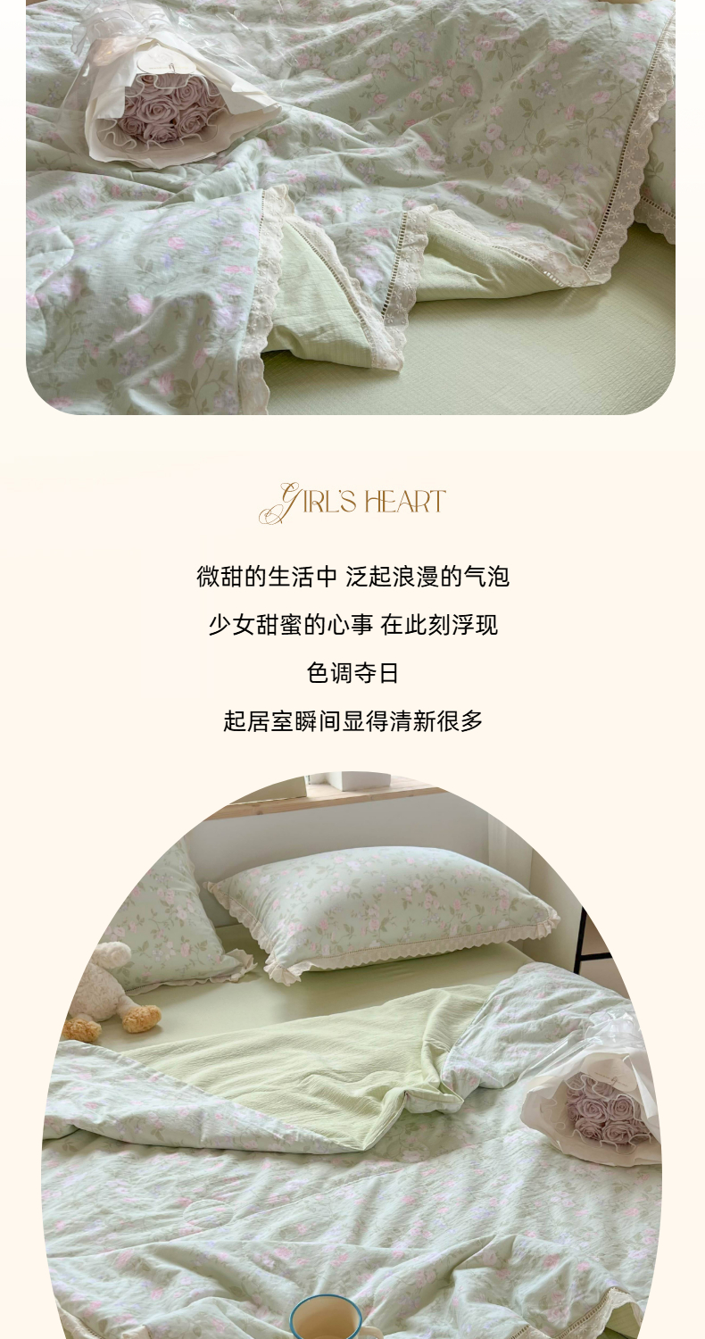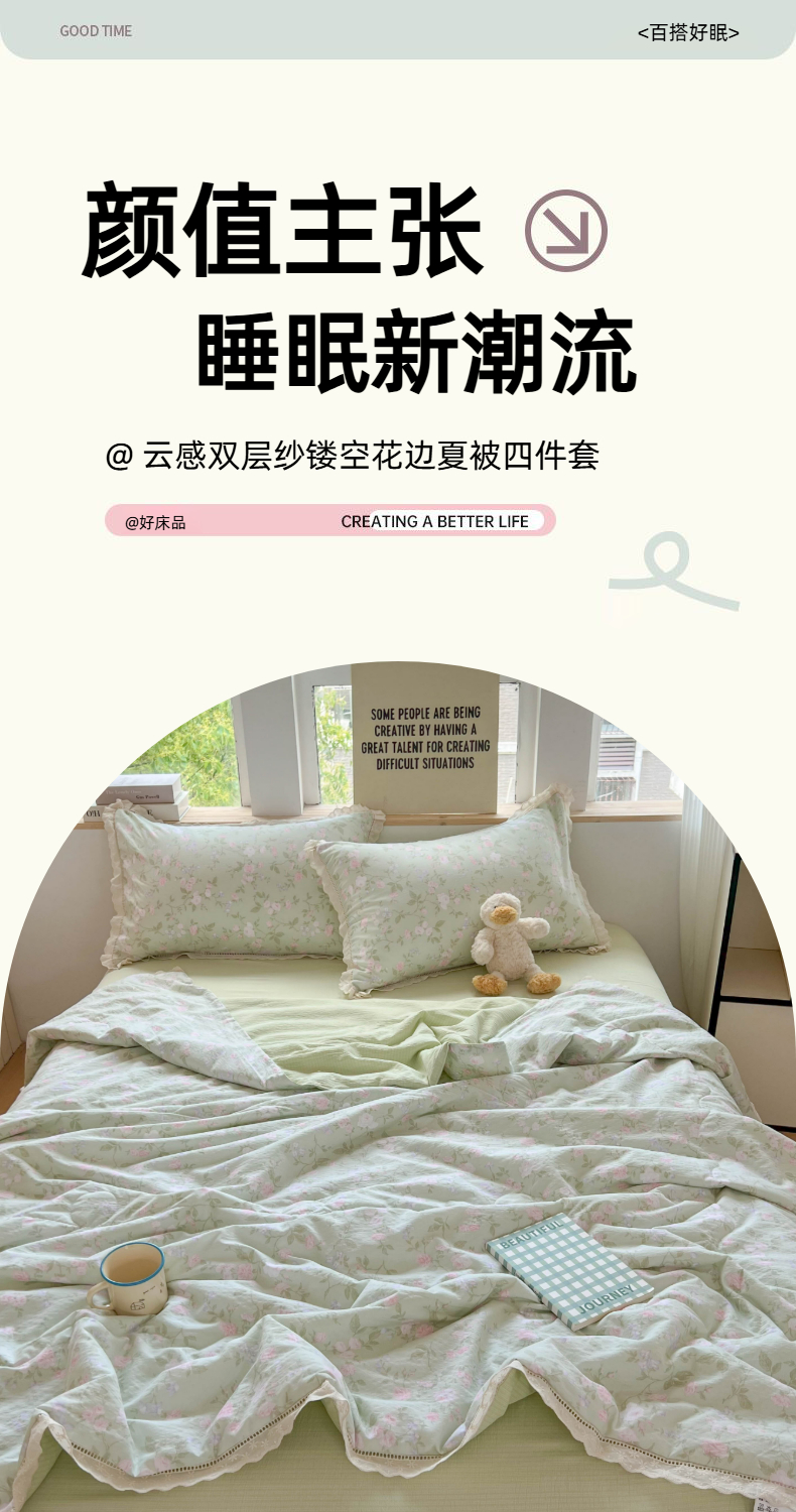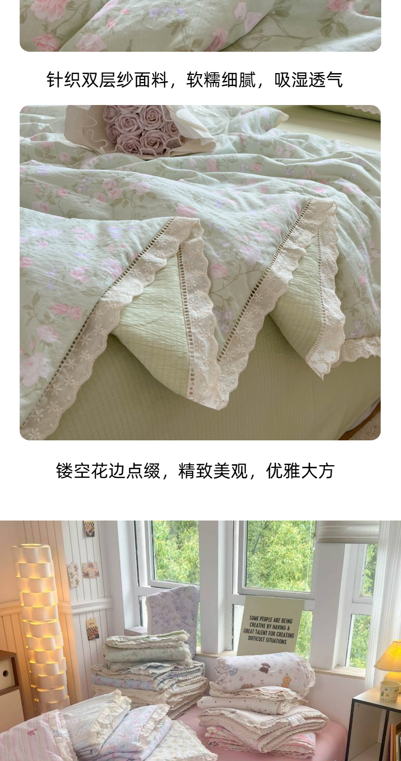 商品名称:温眠家纺 2025新款云感双层纱镂空花边夏被四件套 木槿绿