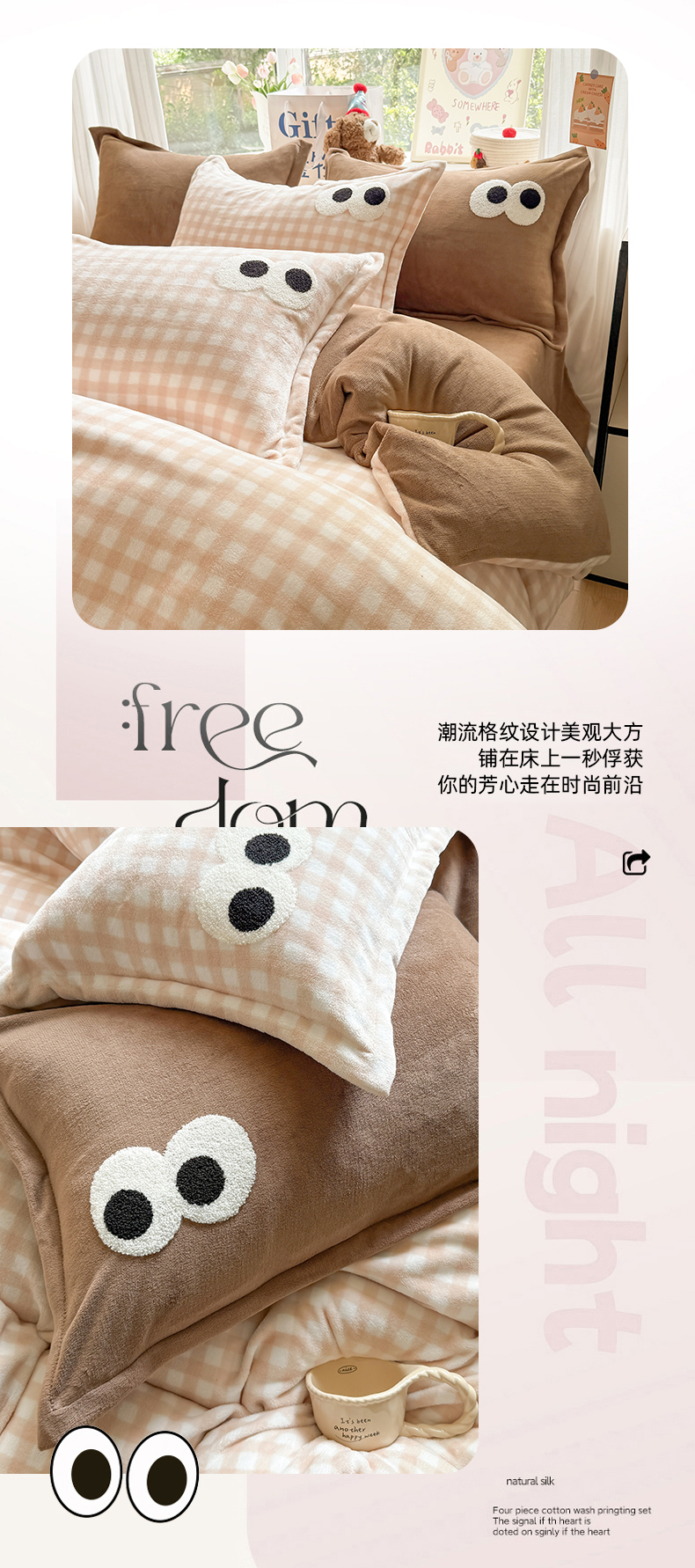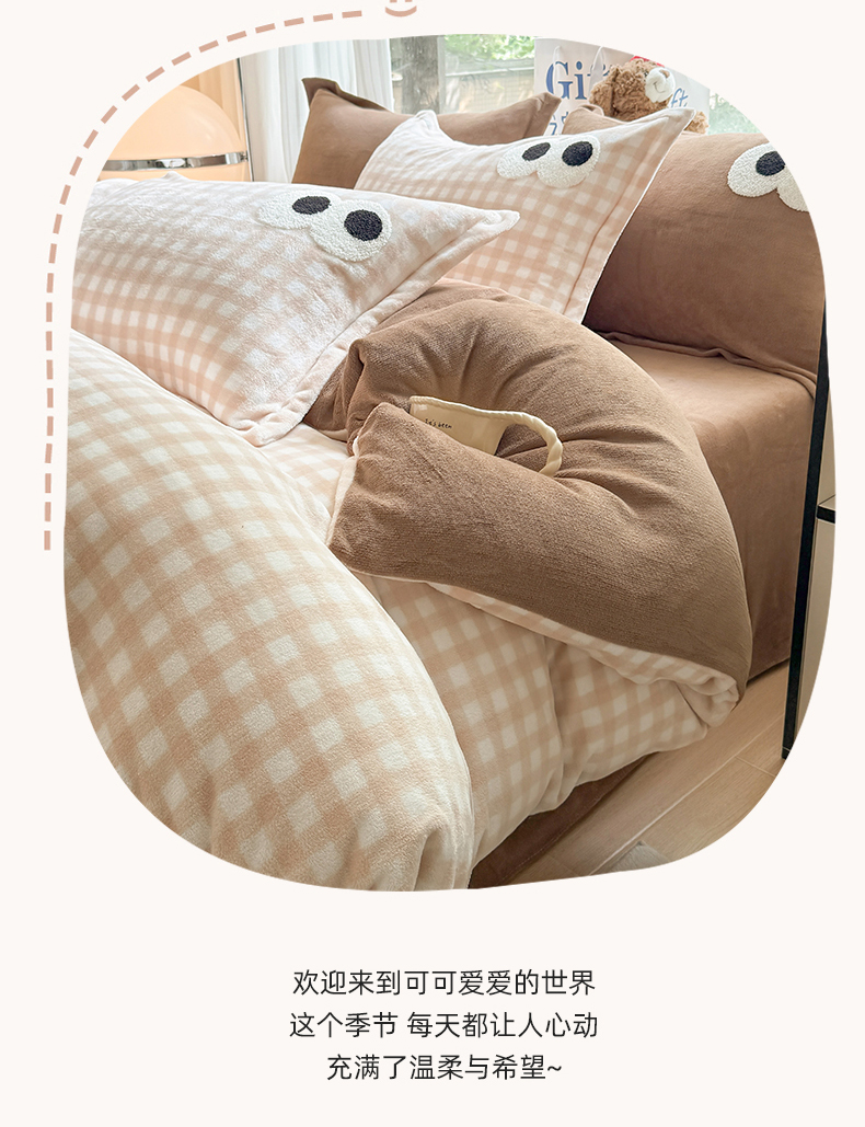 温眠家纺 2025新款ins加厚毛巾绣大眼睛混搭撞色奶油格子牛奶绒四件套 绒-咖格卡其