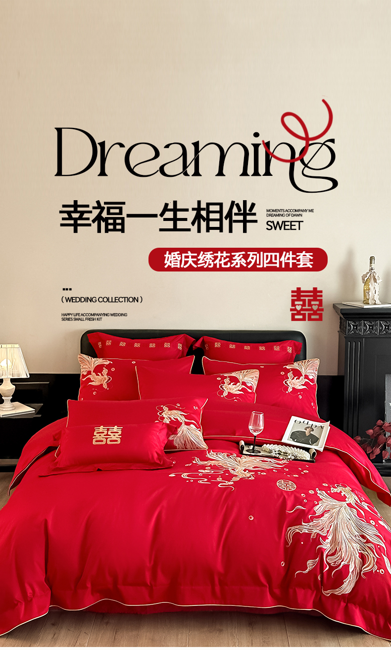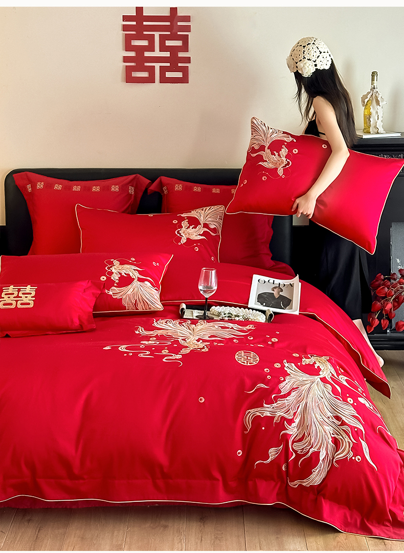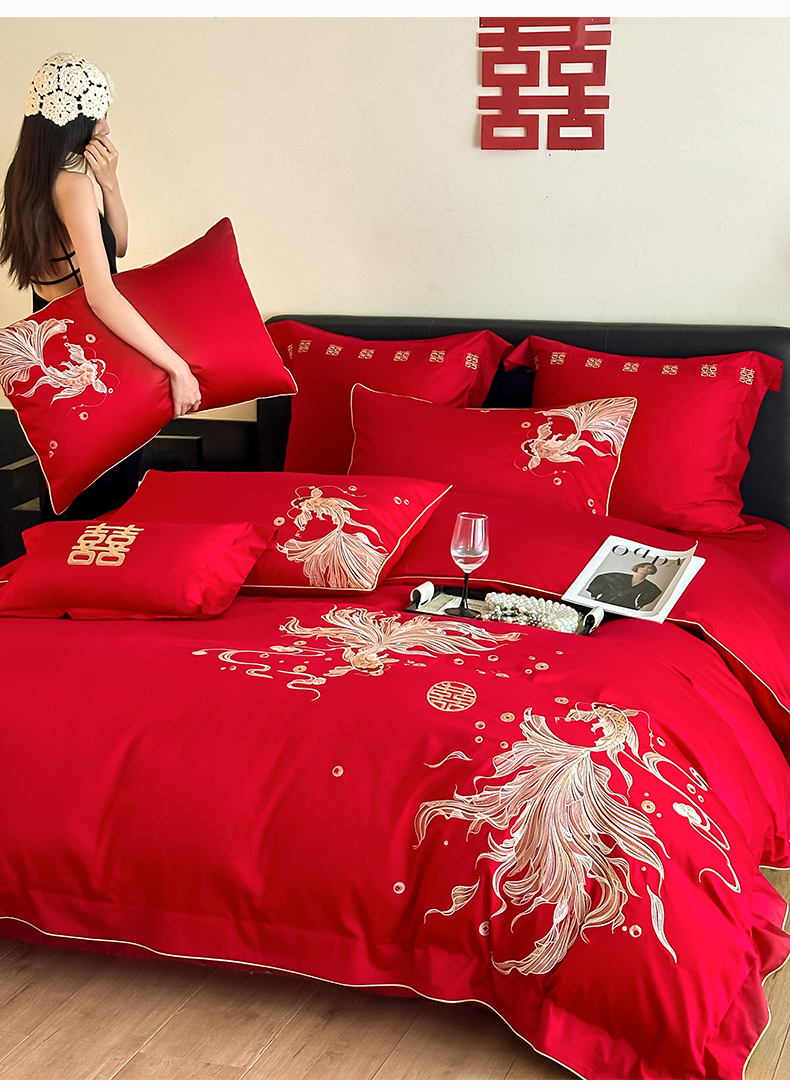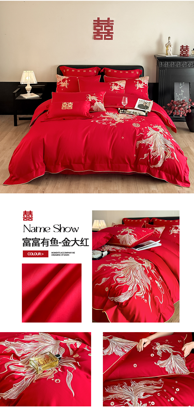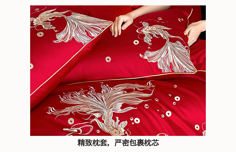 当前位置: 91家纺网 > 商品网购 > 床品套件 > 四件套 > 婚庆四件套 > 置顶家纺 2026新款小清新亲肤婚庆绣花四件套 富富有鱼-金大红