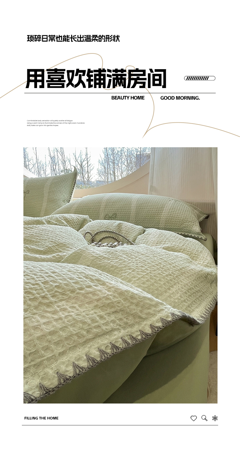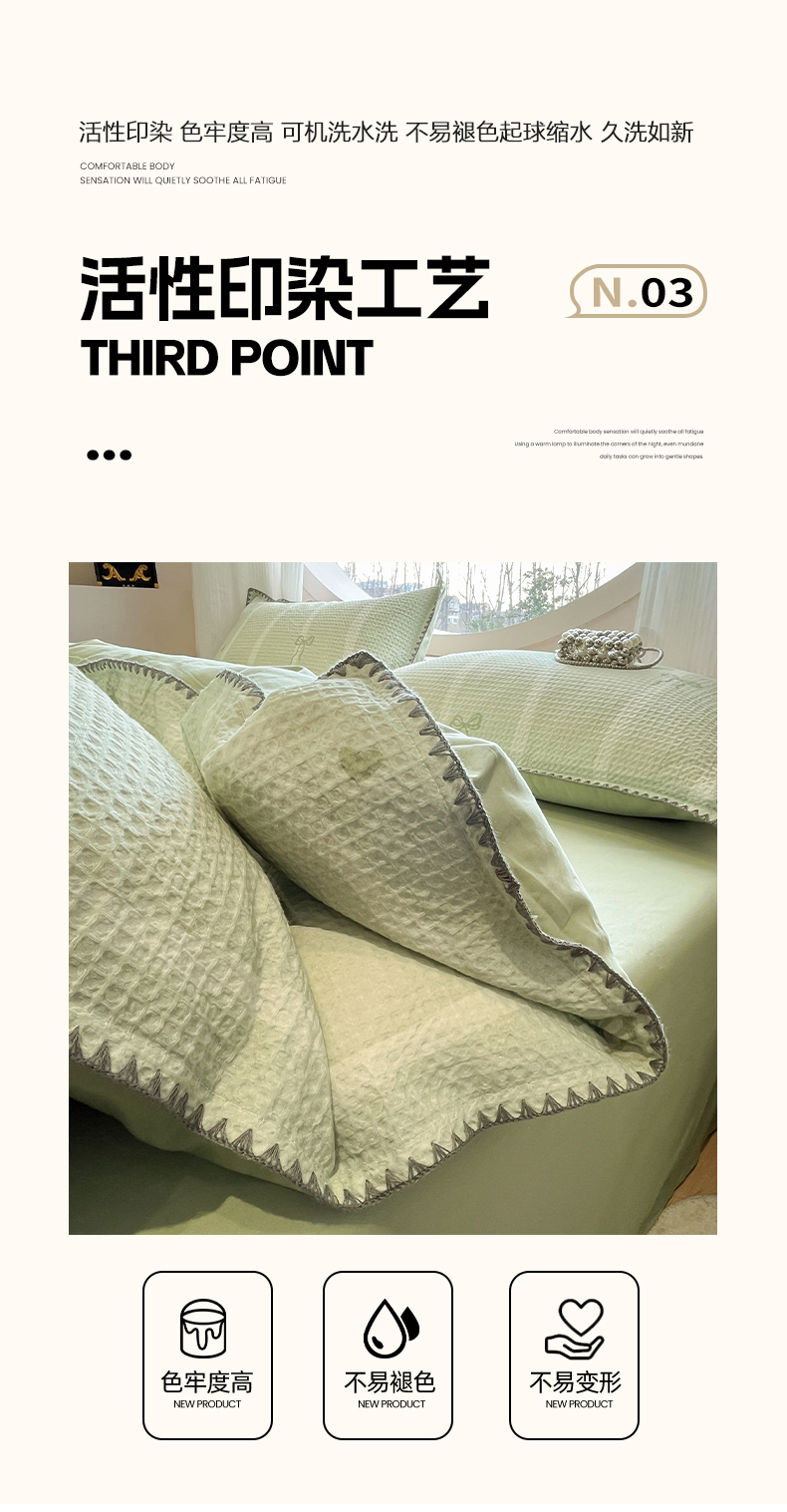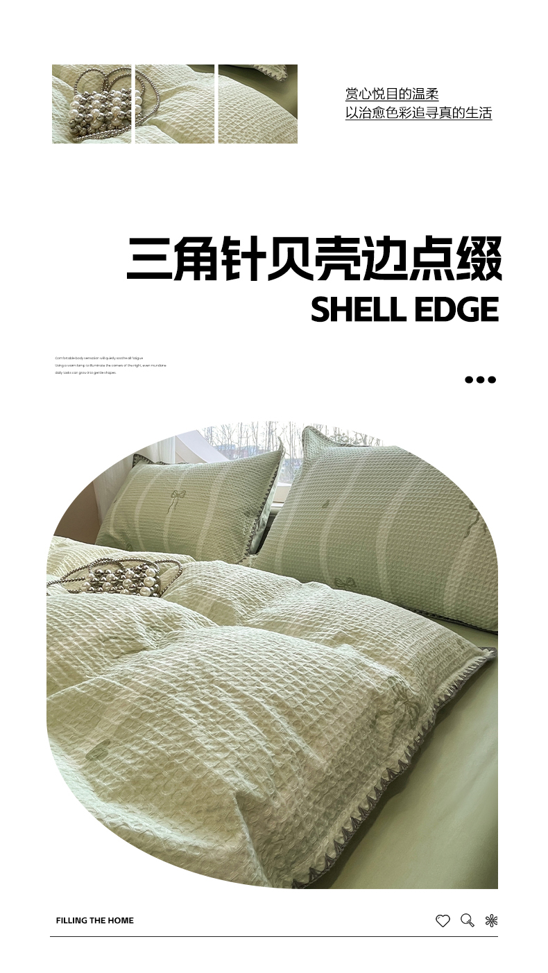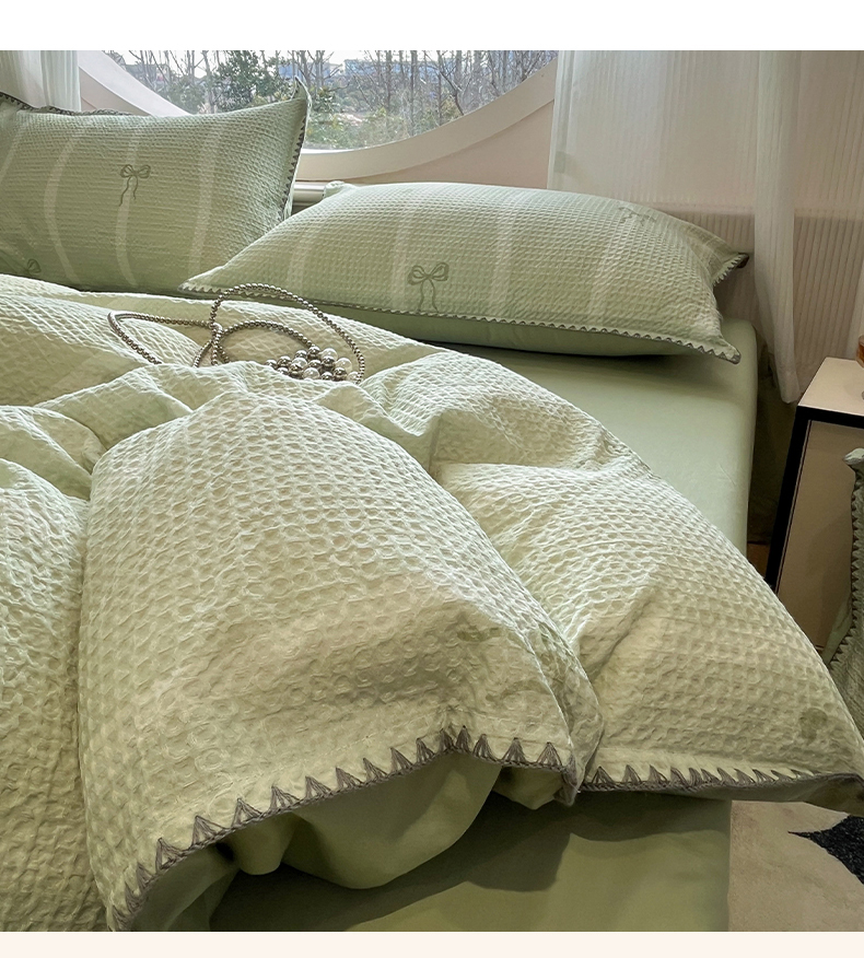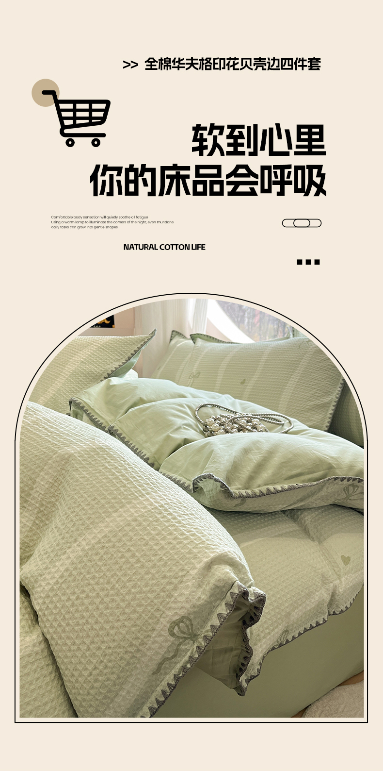 当前位置: 91家纺网 > 商品网购 > 床品套件 > 四件套 > 全棉普通四件套 > 莱茵家居 2026新款A类全棉华夫格印花贝壳边套件-华夫系列 华夫-青提