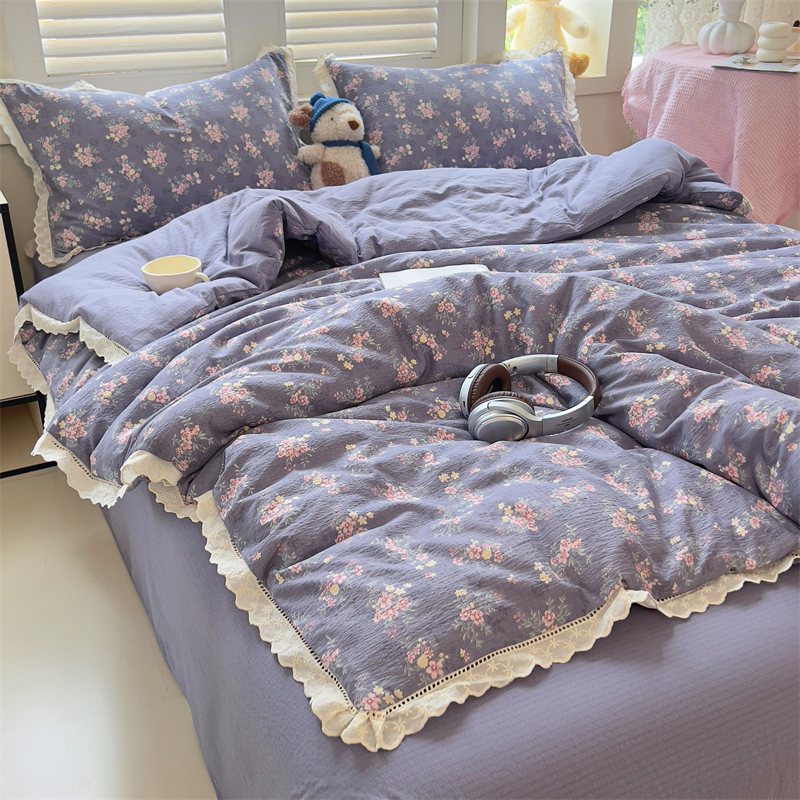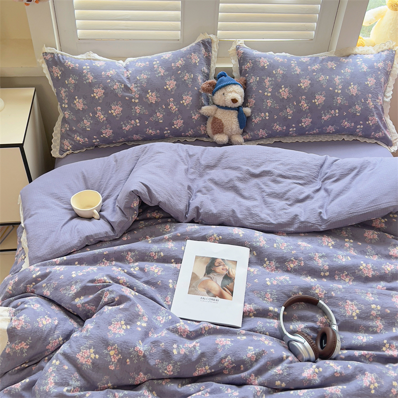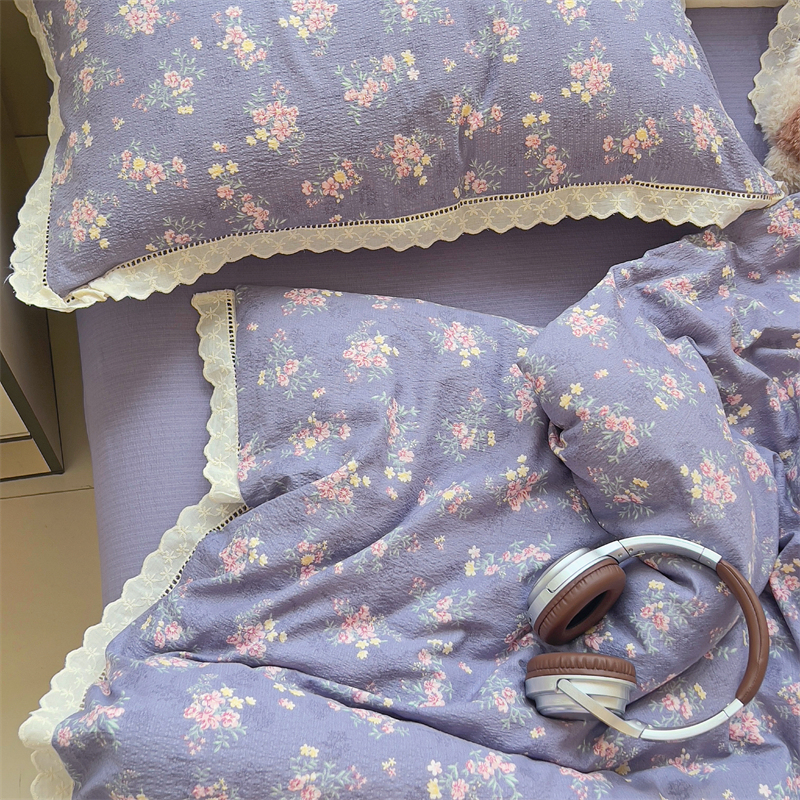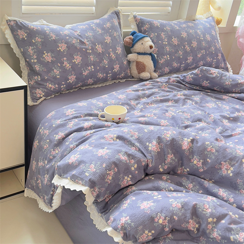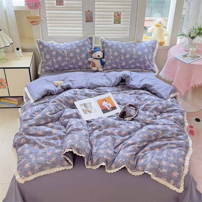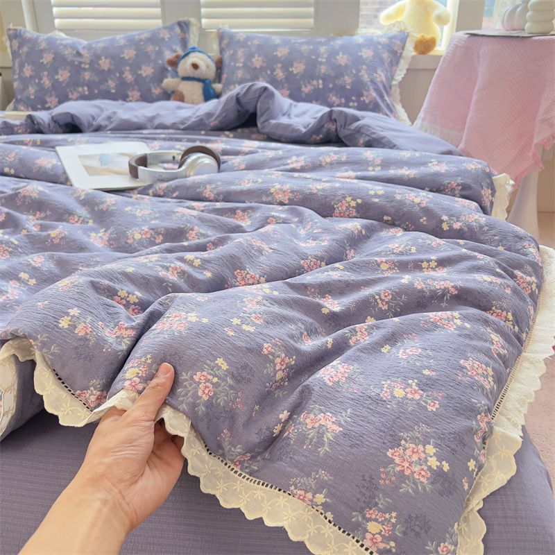 商品名称:壹号库家纺 2026新款云感木棉皱皱纱双层纱四件套-全棉花边款 豆蔻