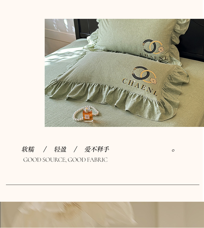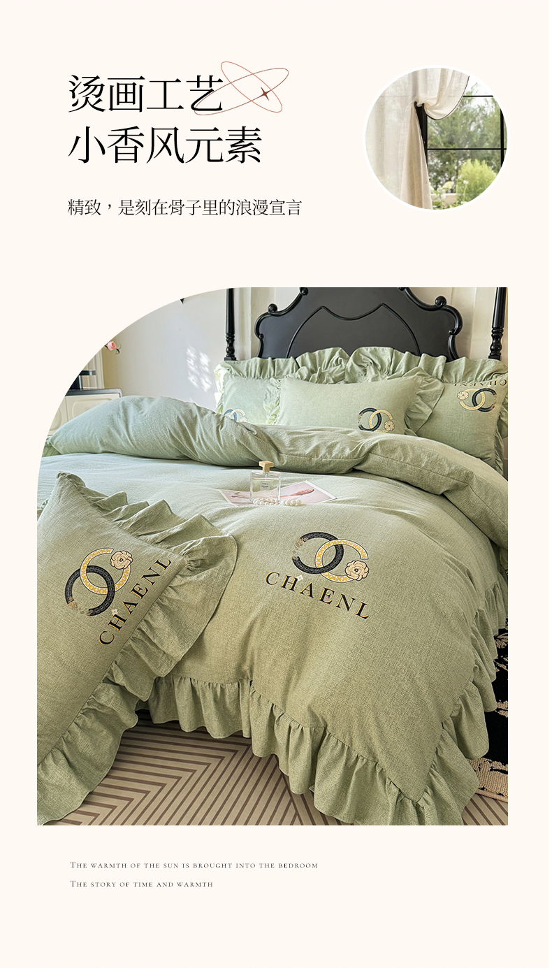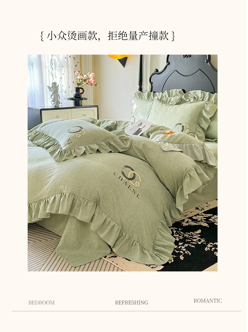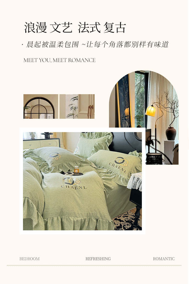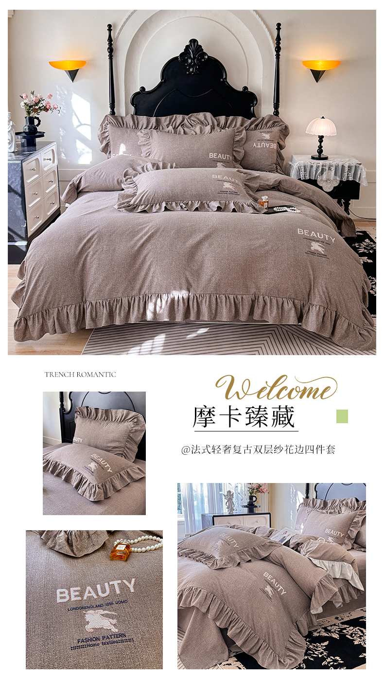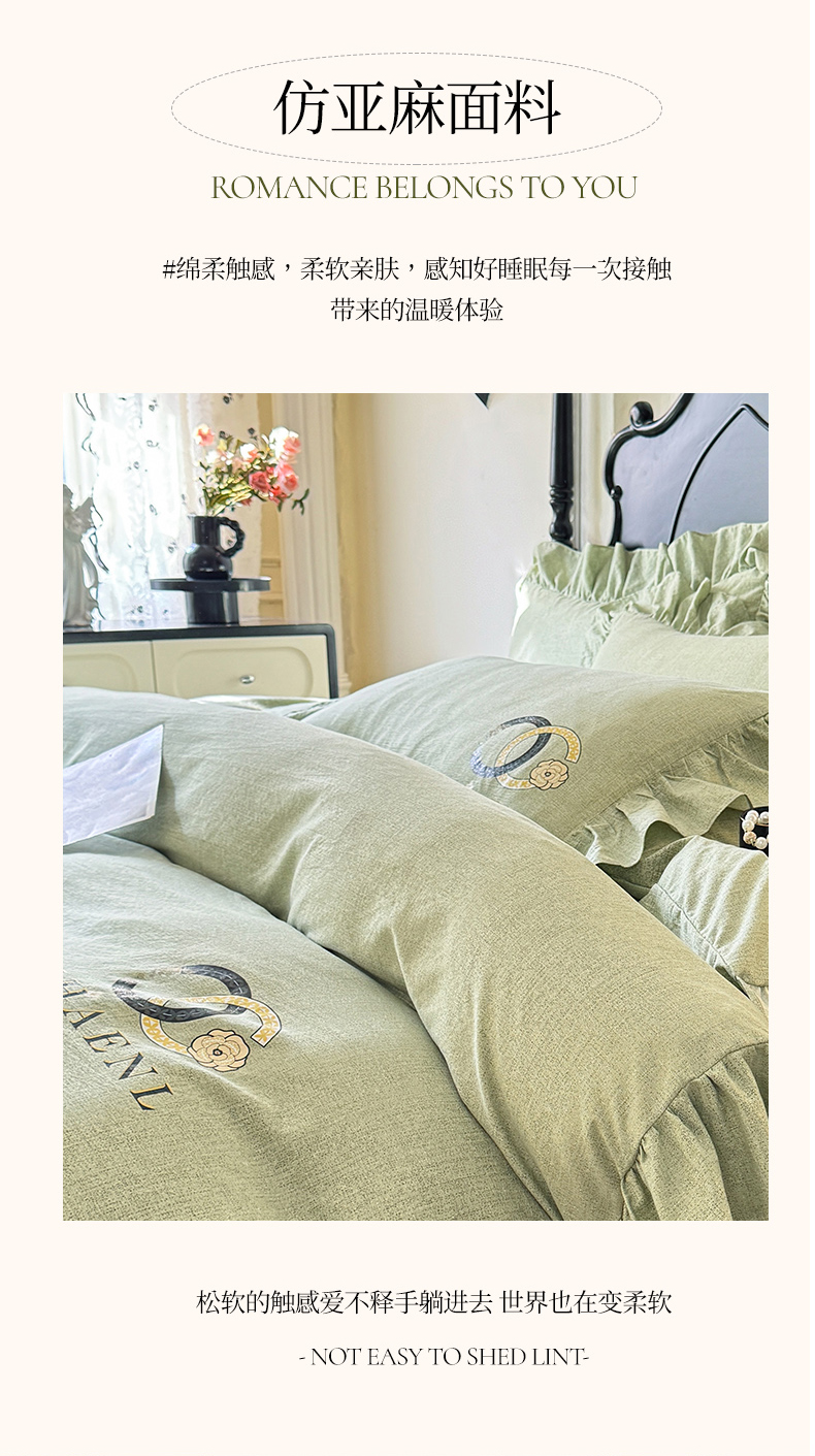 当前位置: 91家纺网 > 商品网购 > 床品套件 > 四件套 > 其它四件套 > 贝凯瑞 2026新款法式轻奢复古仿亚麻木棉皱皱棉双层纱花边四件套-鎏光系列 青榄雅颂