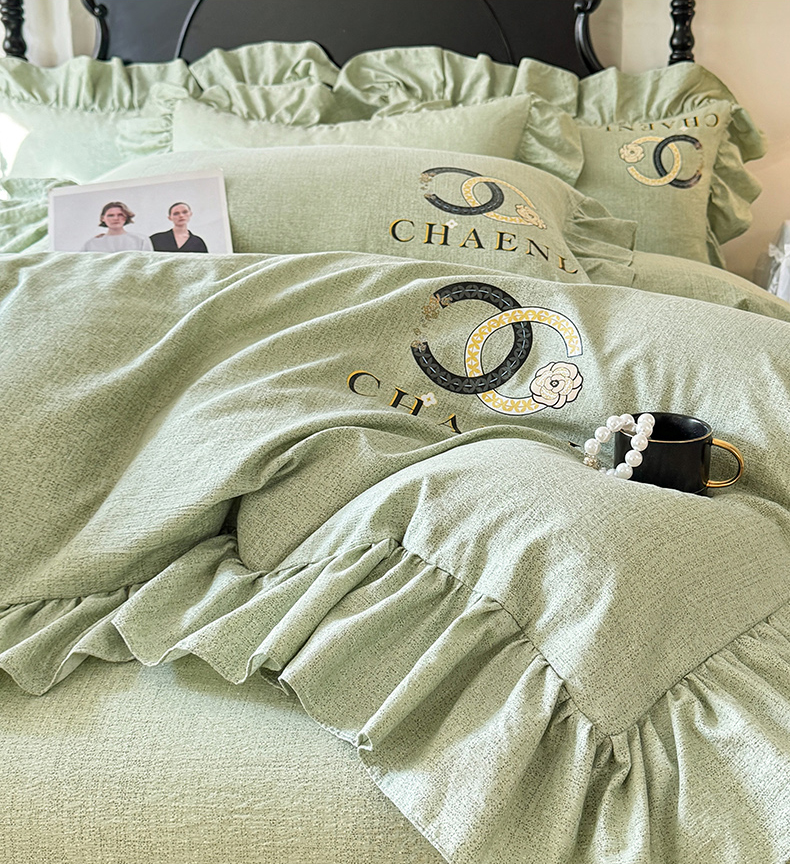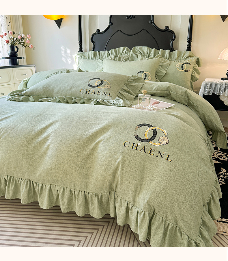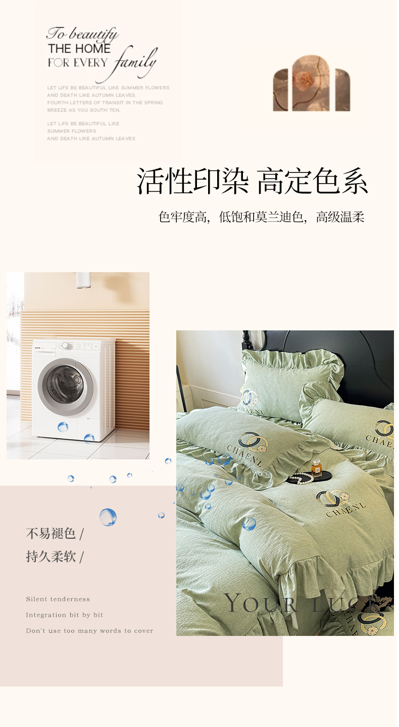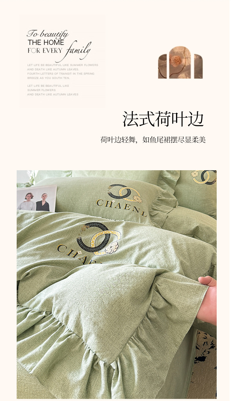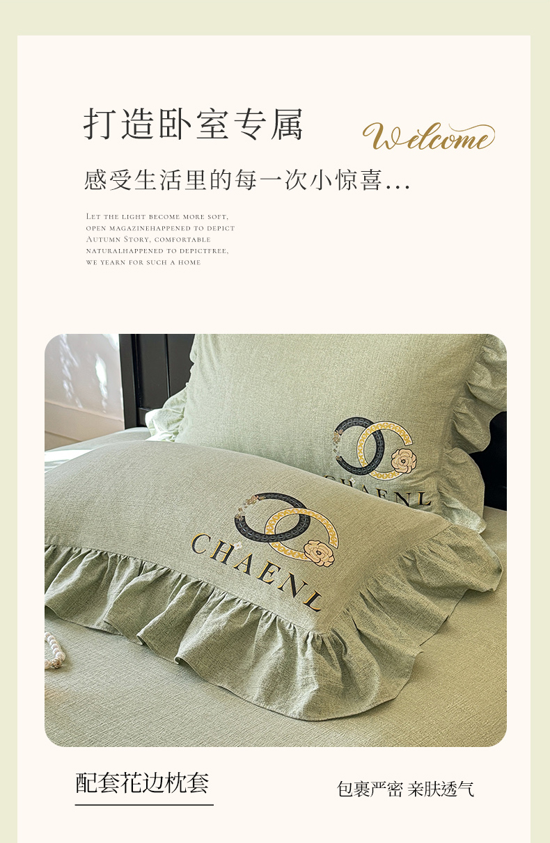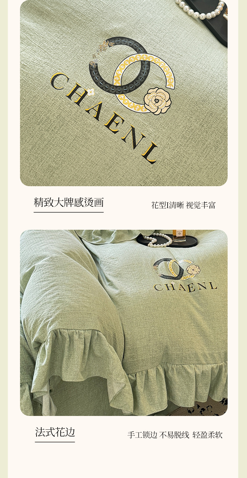 当前位置: 91家纺网 > 商品网购 > 床品套件 > 四件套 > 其它四件套 > 贝凯瑞 2026新款法式轻奢复古仿亚麻木棉皱皱棉双层纱花边四件套-鎏光系列 青榄雅颂