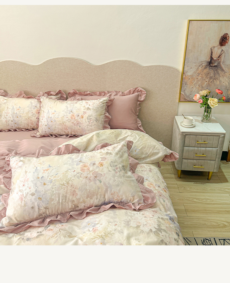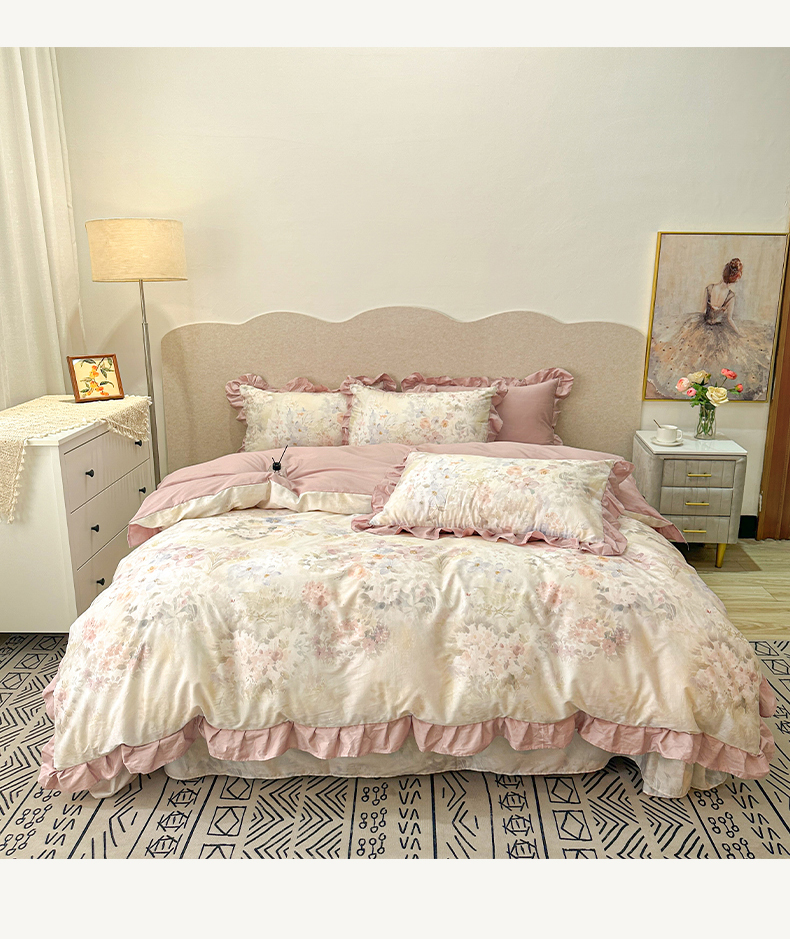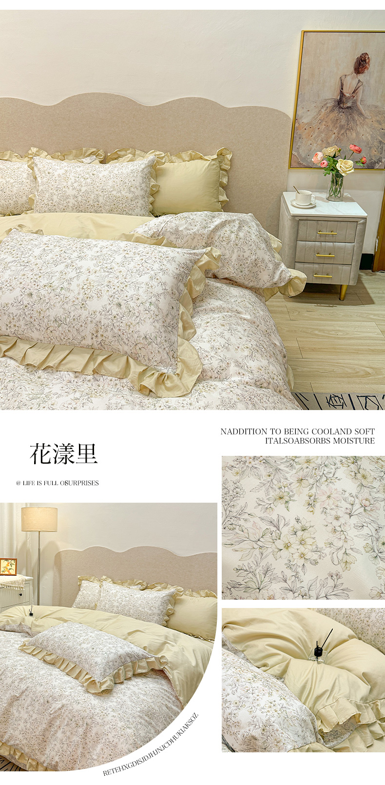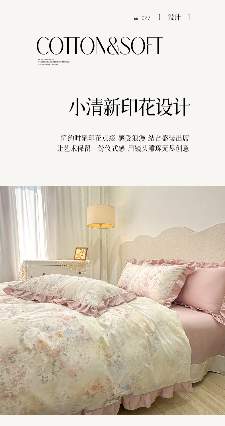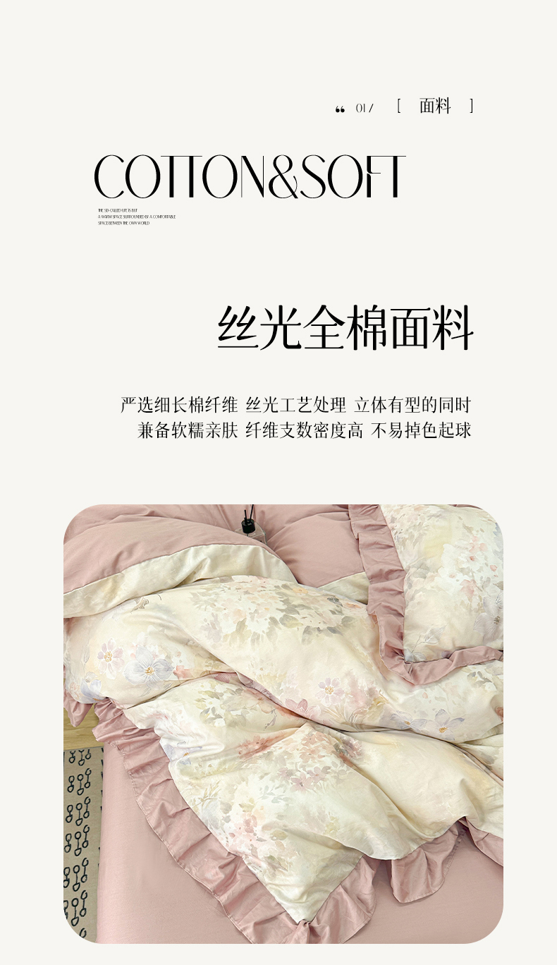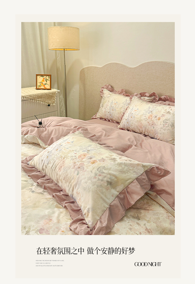 当前位置: 91家纺网 > 商品网购 > 床品套件 > 四件套 > 全棉普通四件套 > 橙艺家居 2026新款丝光全棉纯棉印花花边四件套-爱丽丝柔棉 严格控价,券后、活动后标准不得低于248元,以此类推。 花影里