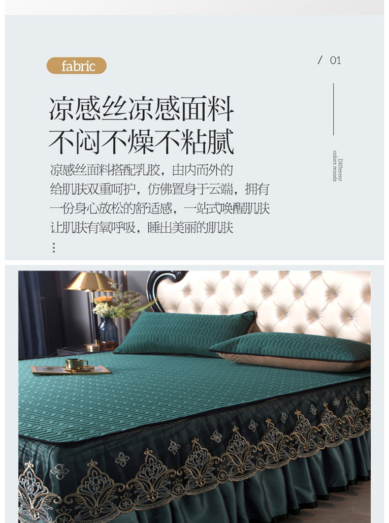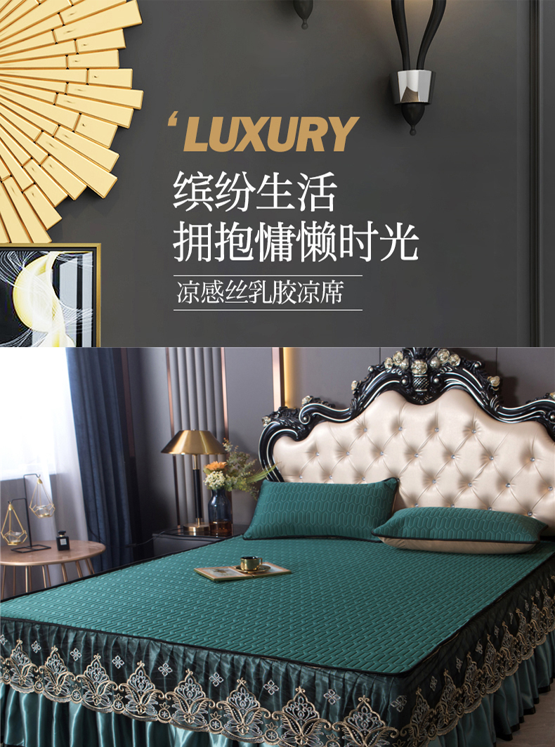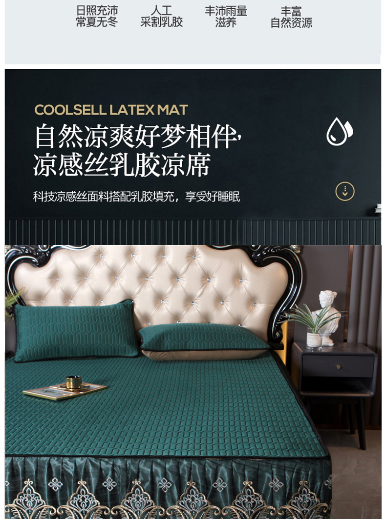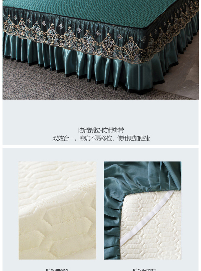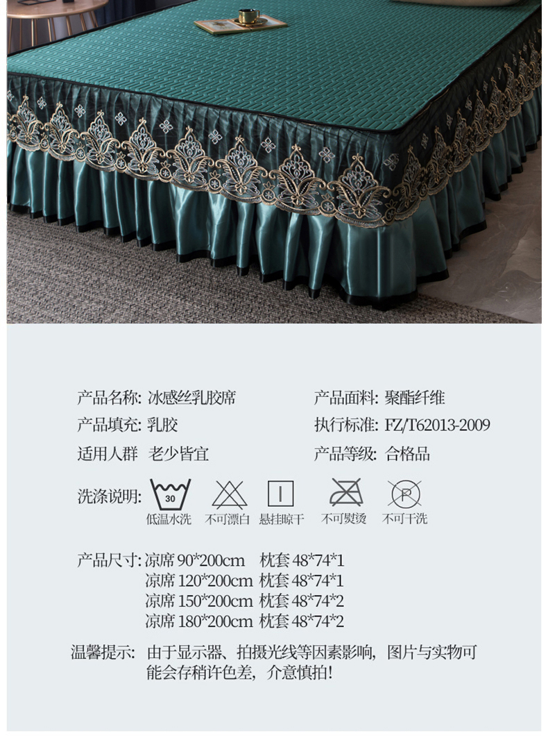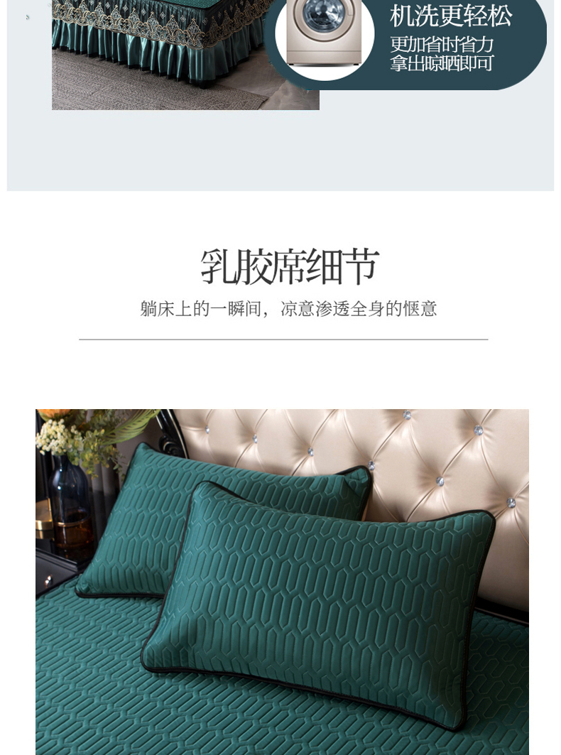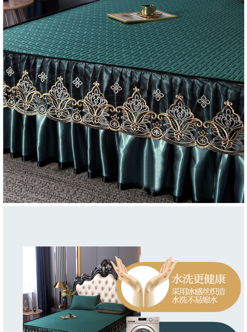 商品名称:能好家纺 2026春夏新款纯色+印花凉感丝乳胶凉席床裙款三件套 墨绿