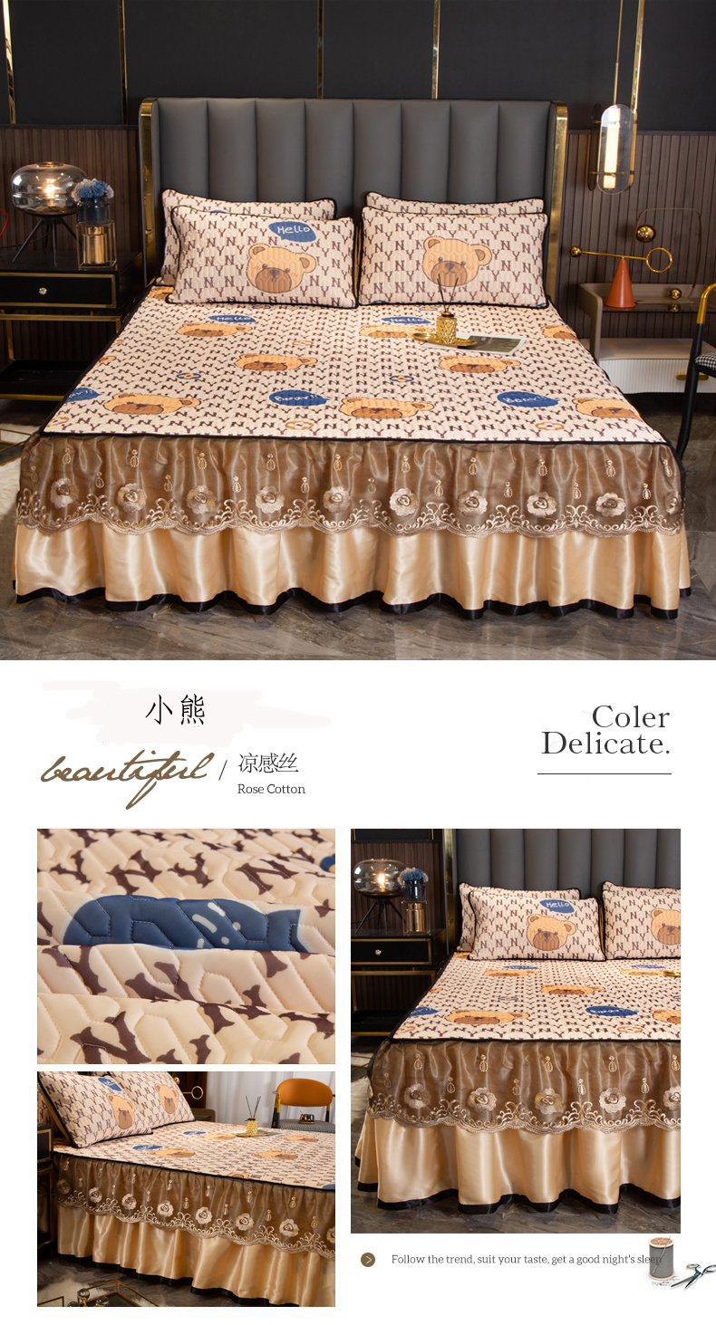 (总)能好家纺 2026春夏新款纯色+印花凉感丝乳胶凉席床裙款三件套,薄荷绿,豆沙,灰色,酒红,孔雀蓝,墨绿,雪青,棕色,古韵,小熊,雅韵,幽梦